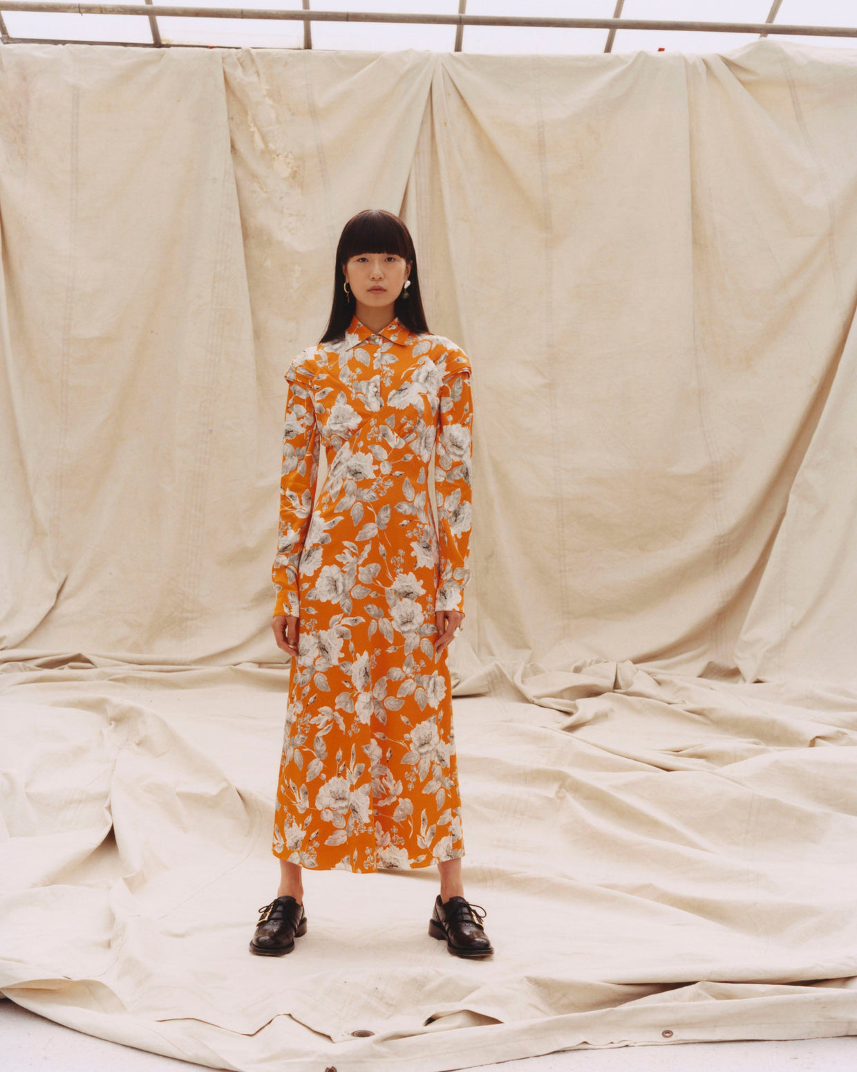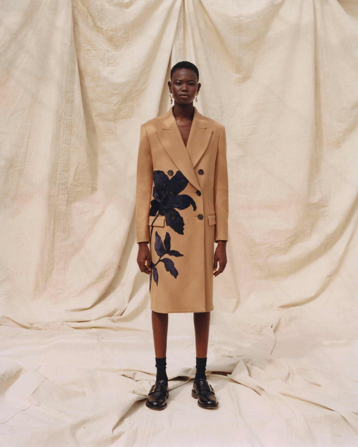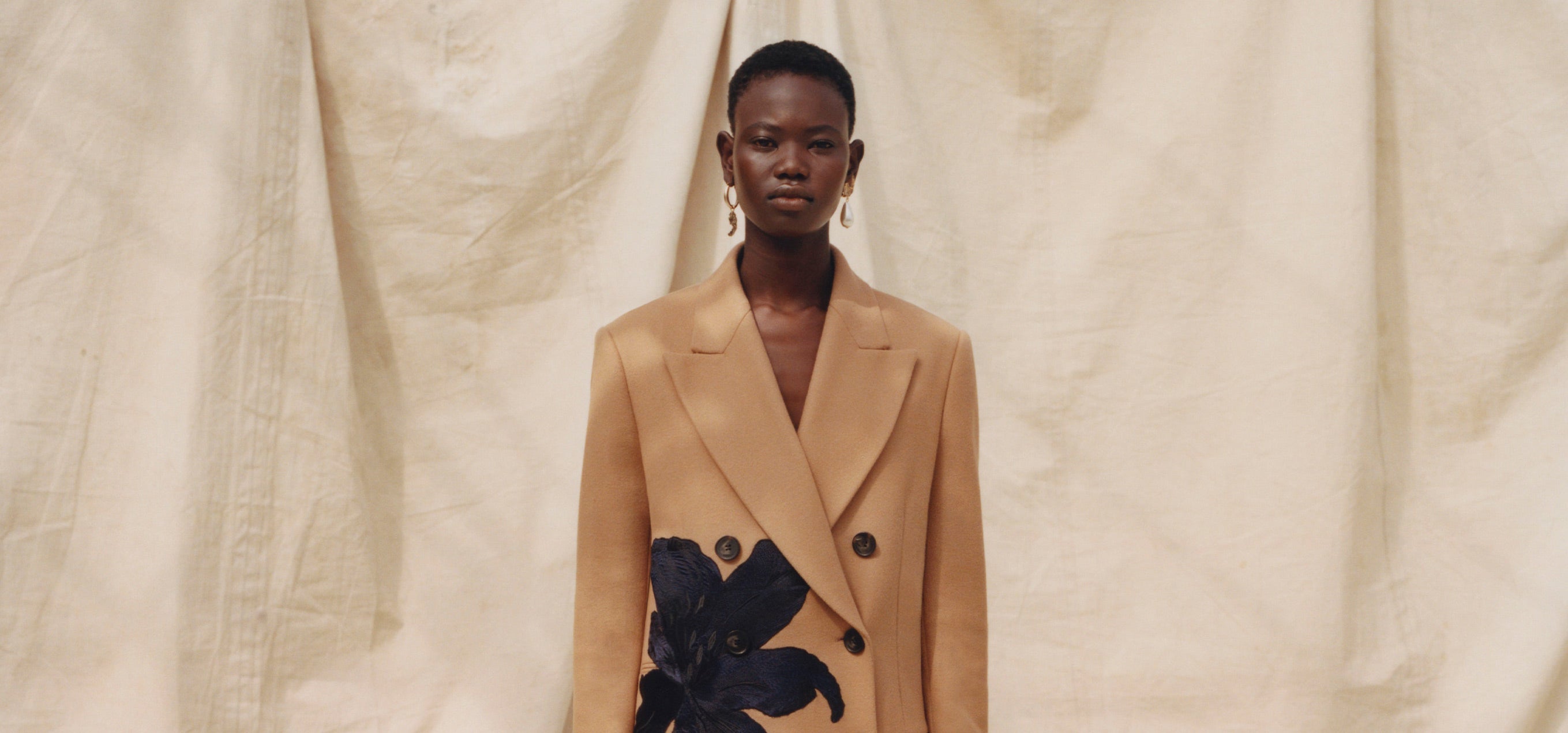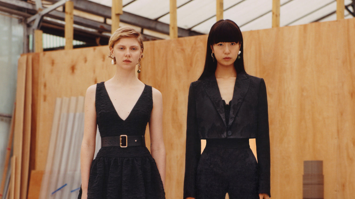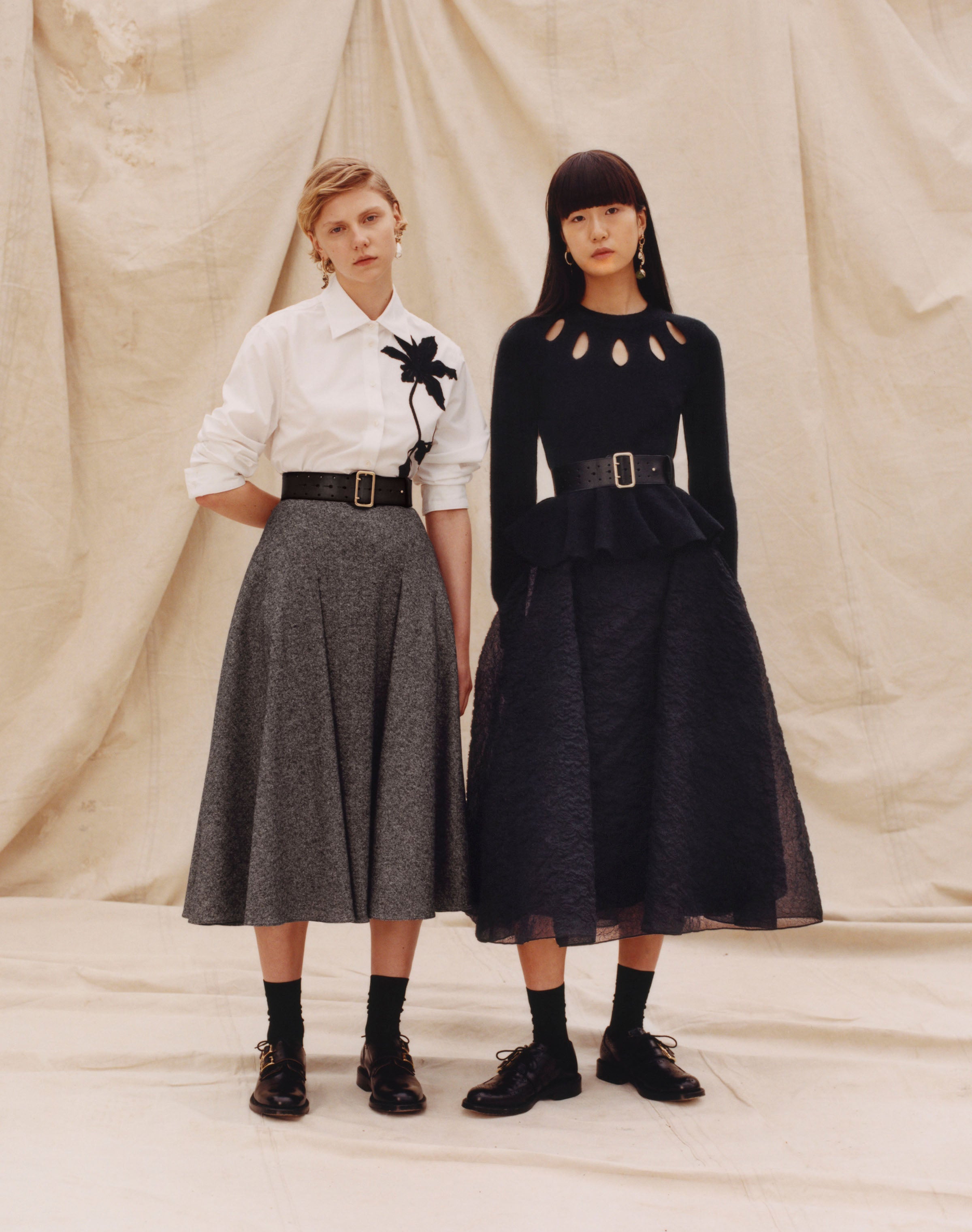 Within a range of 1950s silhouettes we find utilitarian fabrics and cuts with surprising moments of couture volume and craftsmanship. Bold florals appear starkly embroidered on cashmere coats and as foreground or background prints onvarious gowns and skirts.