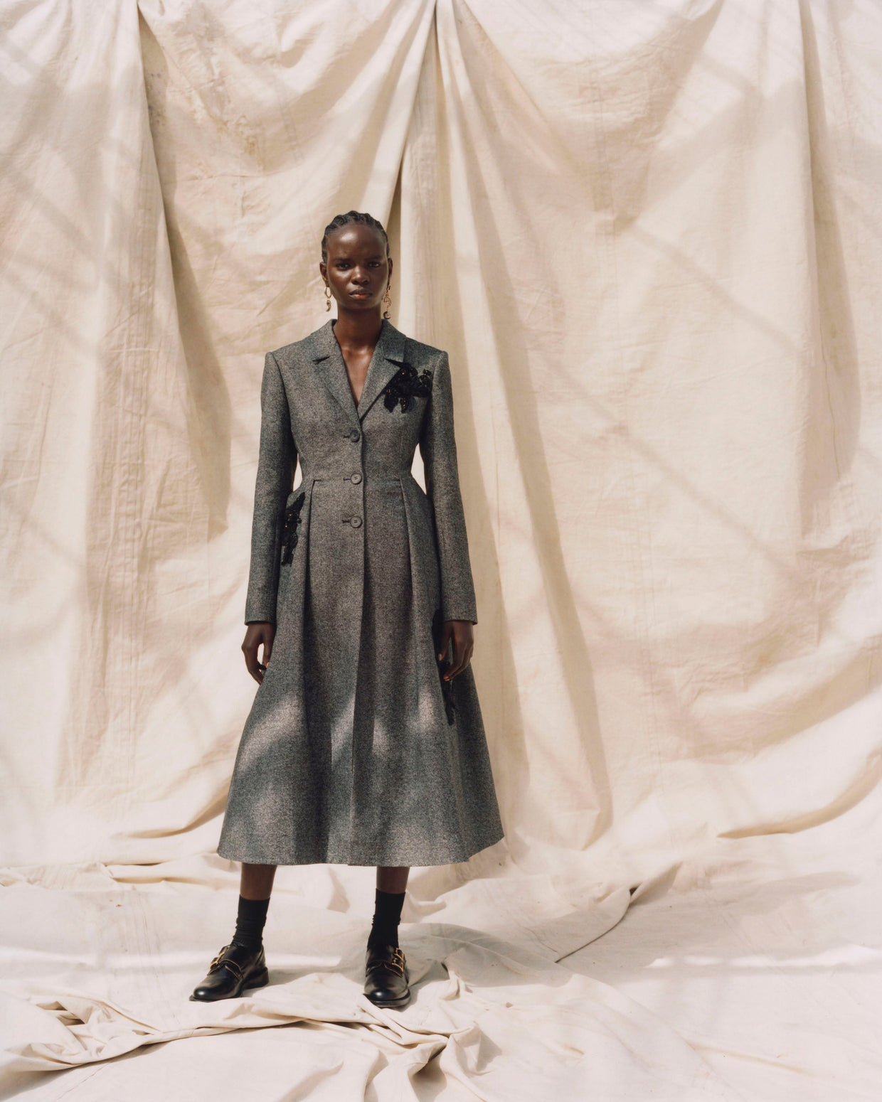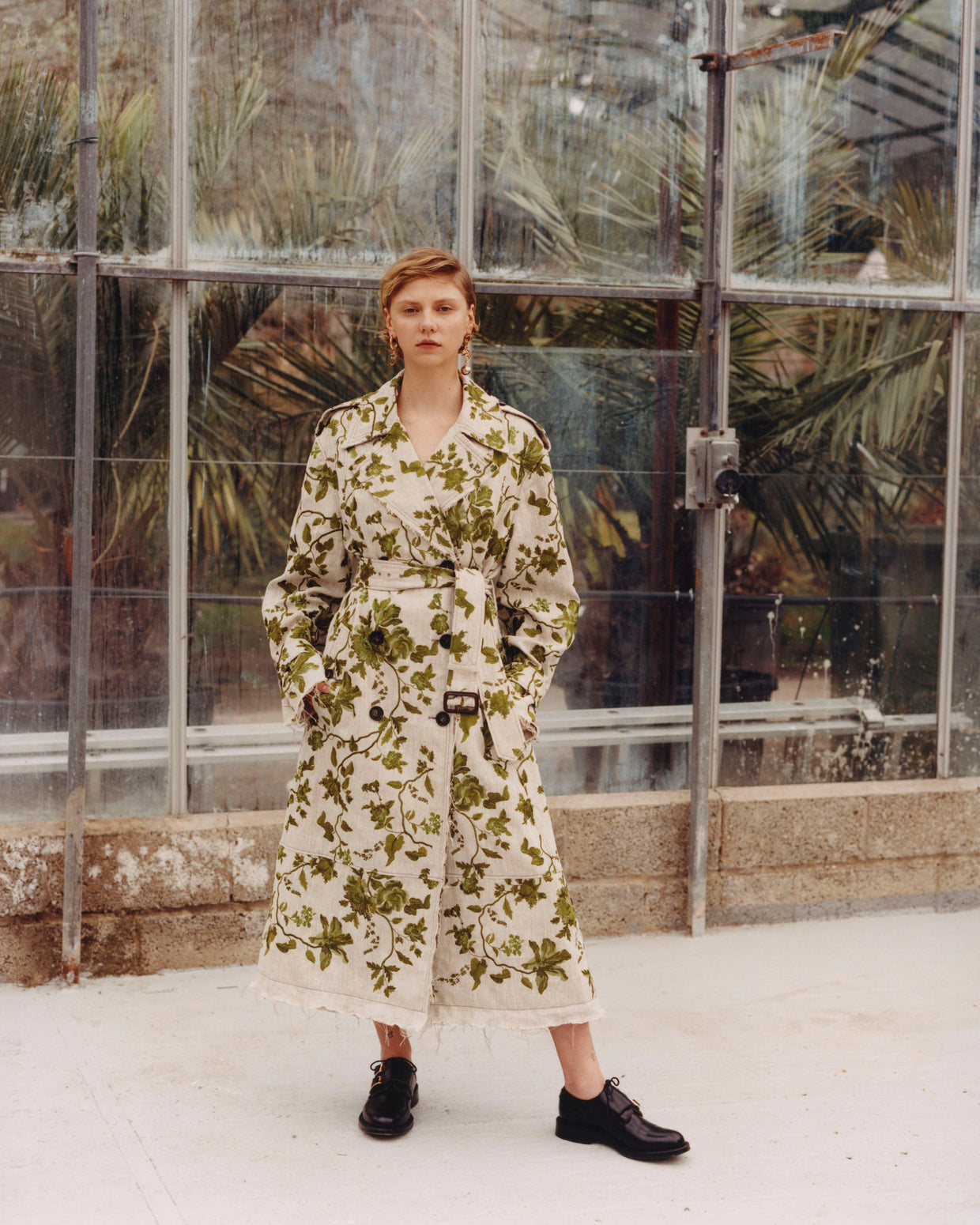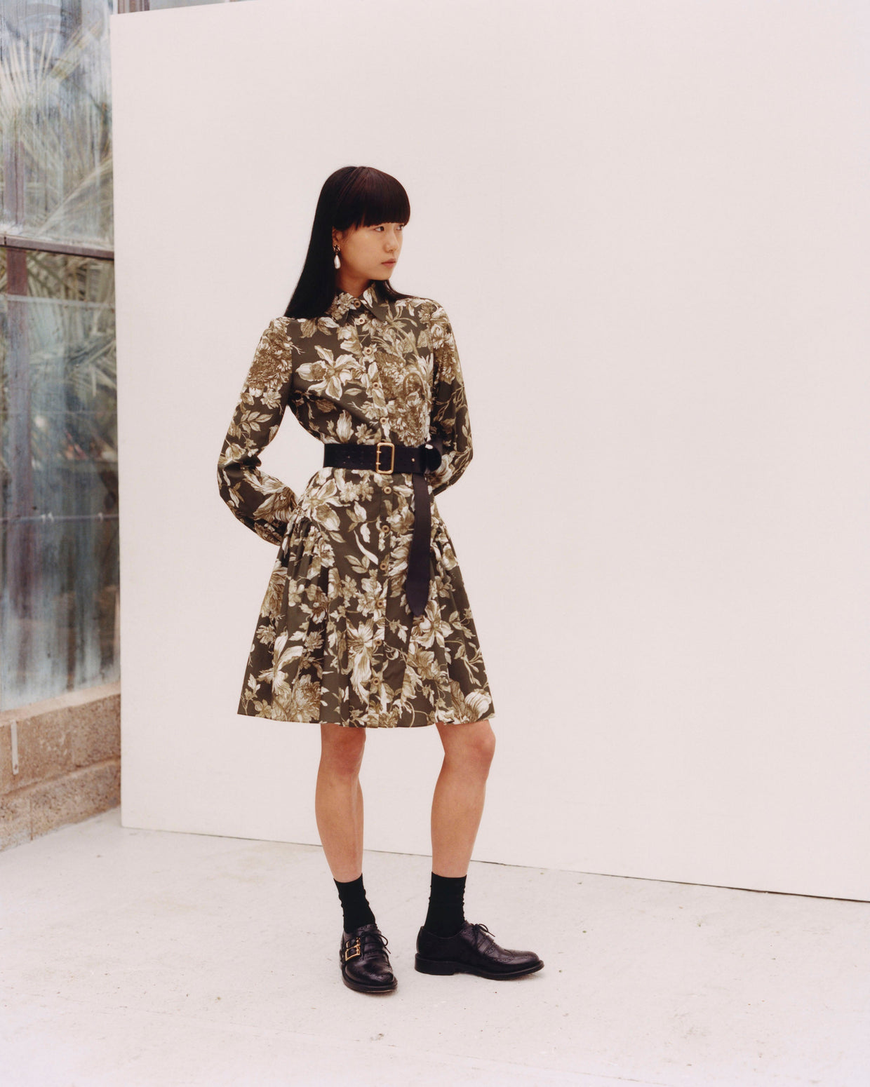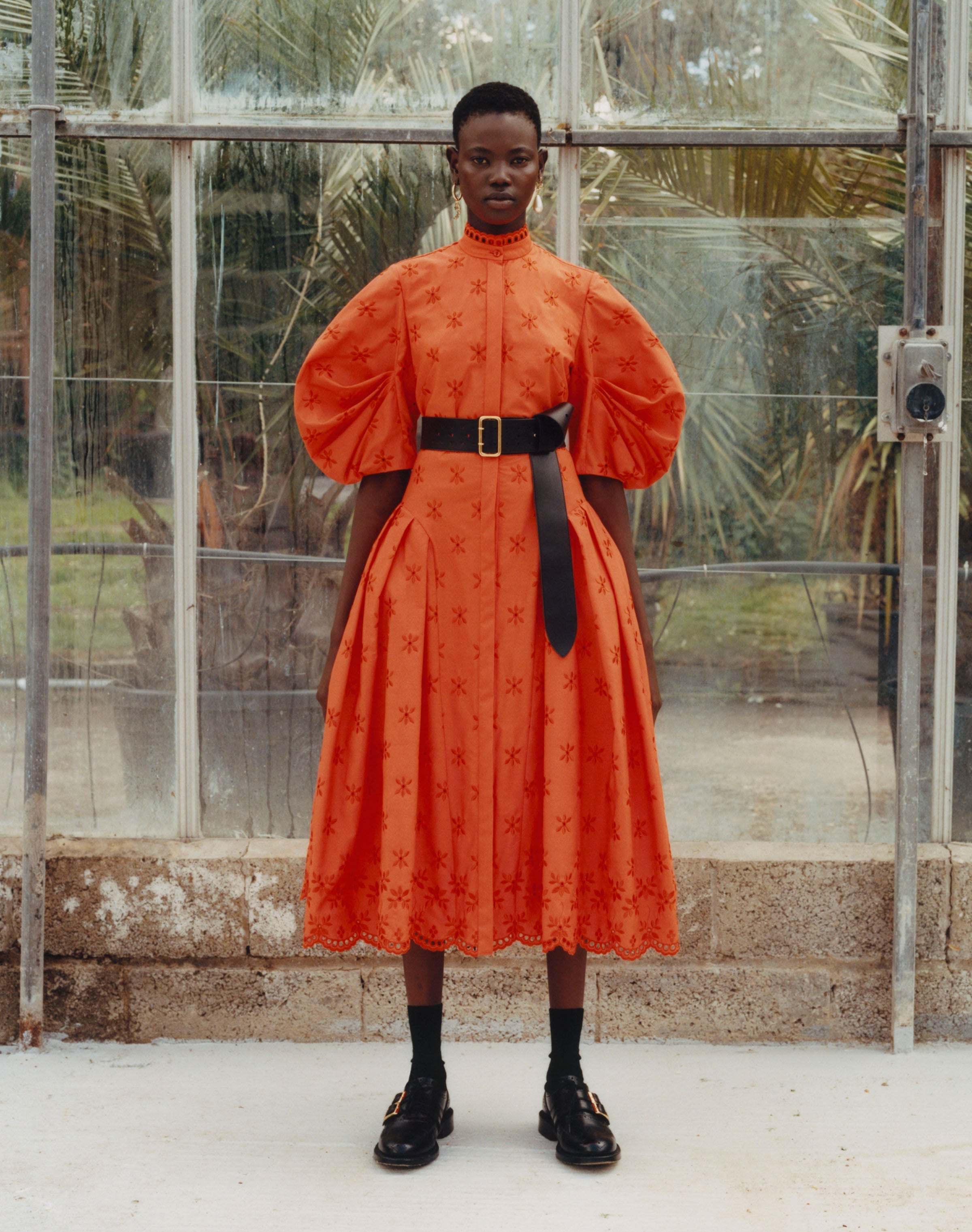 Within a range of 1950s silhouettes we find utilitarian fabrics and cuts with surprising moments of couture volume and craftsmanship. Bold florals appear starkly embroidered on cashmere coats and as foreground or background prints onvarious gowns and skirts.