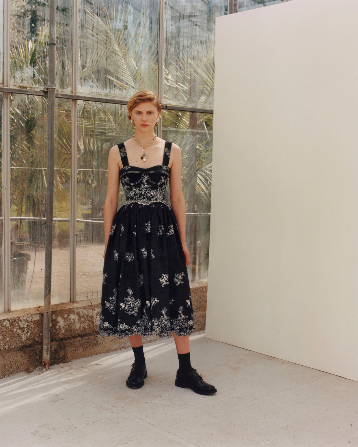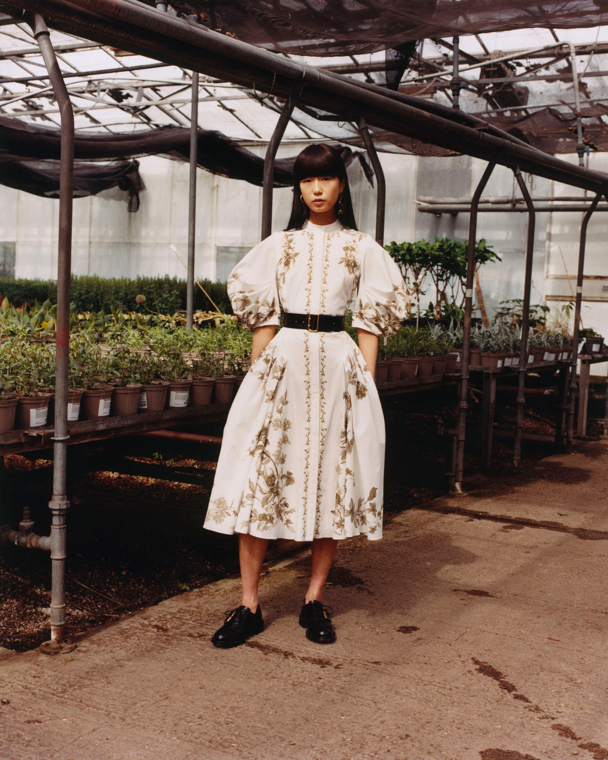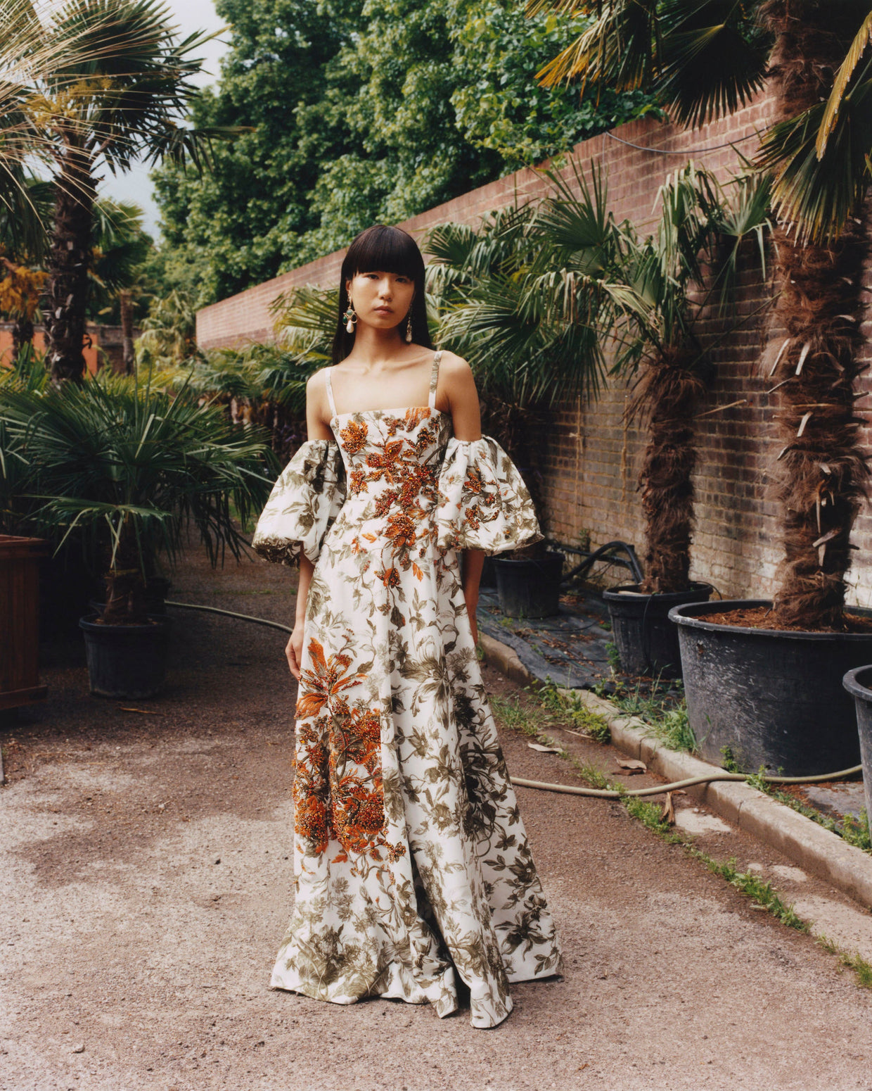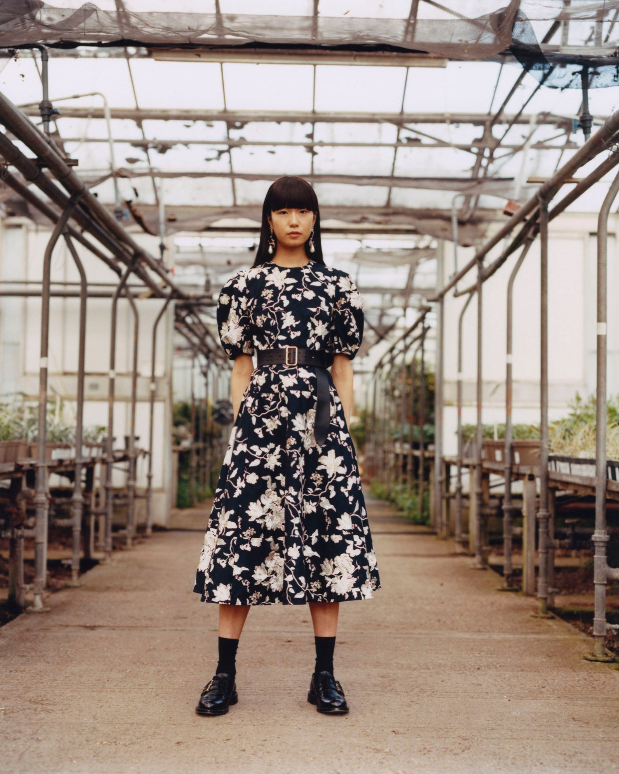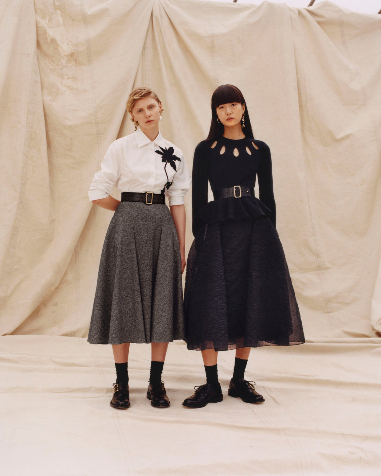 Within a range of 1950s silhouettes we find utilitarian fabrics and cuts with surprising moments of couture volume and craftsmanship. Bold florals appear starkly embroidered on cashmere coats and as foreground or background prints onvarious gowns and skirts.