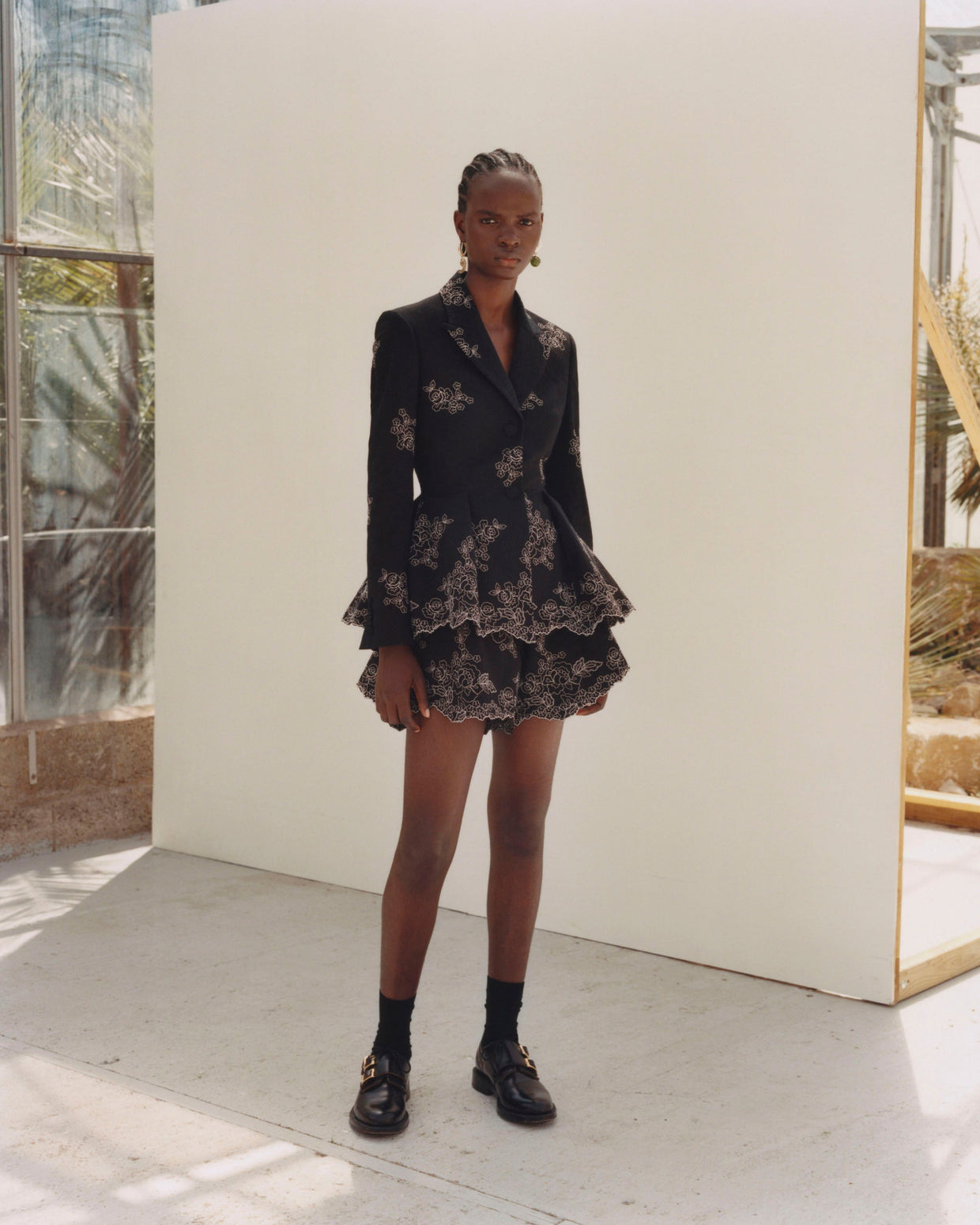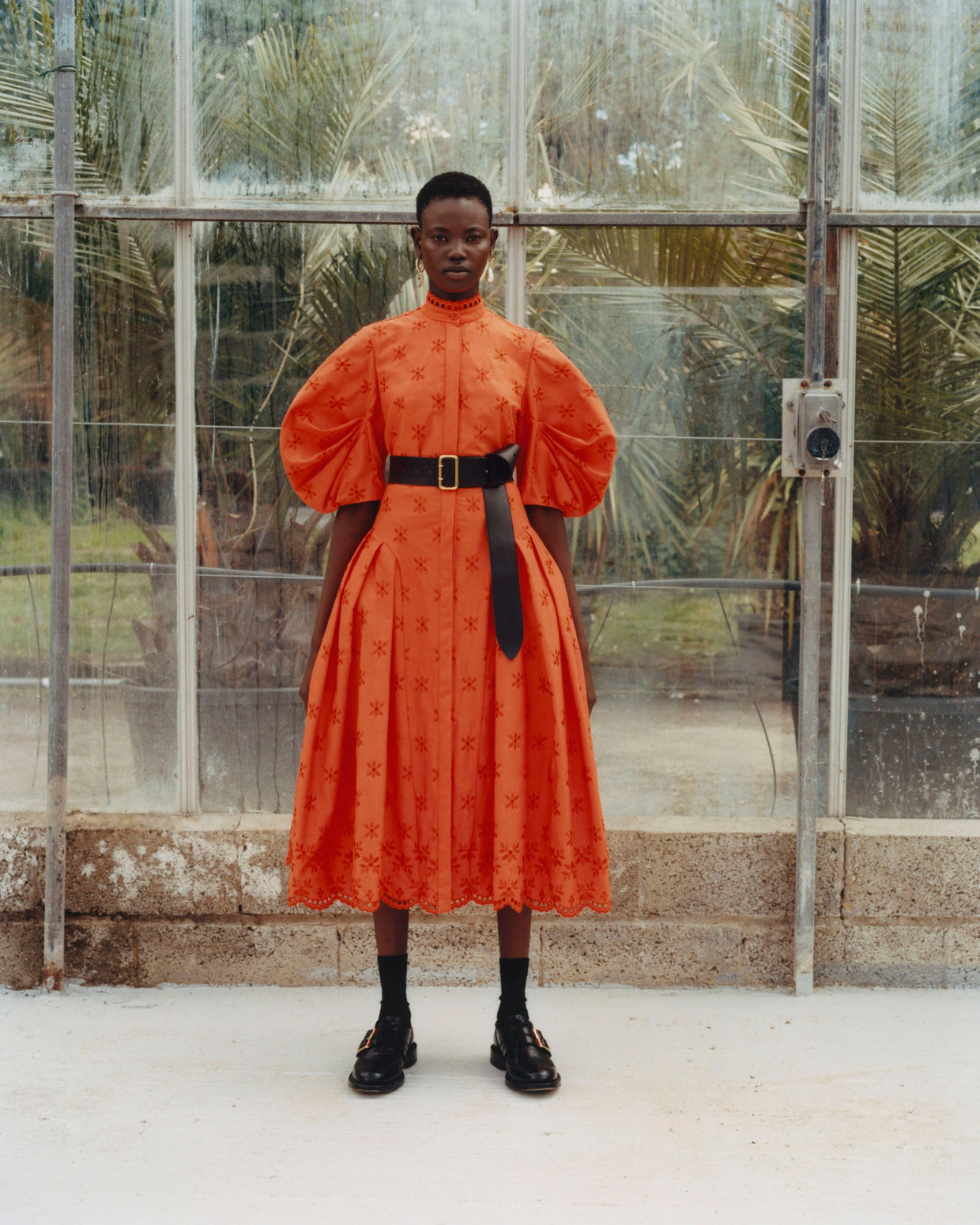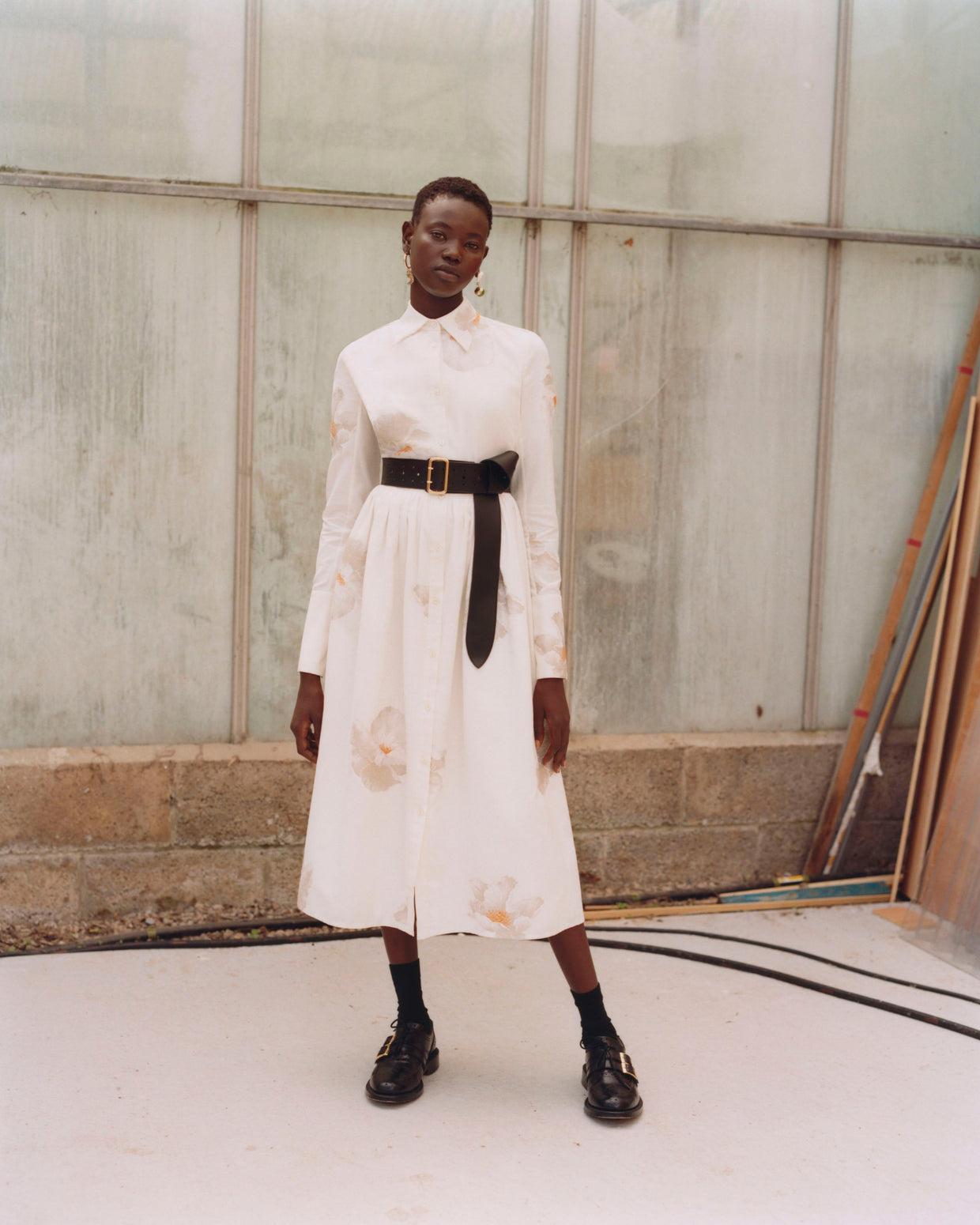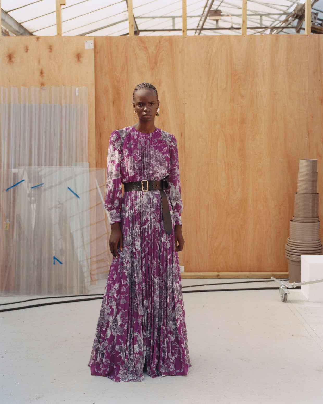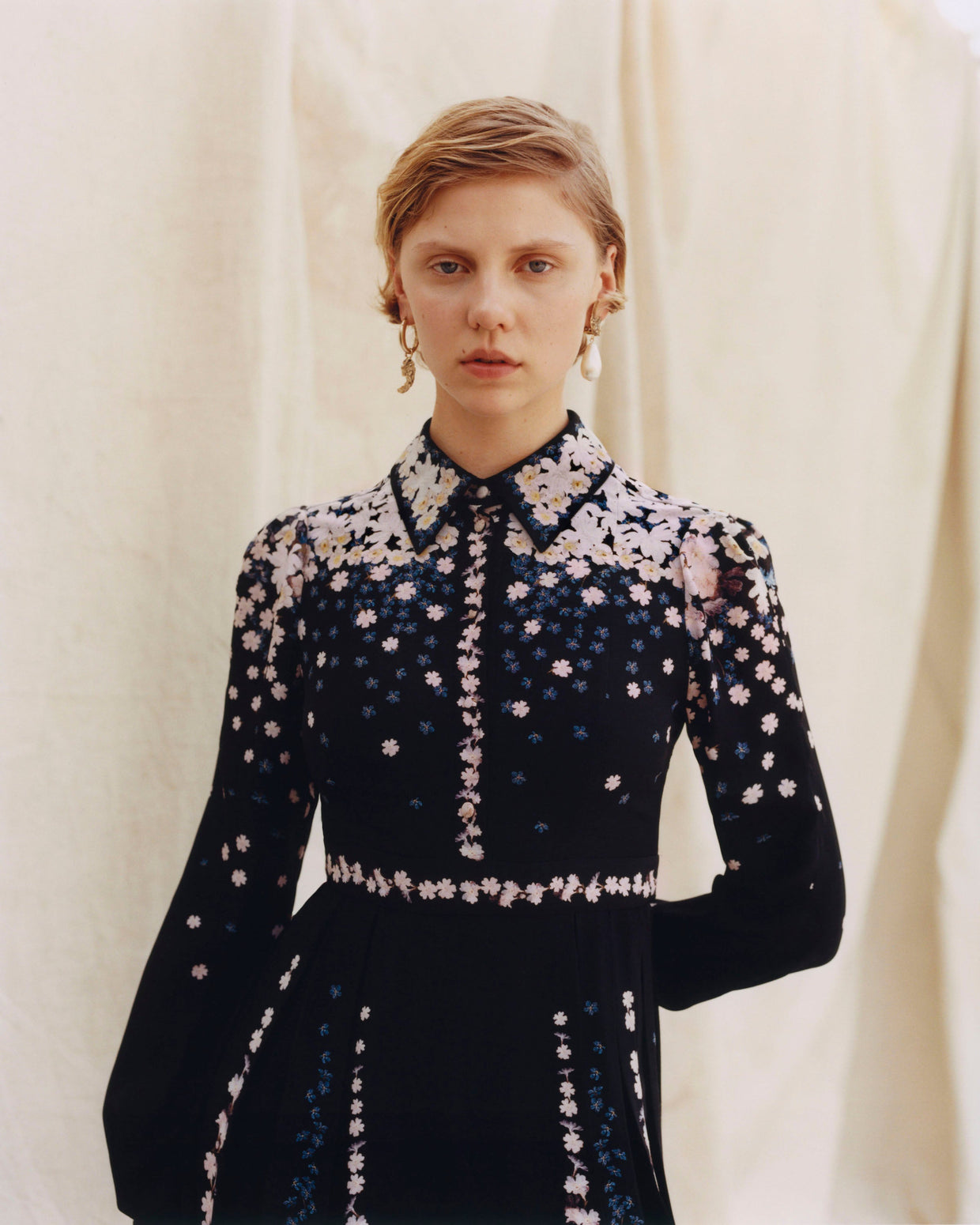 Within a range of 1950s silhouettes we find utilitarian fabrics and cuts with surprising moments of couture volume and craftsmanship. Bold florals appear starkly embroidered on cashmere coats and as foreground or background prints onvarious gowns and skirts.