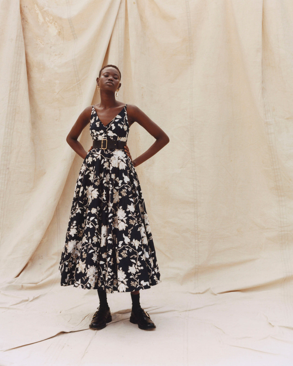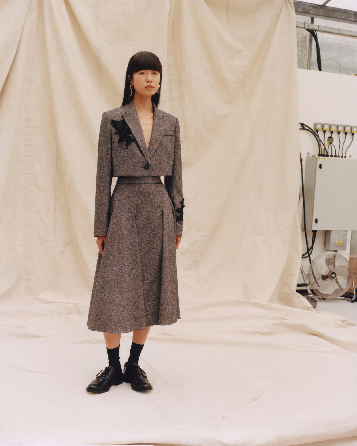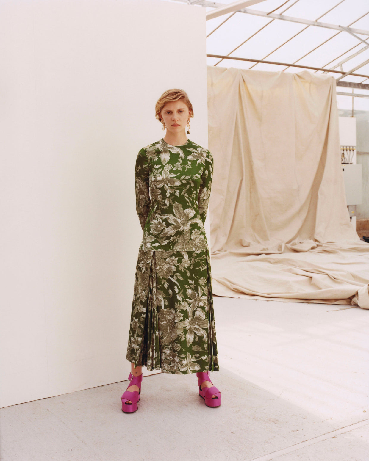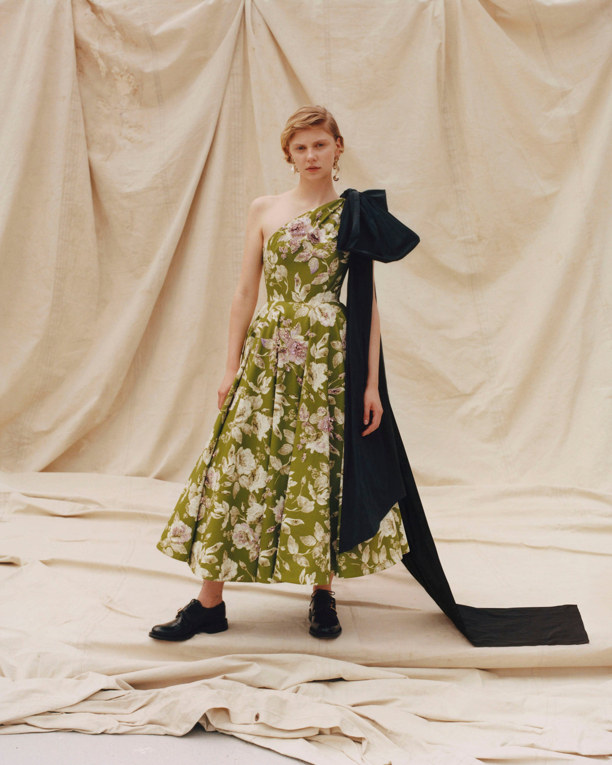 Within a range of 1950s silhouettes we find utilitarian fabrics and cuts with surprising moments of couture volume and craftsmanship. Bold florals appear starkly embroidered on cashmere coats and as foreground or background prints onvarious gowns and skirts.