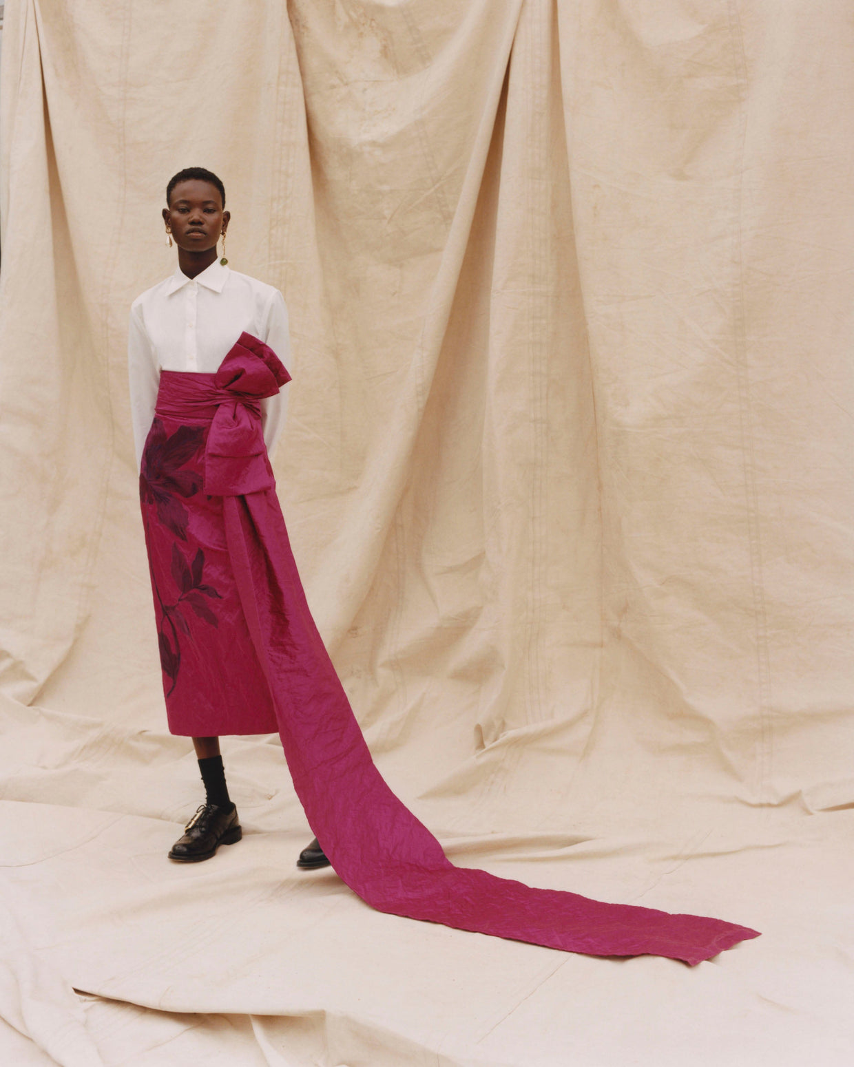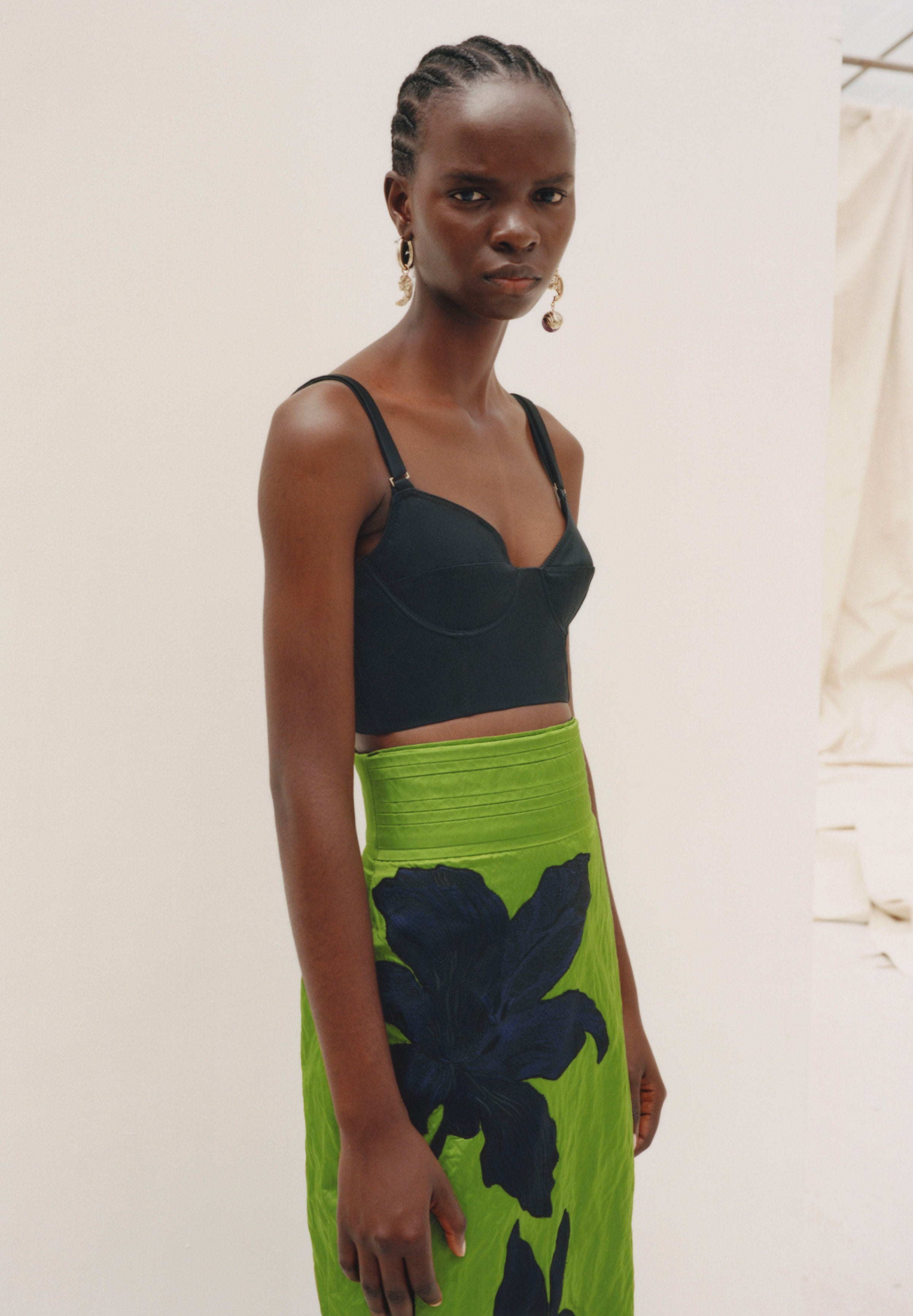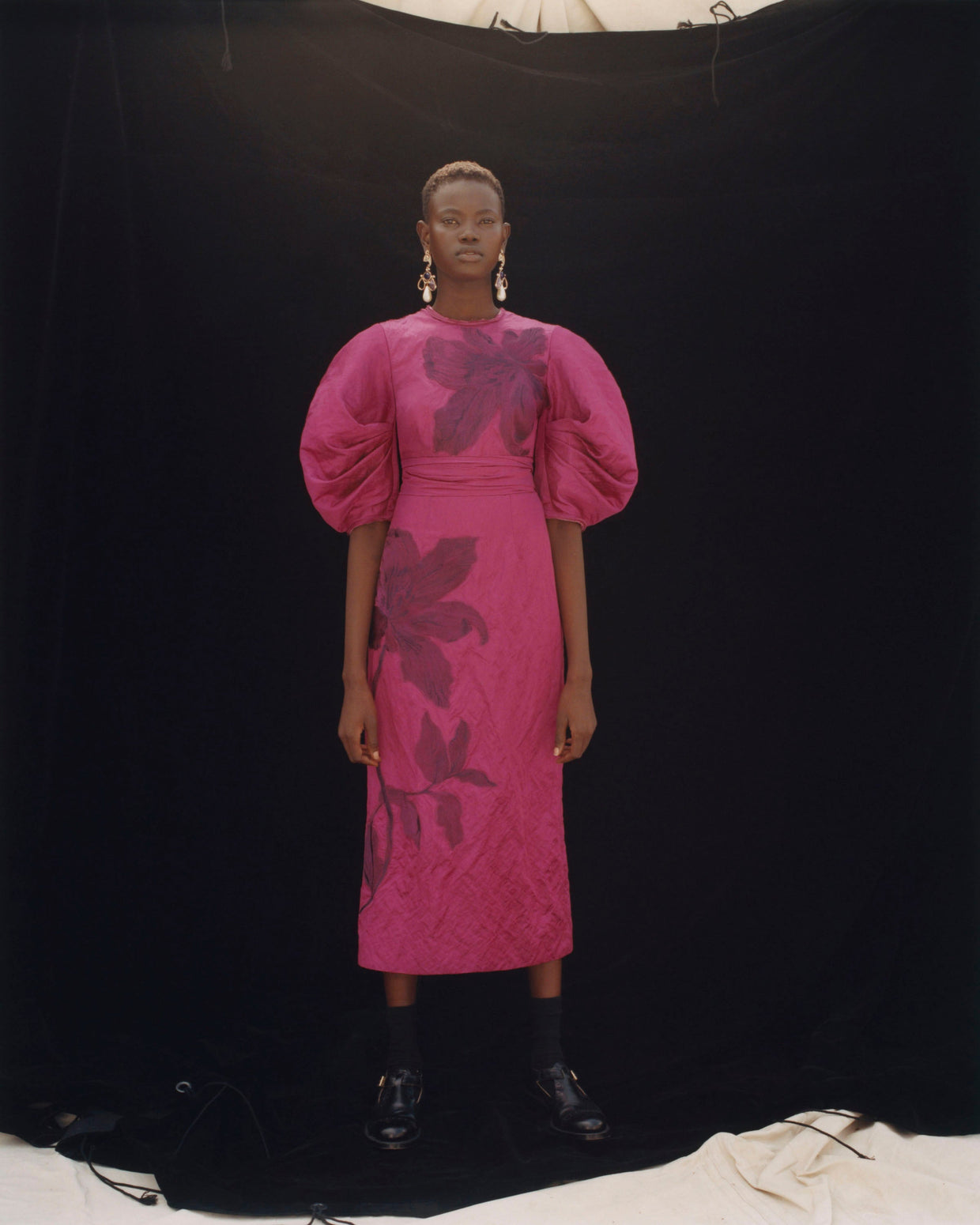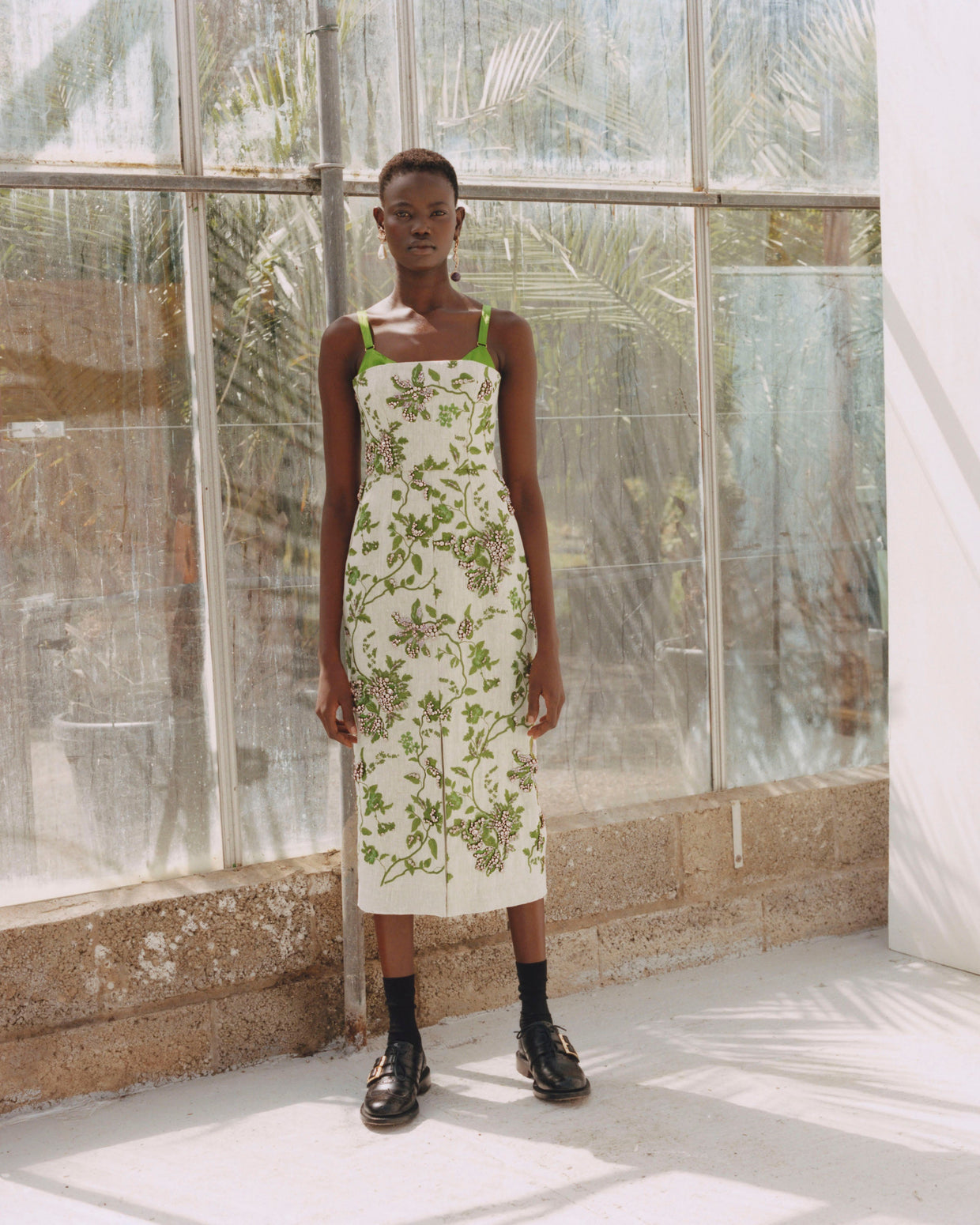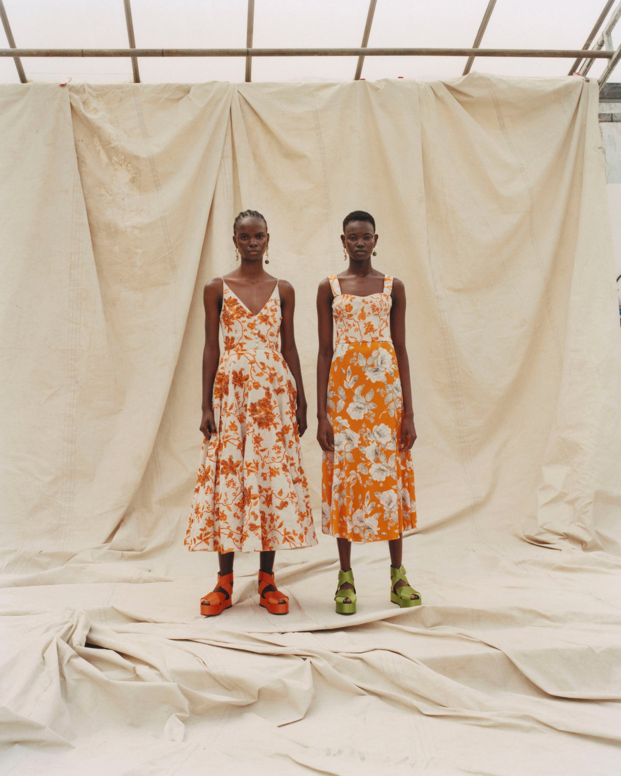 Within a range of 1950s silhouettes we find utilitarian fabrics and cuts with surprising moments of couture volume and craftsmanship. Bold florals appear starkly embroidered on cashmere coats and as foreground or background prints onvarious gowns and skirts.