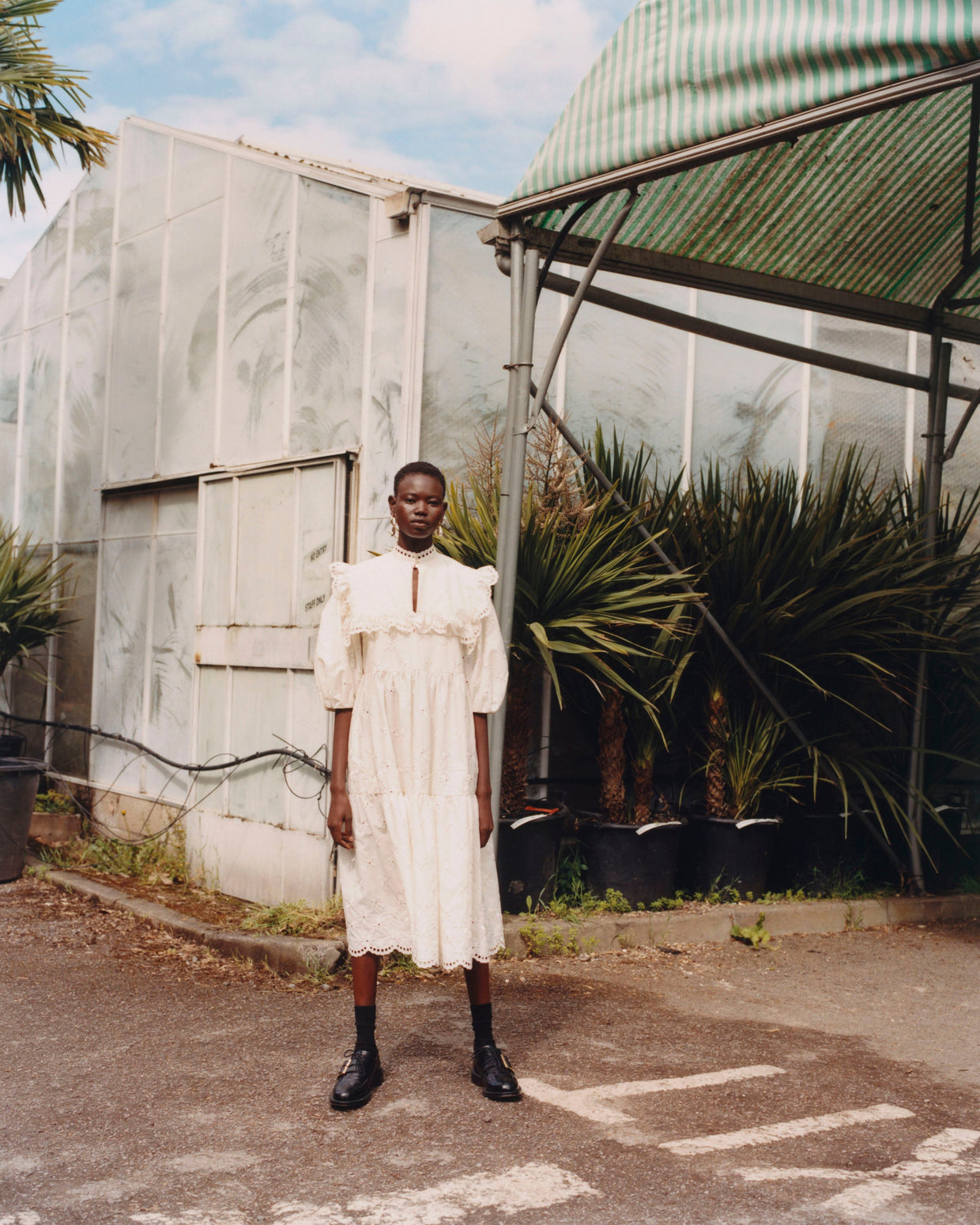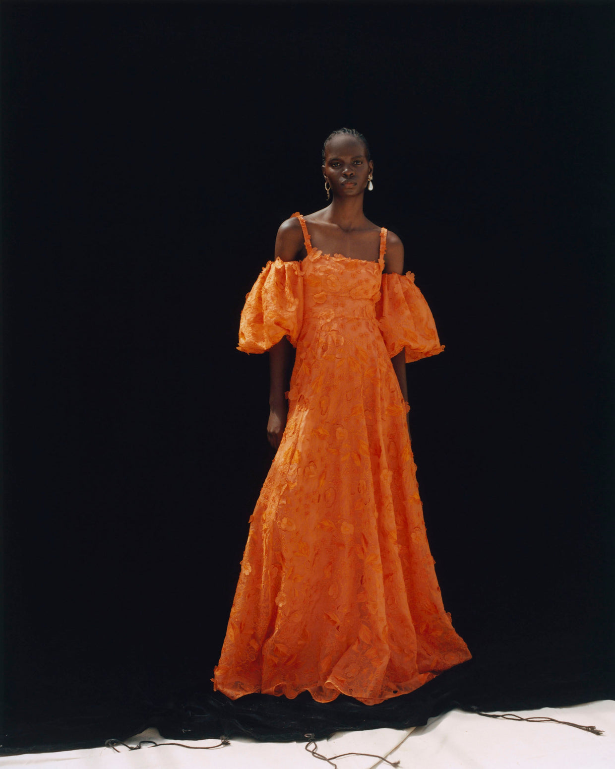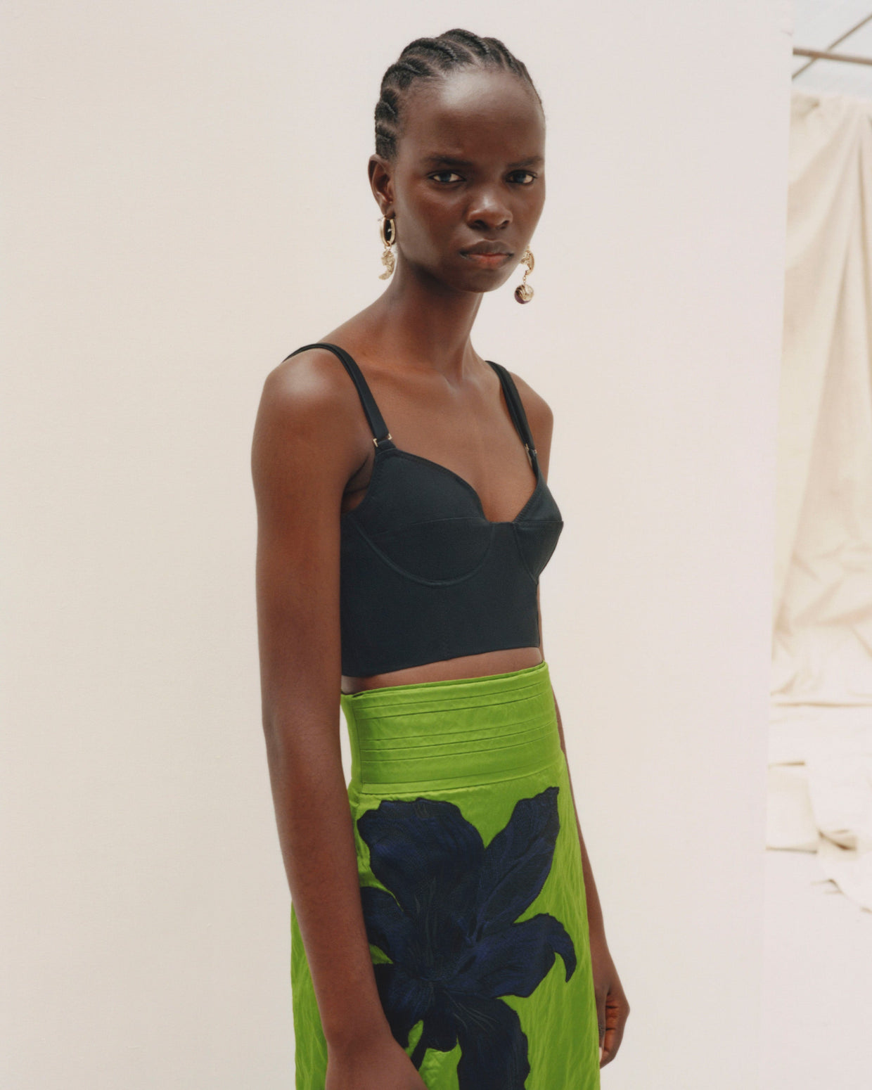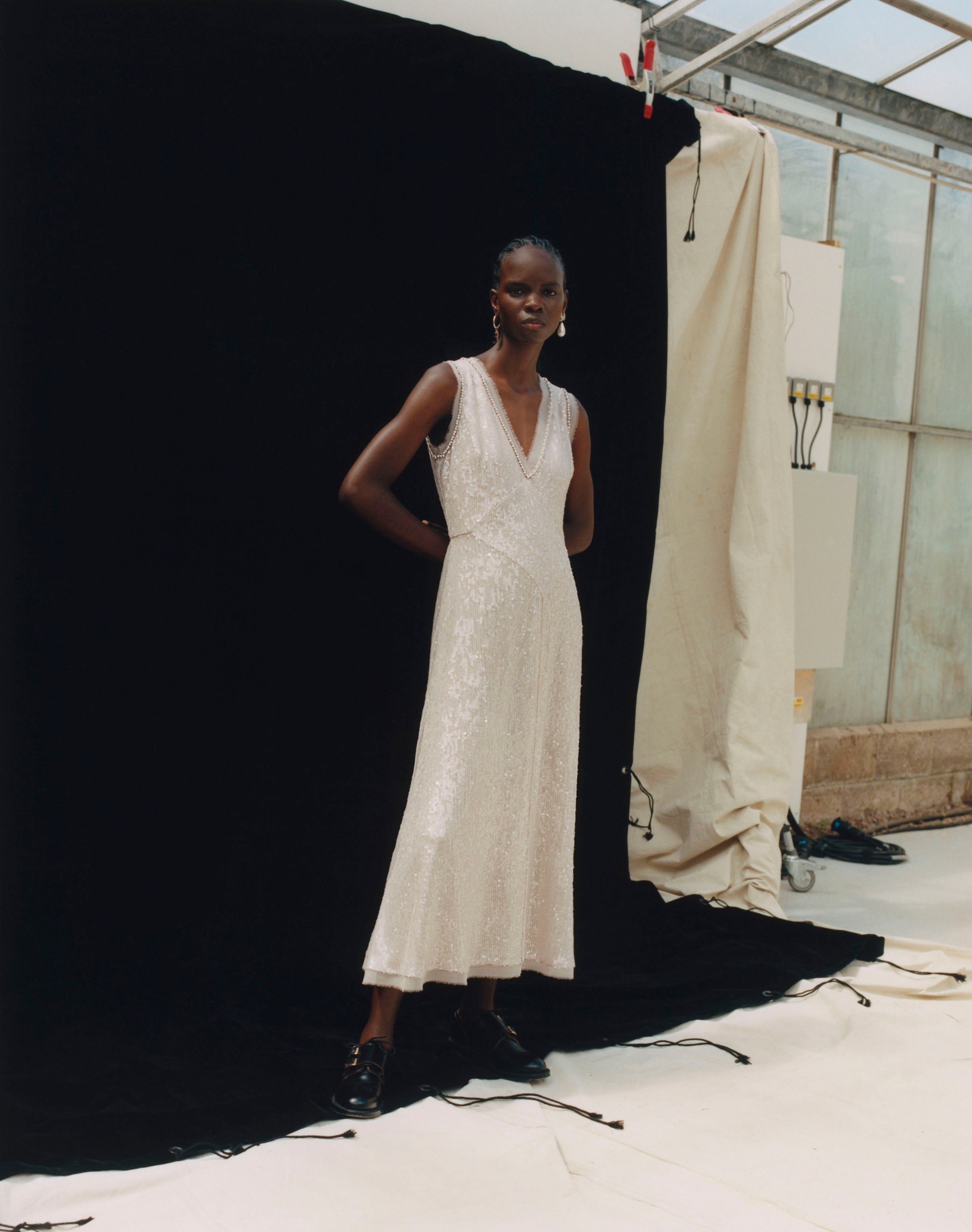 Within a range of 1950s silhouettes we find utilitarian fabrics and cuts with surprising moments of couture volume and craftsmanship. Bold florals appear starkly embroidered on cashmere coats and as foreground or background prints onvarious gowns and skirts.