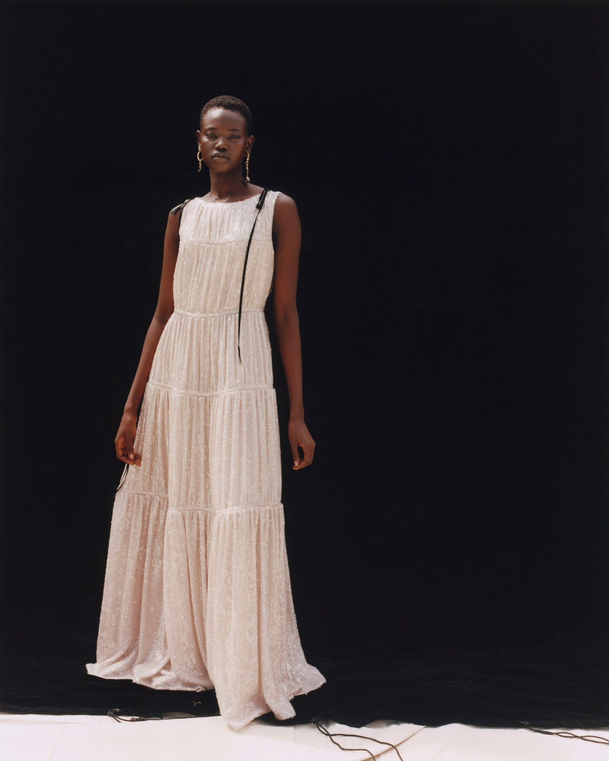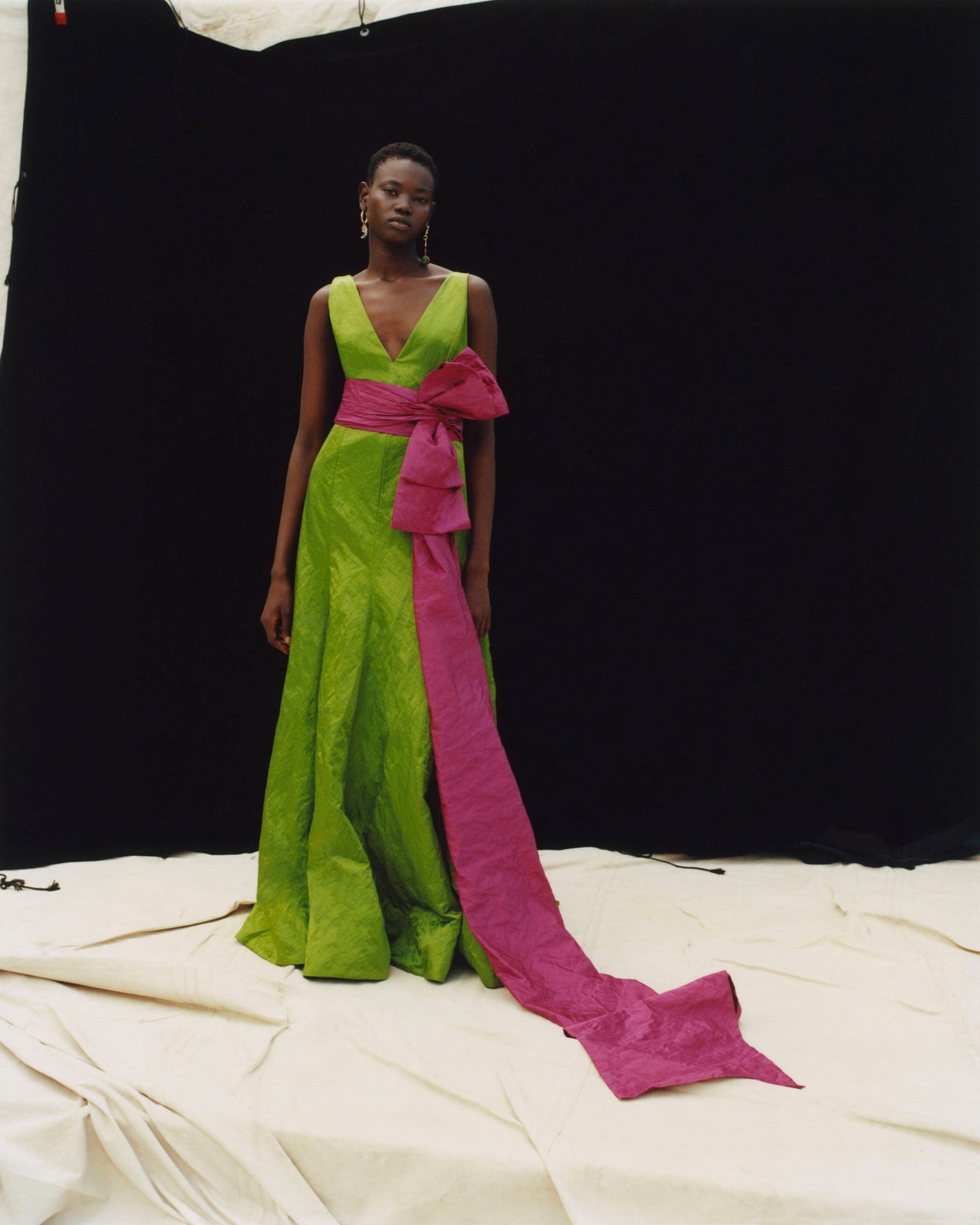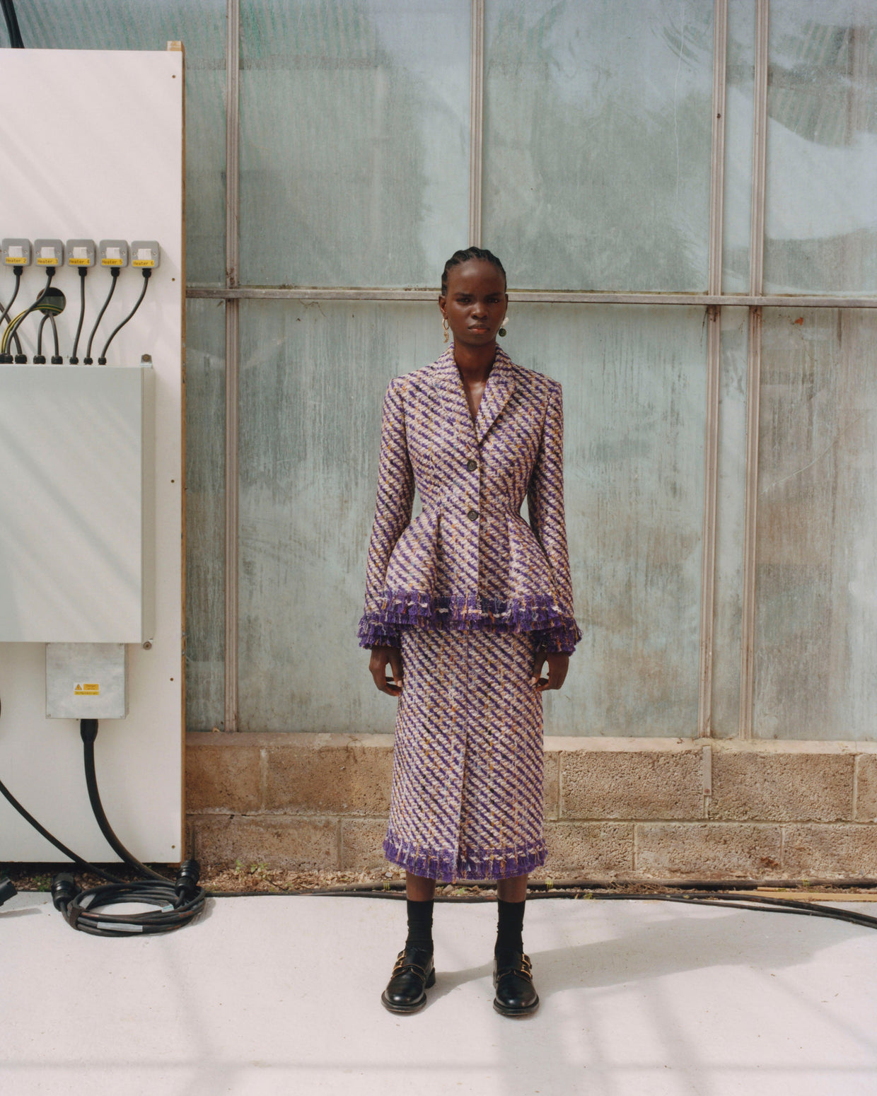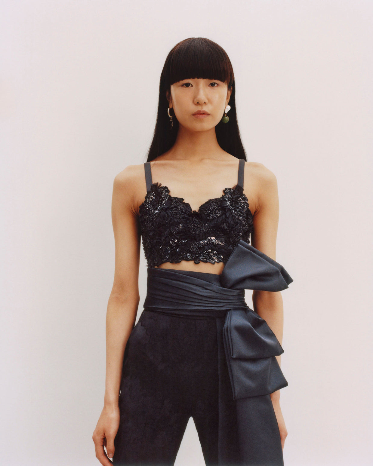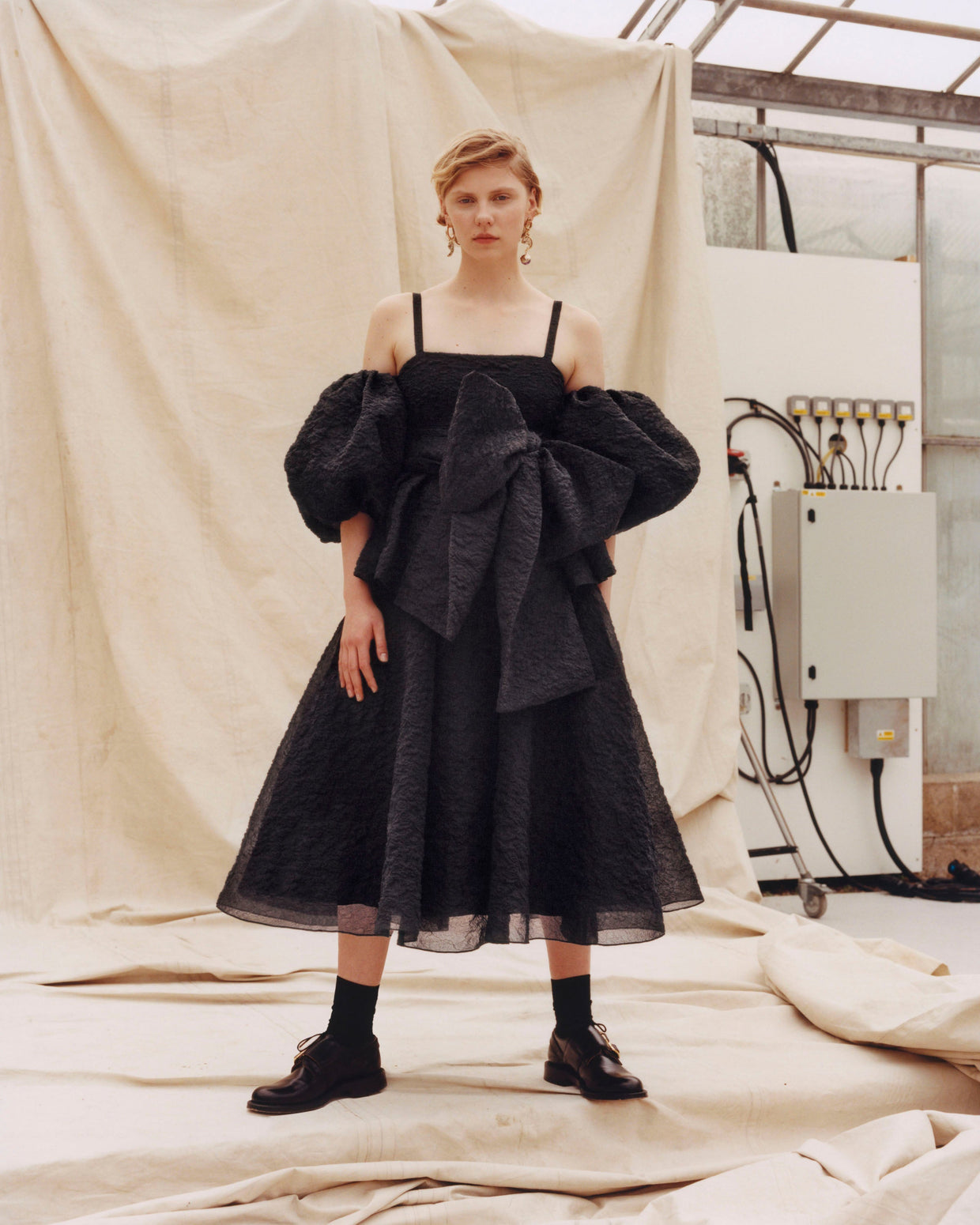 Within a range of 1950s silhouettes we find utilitarian fabrics and cuts with surprising moments of couture volume and craftsmanship. Bold florals appear starkly embroidered on cashmere coats and as foreground or background prints onvarious gowns and skirts.