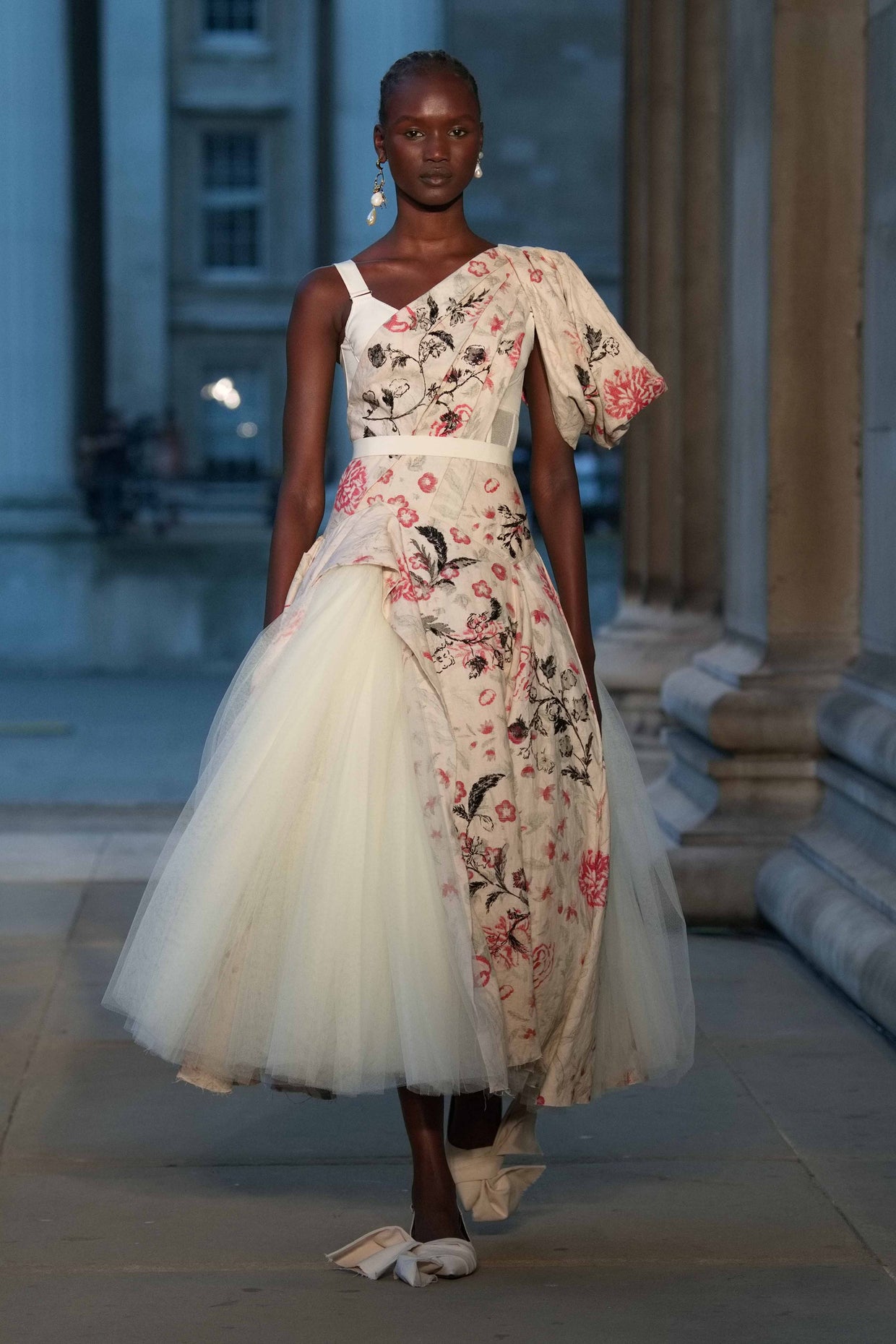 The ERDEM Spring Summer 2024 runway collection is inspired by the late dowager Duchess of Devonshire and Chatsworth House. Remnants of Chatsworth House curtains, hand embroidered by Cecily Lasnet, adorn deconstructed gowns, and fragments of antique textiles from Chatsworth are