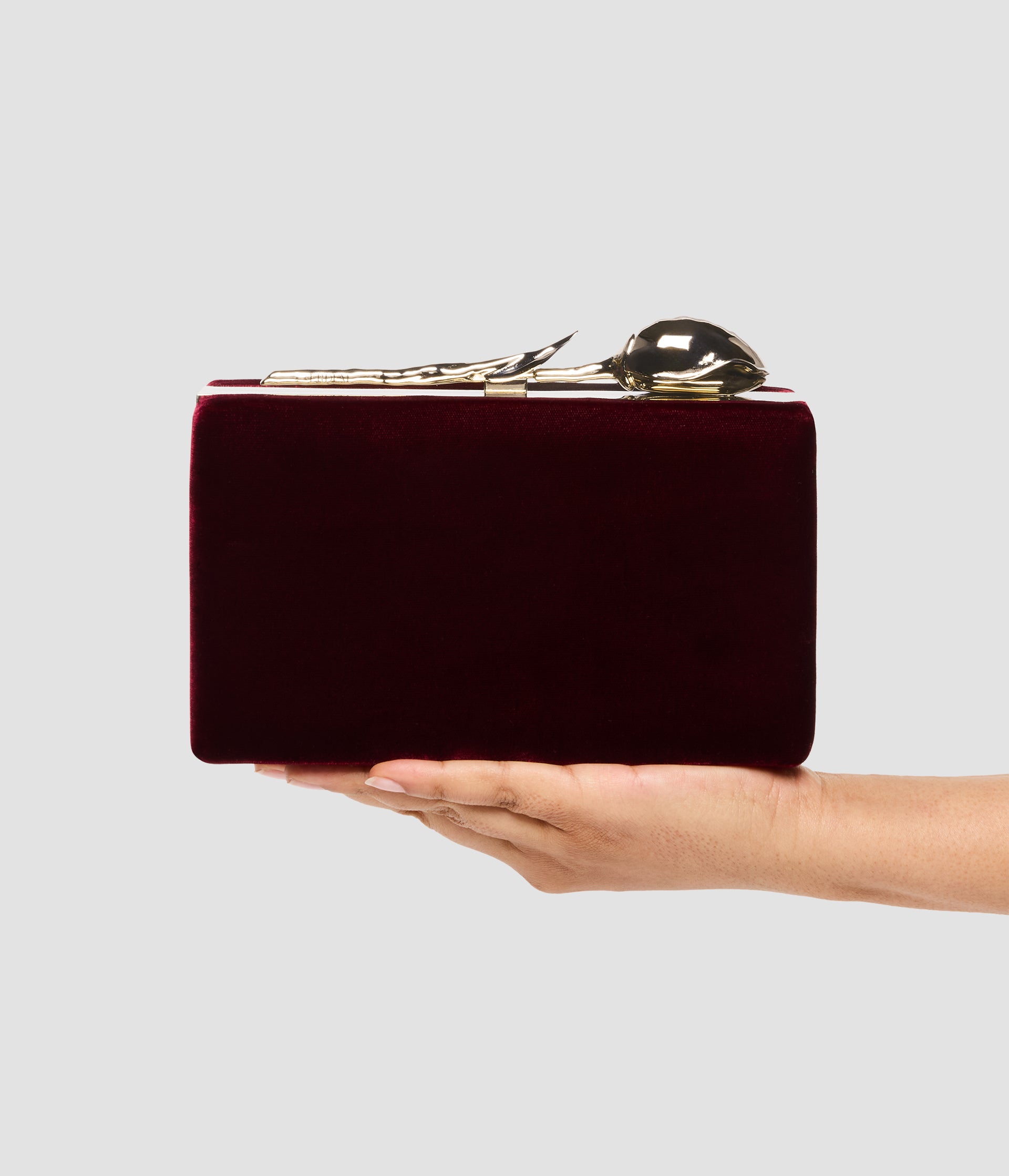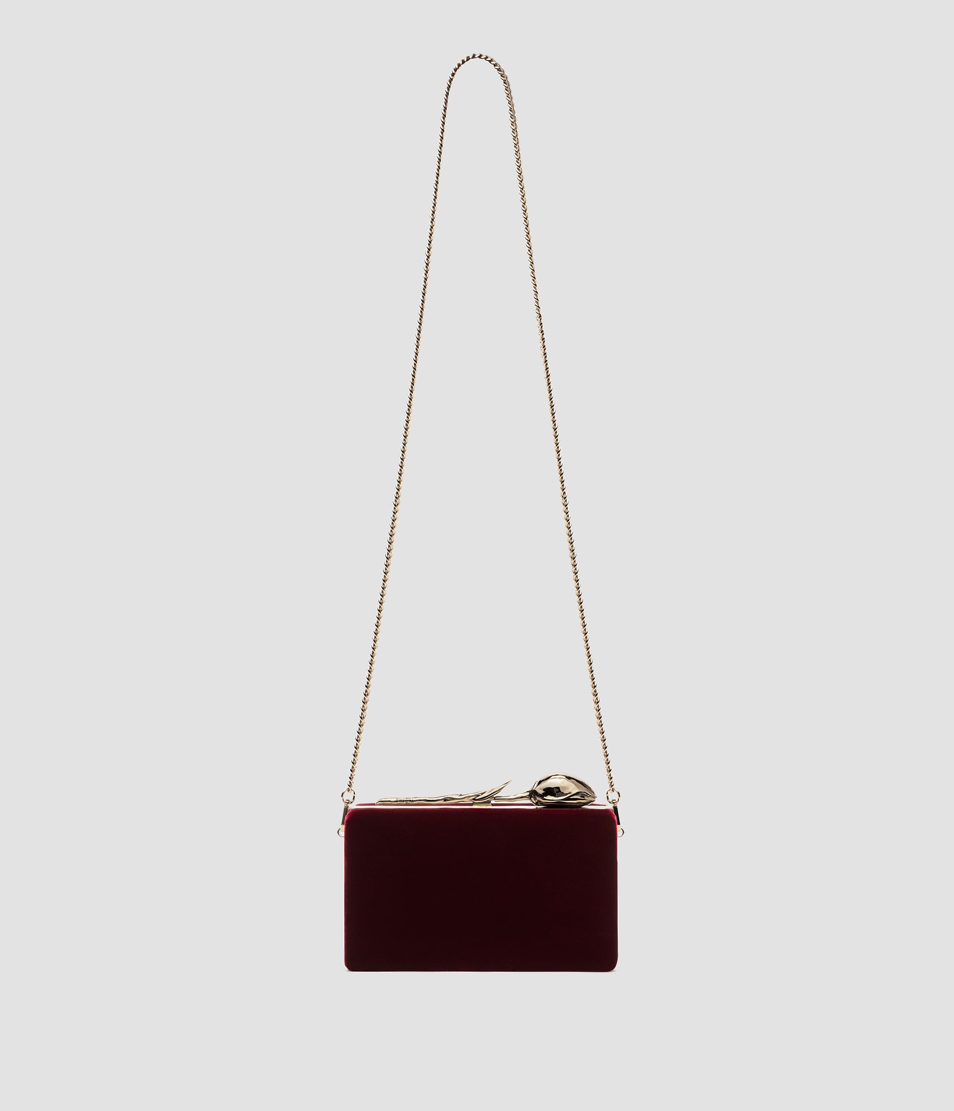 The Bloom Minaudière gold-toned flower bud floats elegantly along the top of the bespoke brass frame. It takes seven hours to produce using the lost wax casting method.