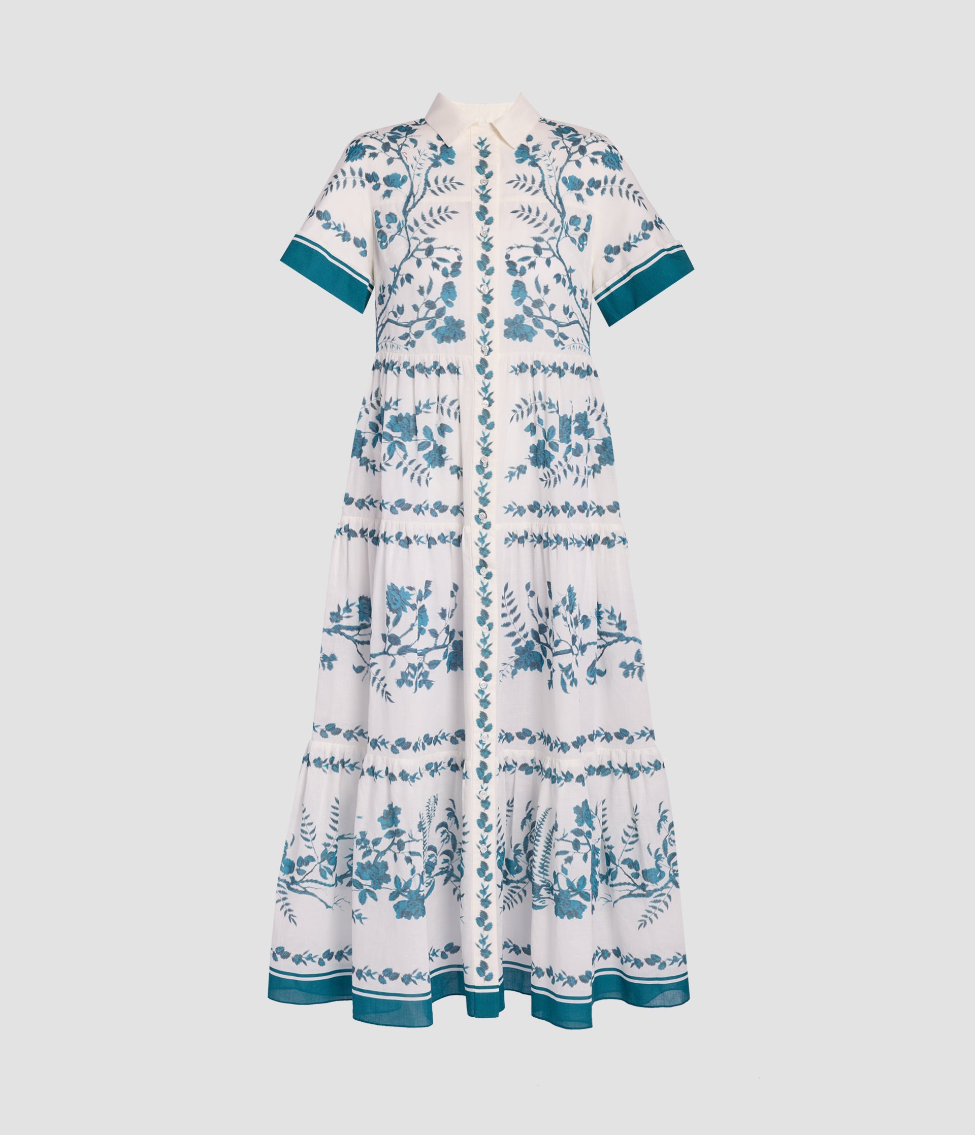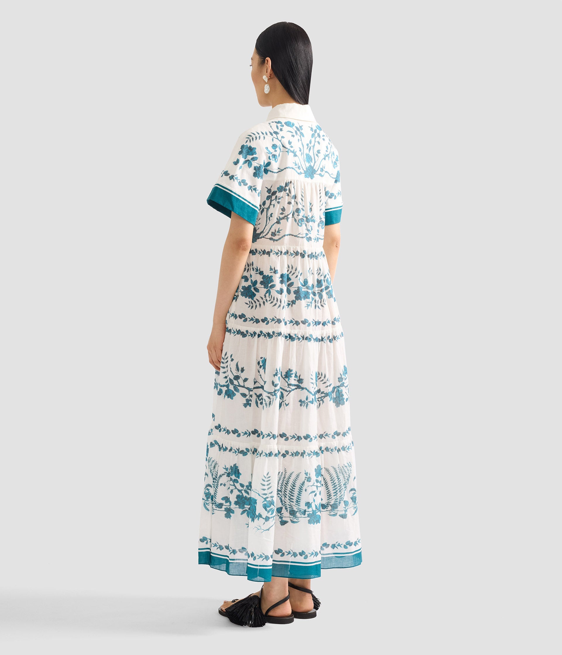 This ankle-length shirt dress is made from a lightweight cotton and linen-blend which is printed with a botanical fern design. It has short sleeves and a tiered skirt.