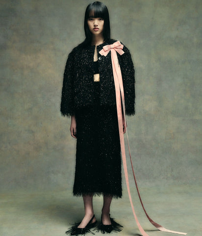 Cut for a cropped, boxy silhouette, this black jacket is made from lurex fil coupé, a tactile fabric combining texturized matte and shiny threads.