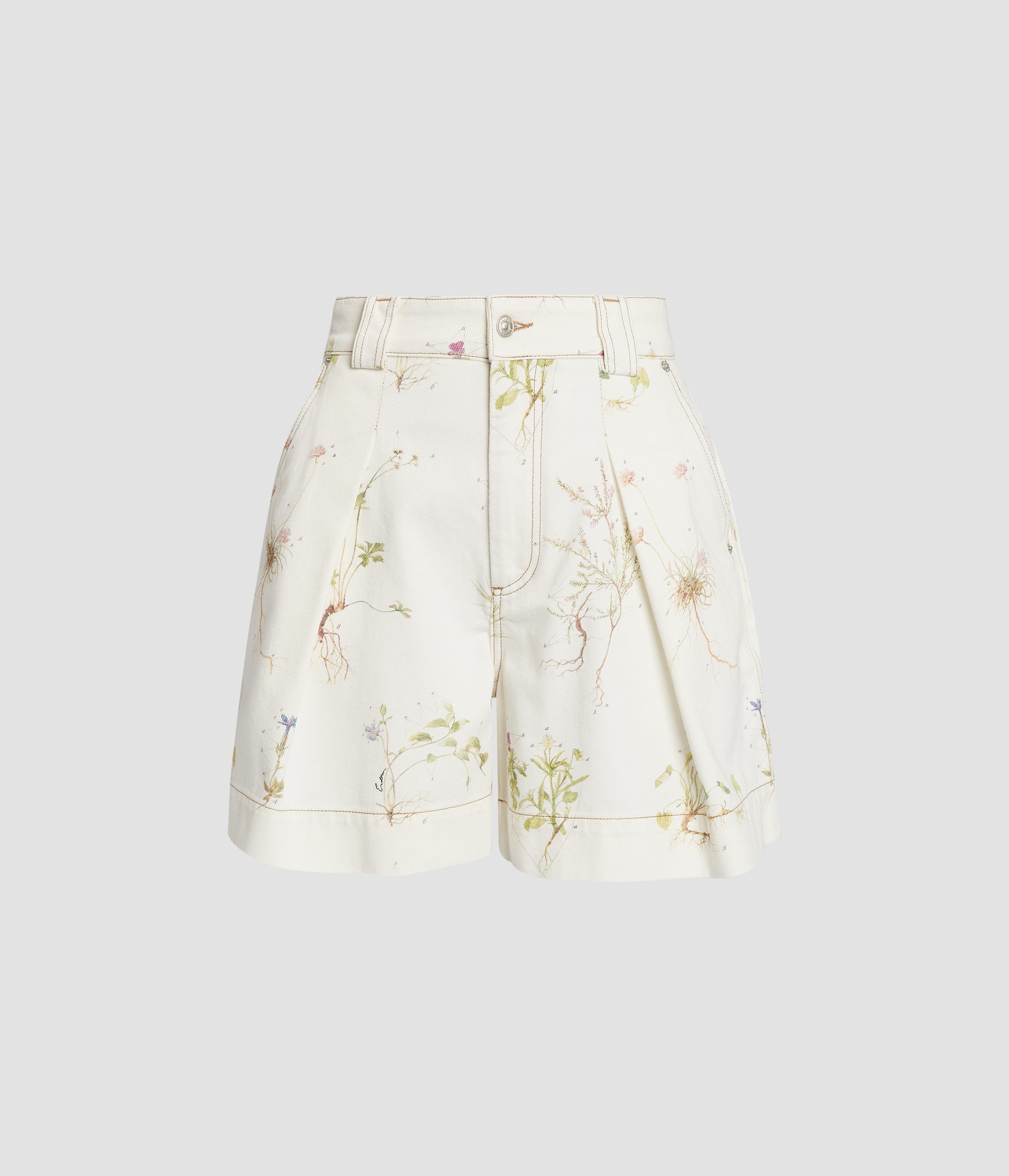 These high-rise shorts are shaped for an A-line silhouette and have centre-front pleats. The white denim is printed with botanical illustrations.