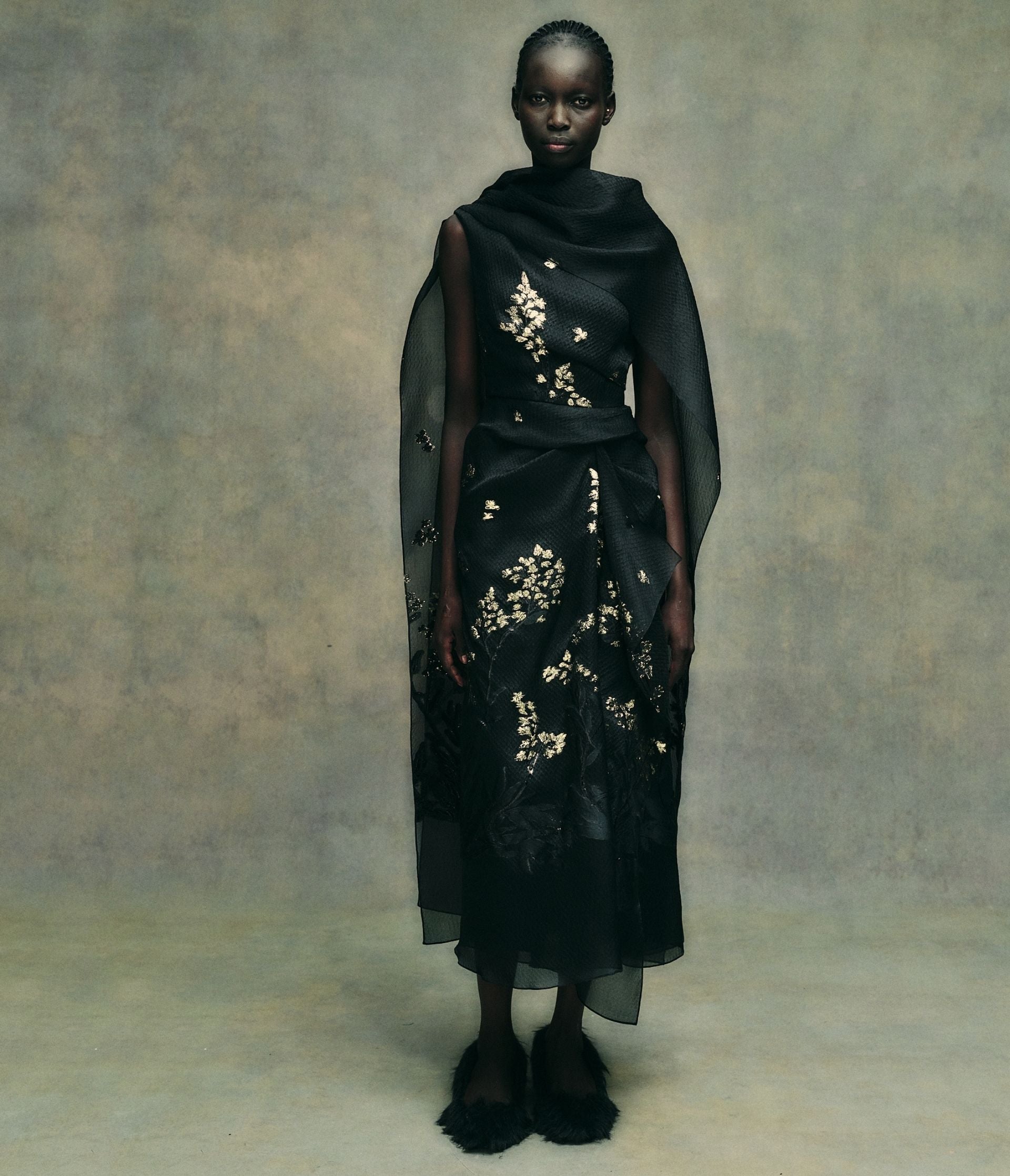 Draped from semi-sheer organza, this airy black dress is detailed with a cape-inspired overlay. It is embroidered with metallic trailing fil coupé florals.