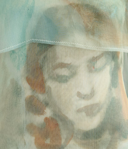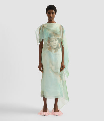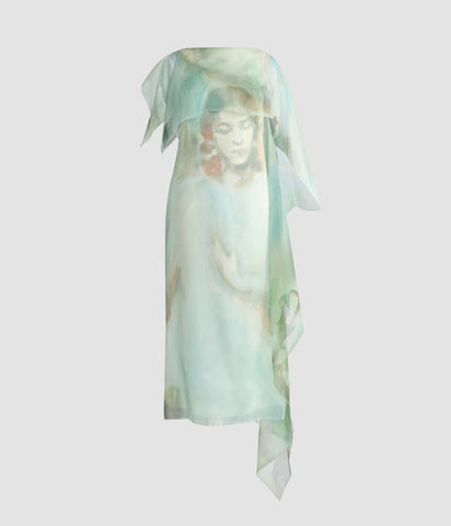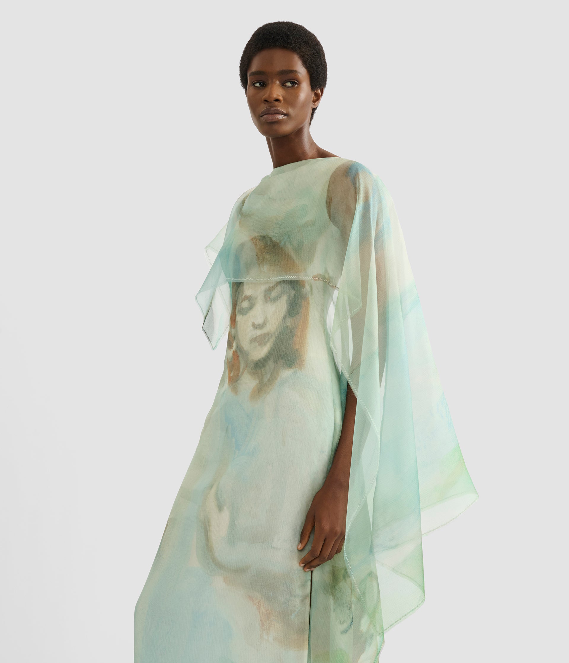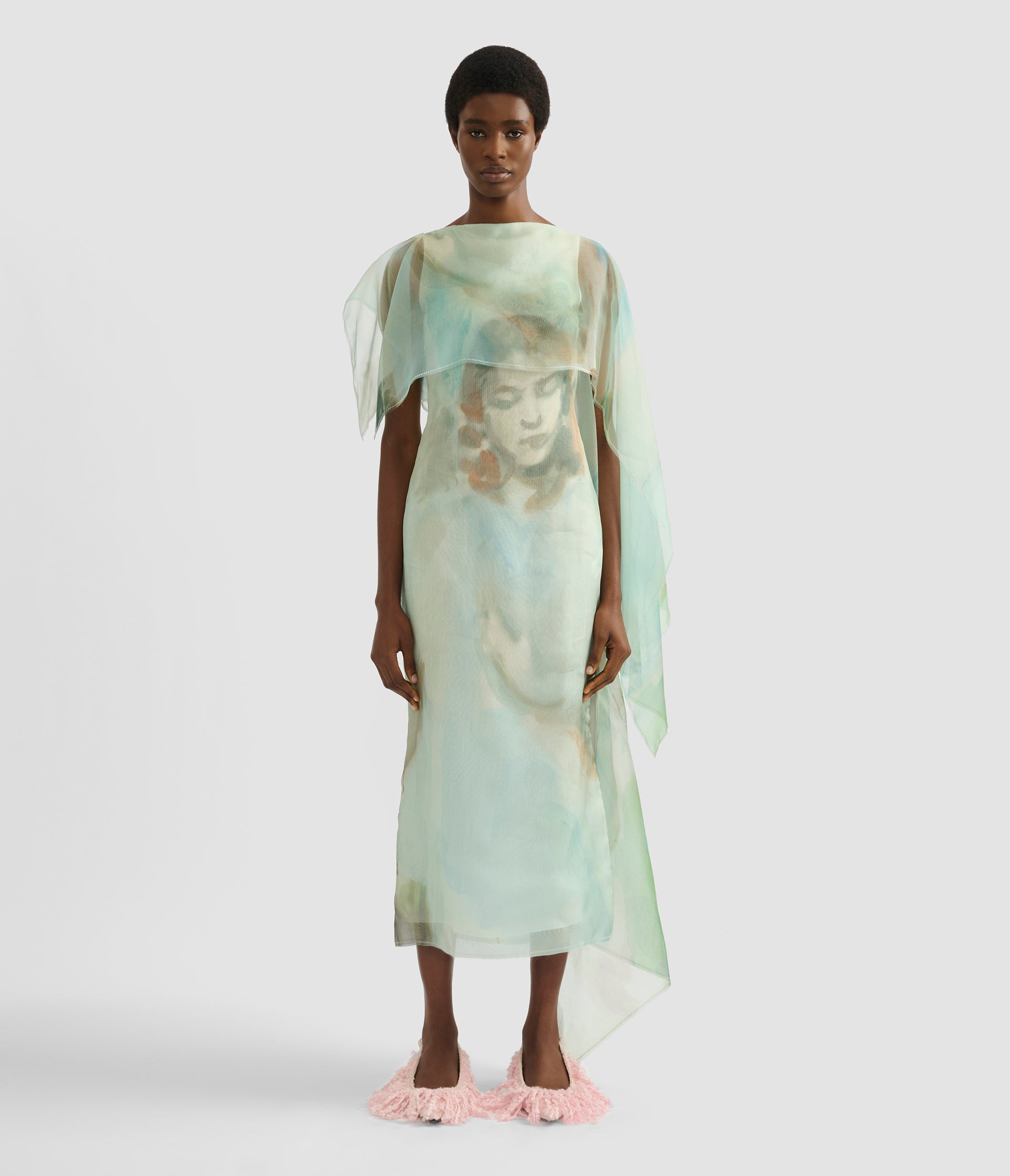 Combining structure and fluidity, this fitted cocktail dress is overlaid with draped detailing. The technical organza is printed with a portrait by the artist Kaye Donachie.