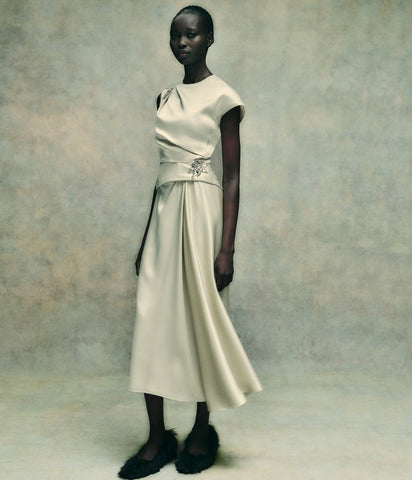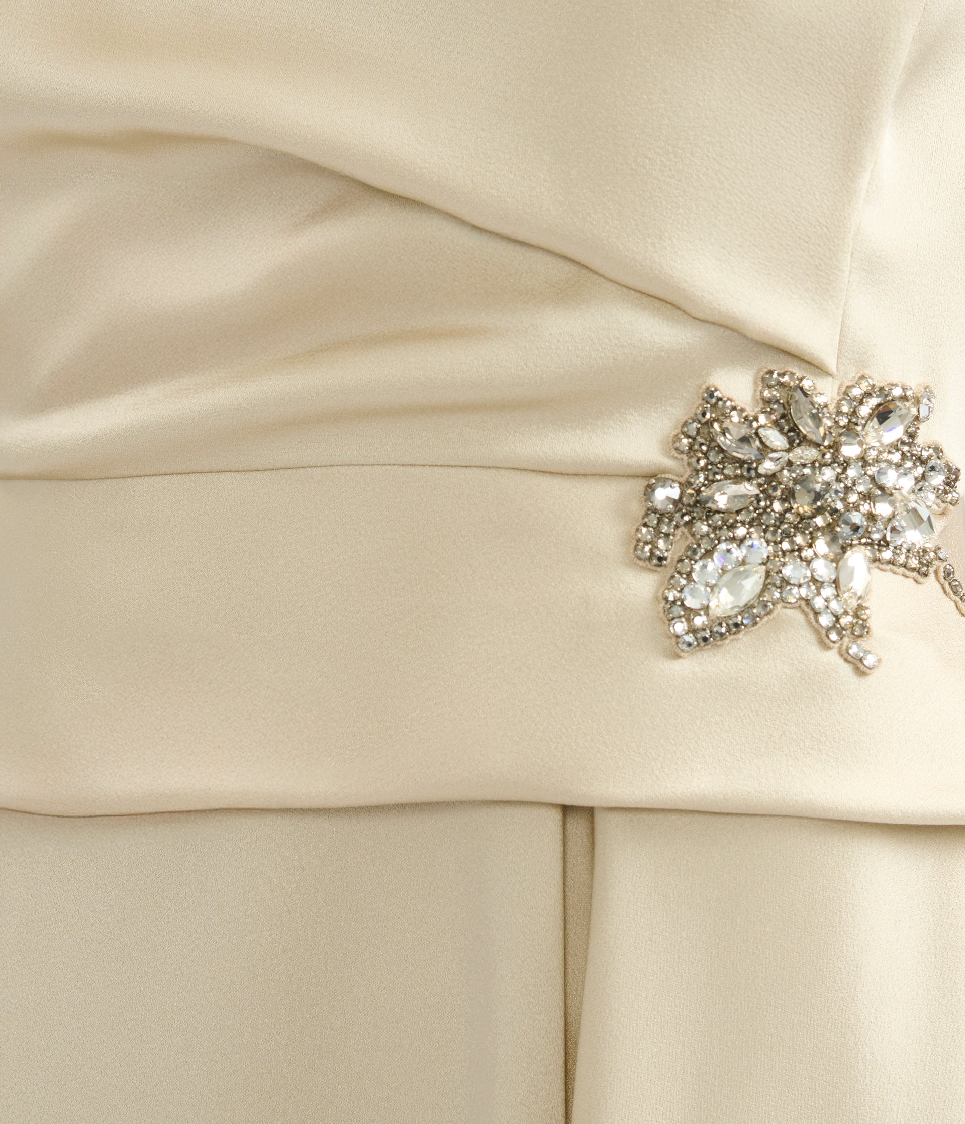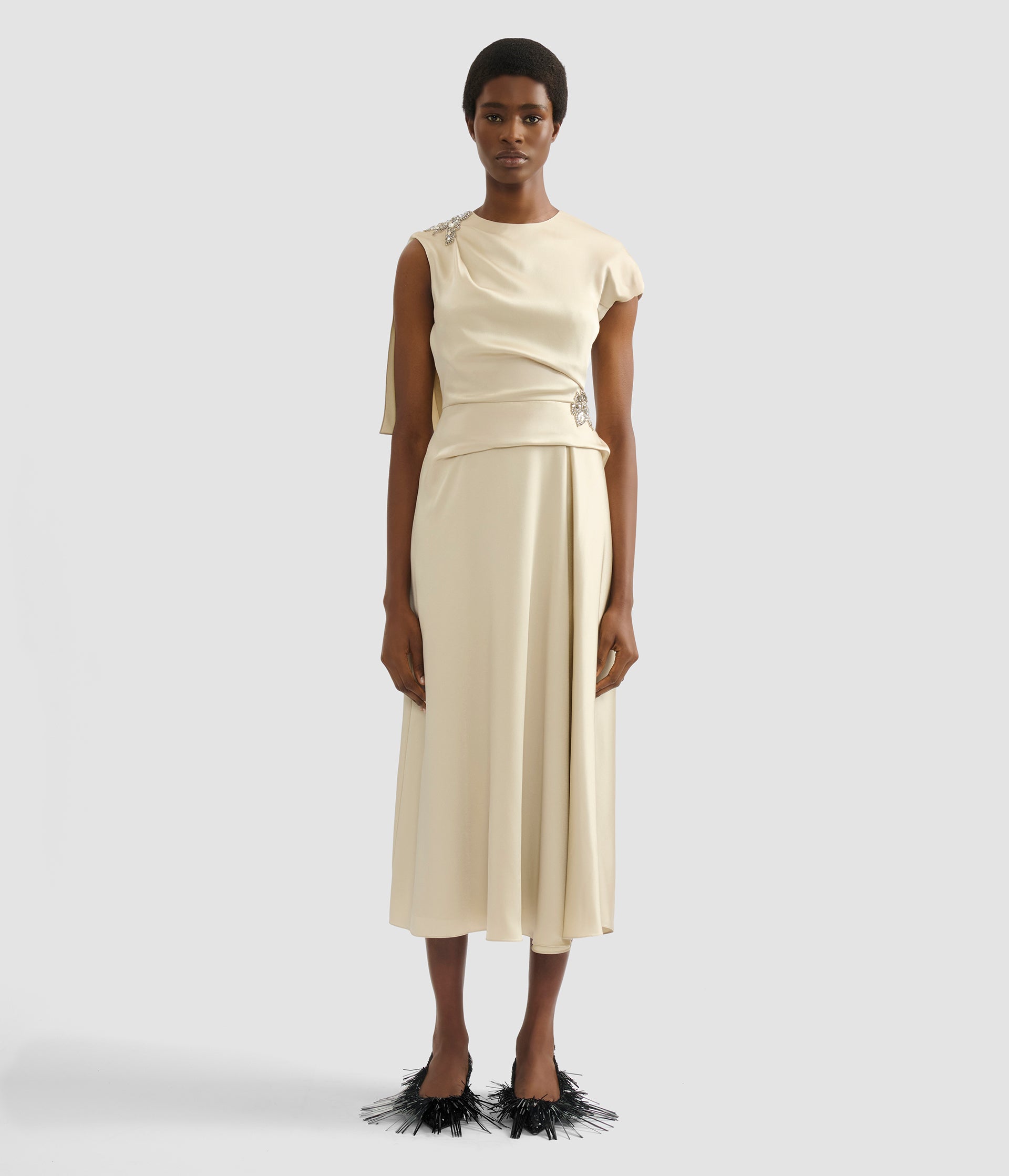 Cut from fluid satin cady, this champagne-hued dress has asymmetric sleeves and a draped skirt. Crystal-embroidered appliqués adorn the shoulder and hip.