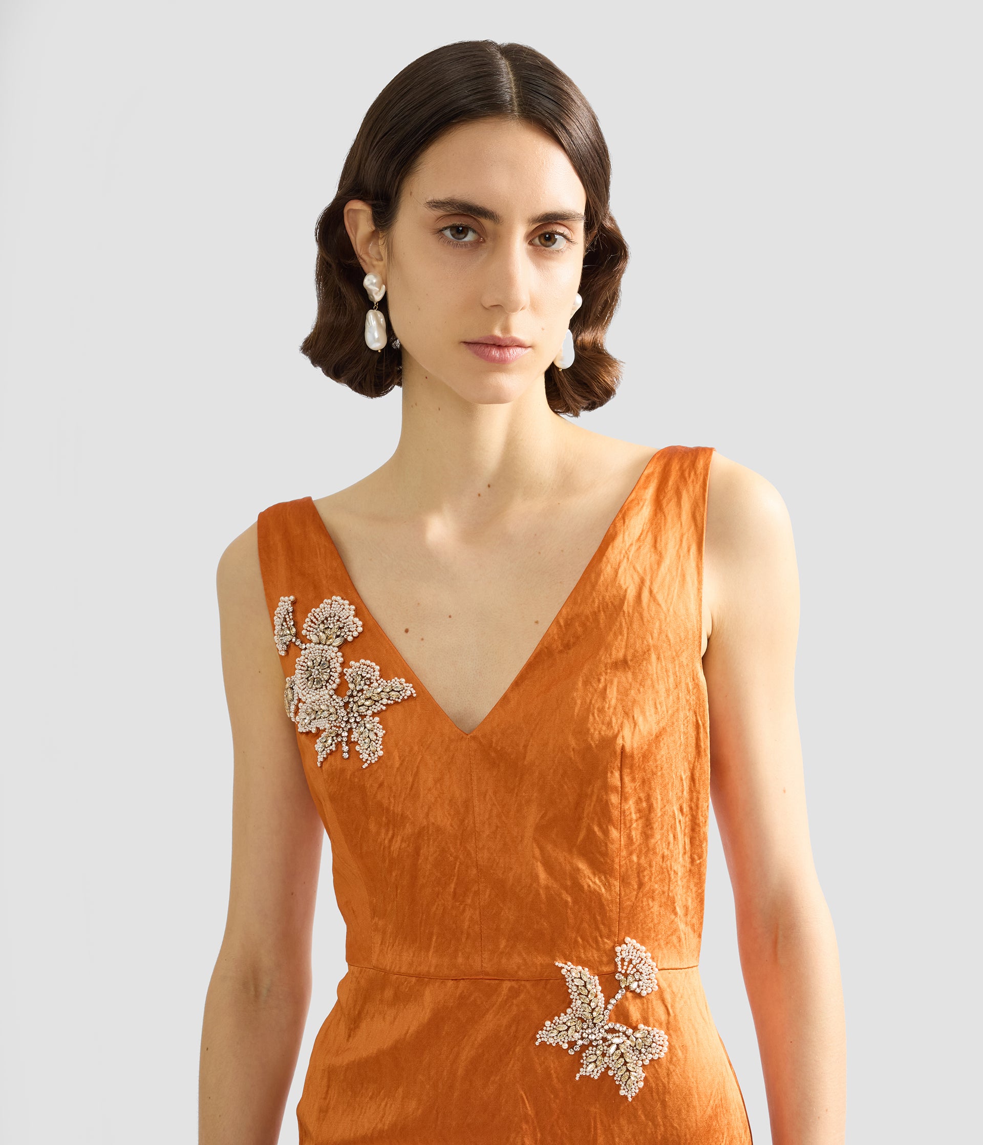 Cut for a slimline silhouette, this mid-length dress is made from amber crushed satin. It has been hand embroidered with crystals in India.