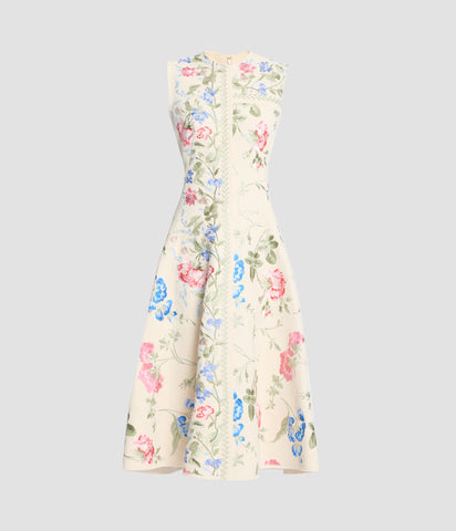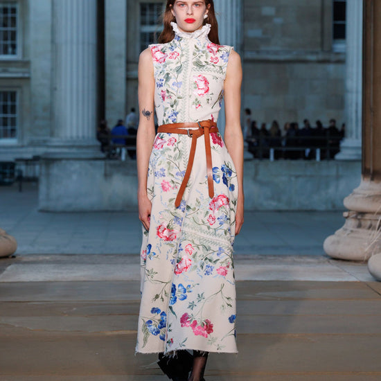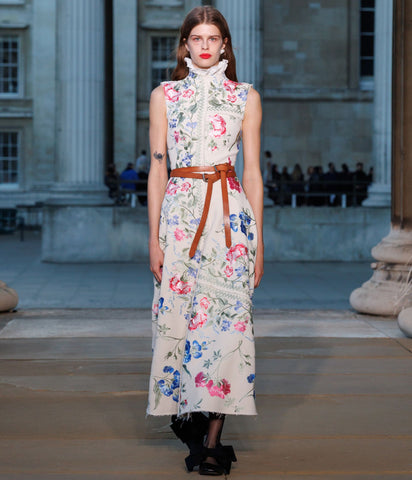 Shaped for an hourglass silhouette, this cotton twill dress is embroidered with colourful threadwork flowers inspired by fabrics favoured by Marie Antoinette.
