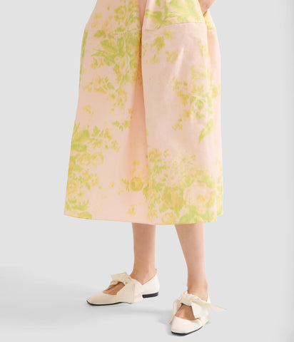 This mid-length skirt is crafted with a panel at the hips to accentuate a full silhouette. The rose-hued linen chine is decorated with chartreuse roses.