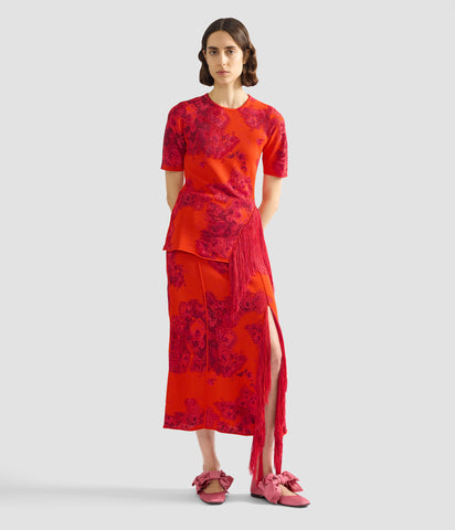 With exposed seams and fringed trims, this knitted jacquard skirt falls to an asymmetric hemline. The burnt orange hue is offset by a tonal floral pattern inspired by 16th century prints.