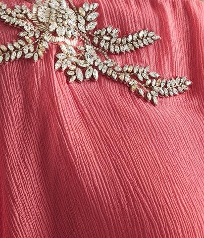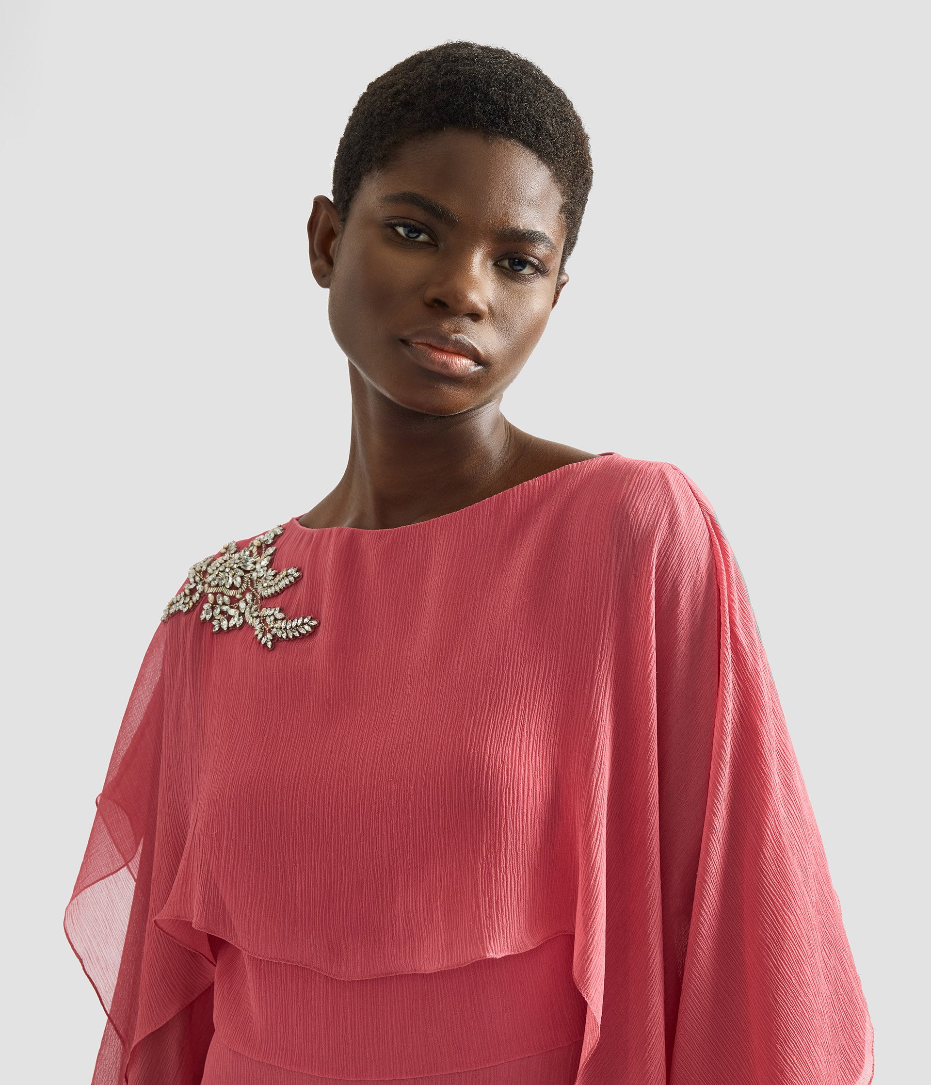 Cut from cherry silk creponne, this gown features blouson sleeves and a fluid, draped overlay. It is embellished with crystals at the shoulder and falls to an asymmetric hem.