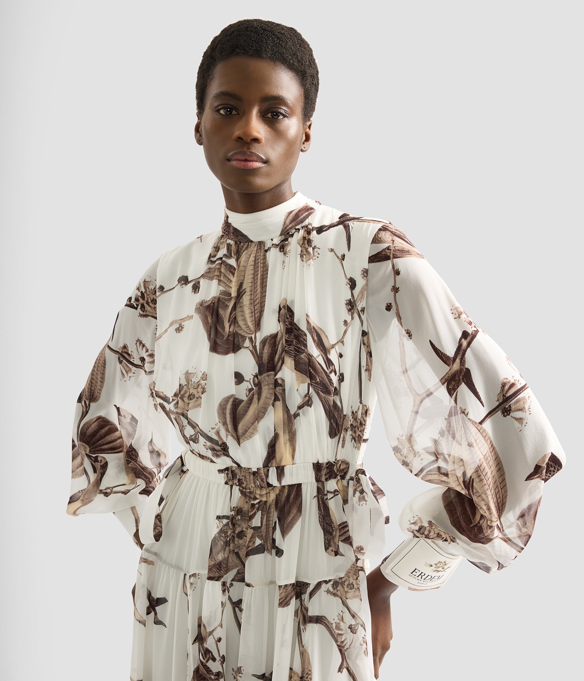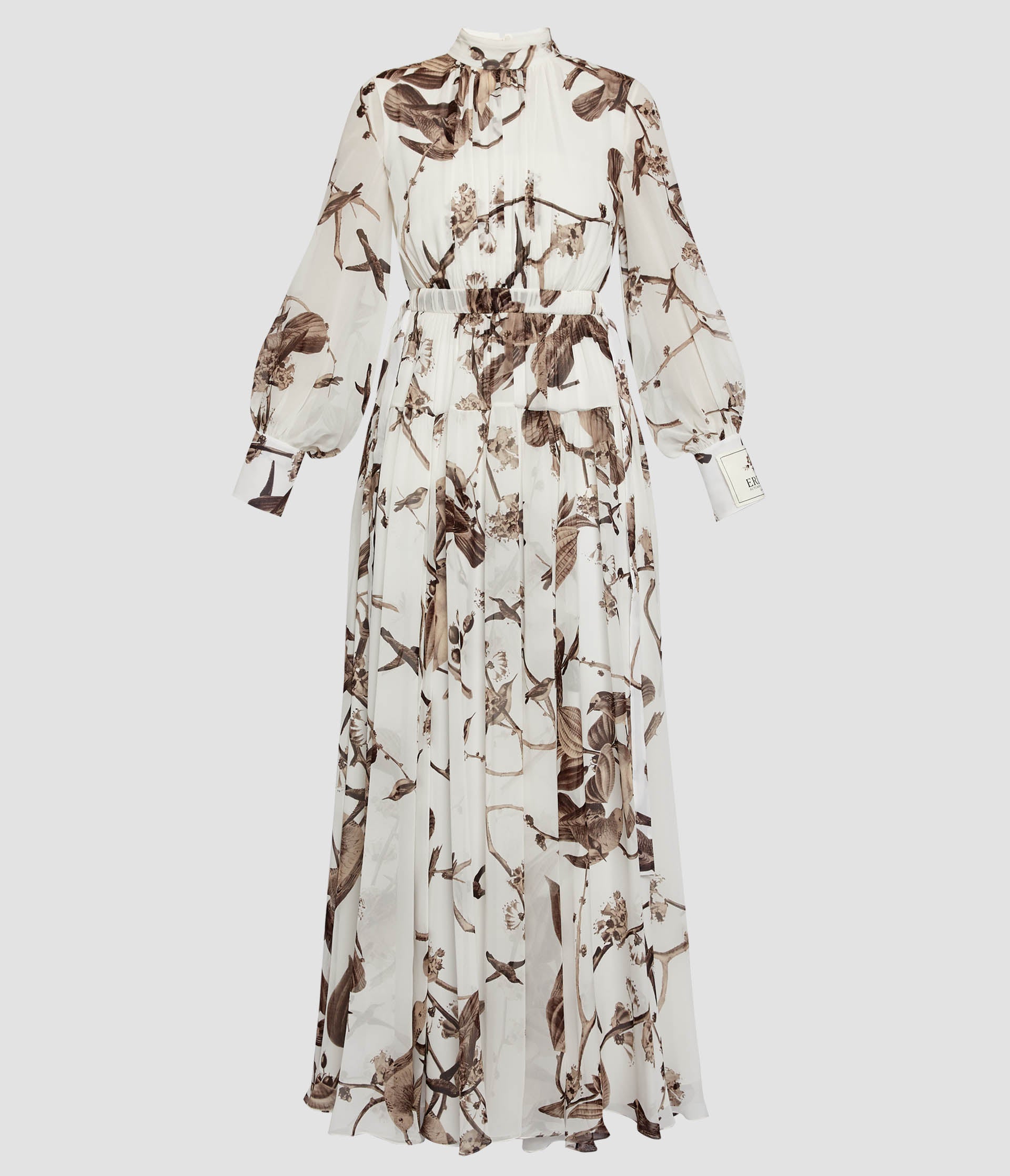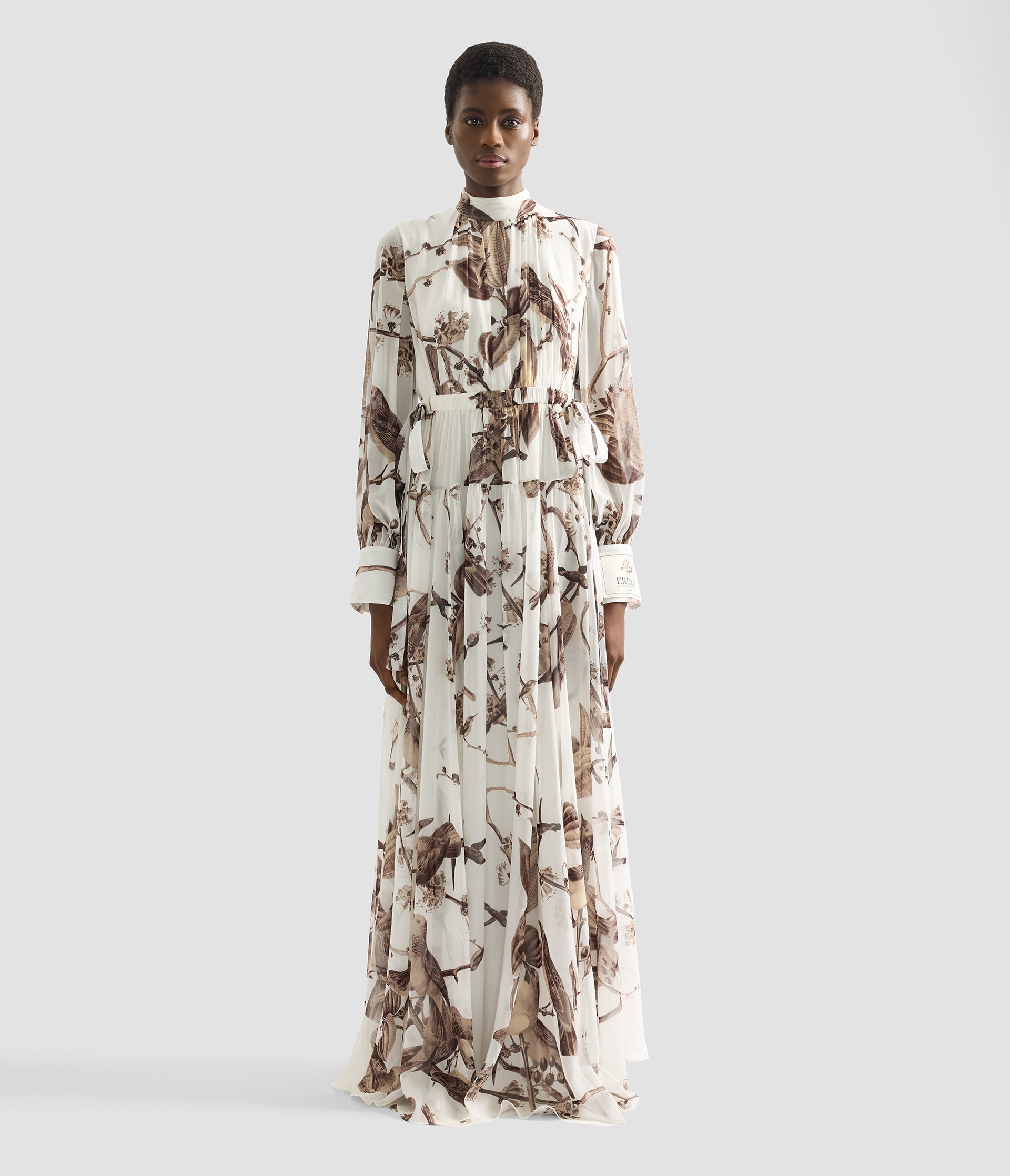 Showcasing a classic ERDEM silhouette, this gown is made from an archival fabric originally developed for the house’s debut Autumn Winter 2006 collection. Printed in Italy, the heavy silk voile is decorated with birds and botanicals. A label at the cuff marks it out as part of the 20th anniversary capsule collection.