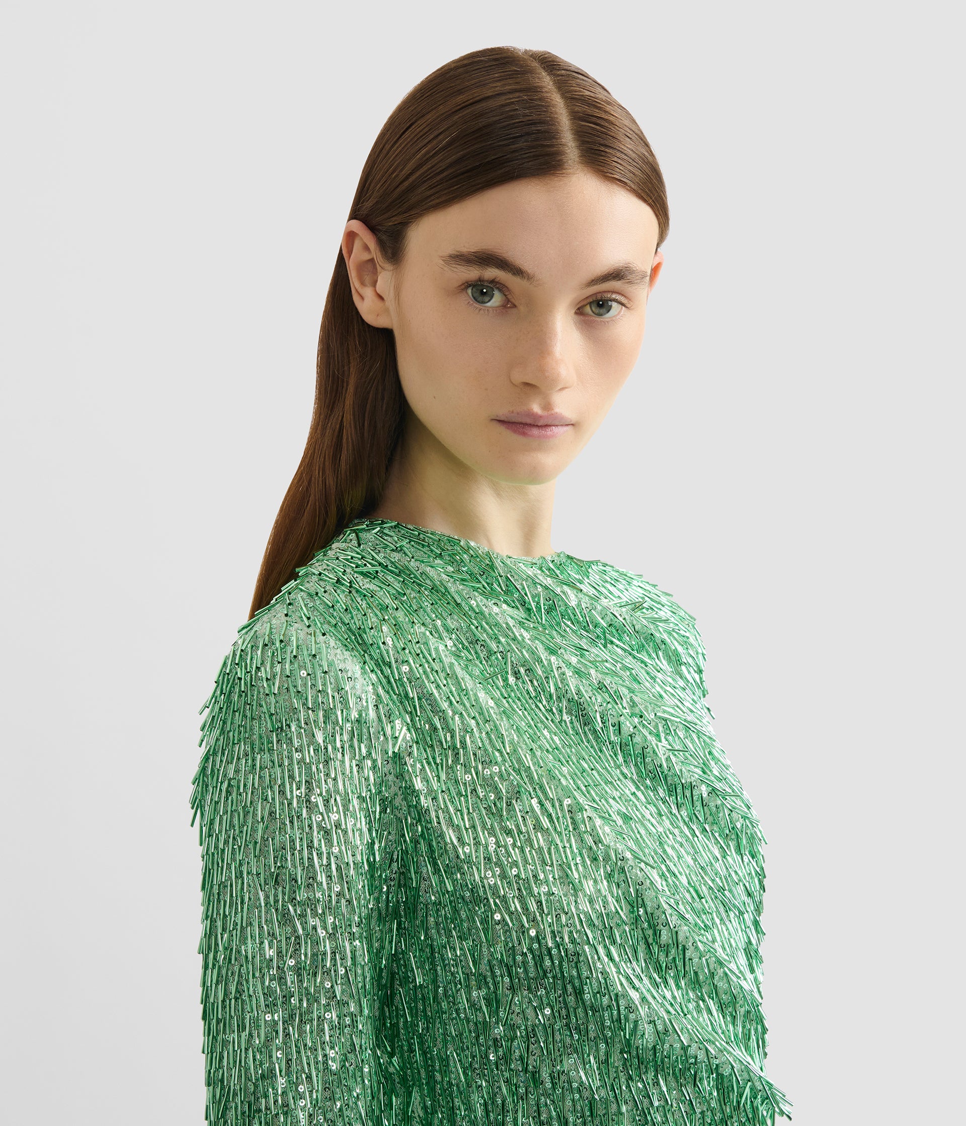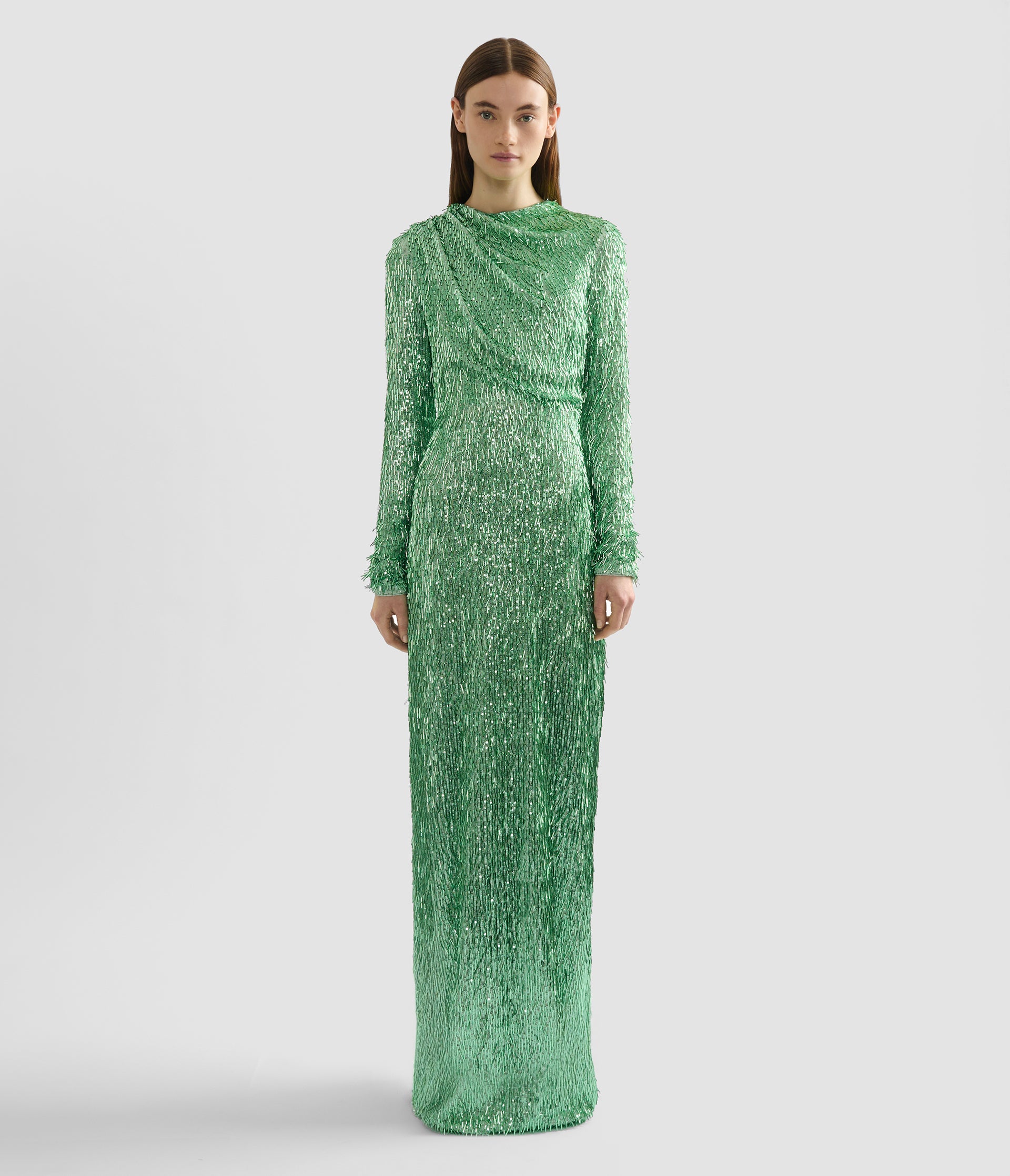 Draped at the neckline and falling to a floor-length hem, this green dress is covered in thousands of sequins and bugle beads.