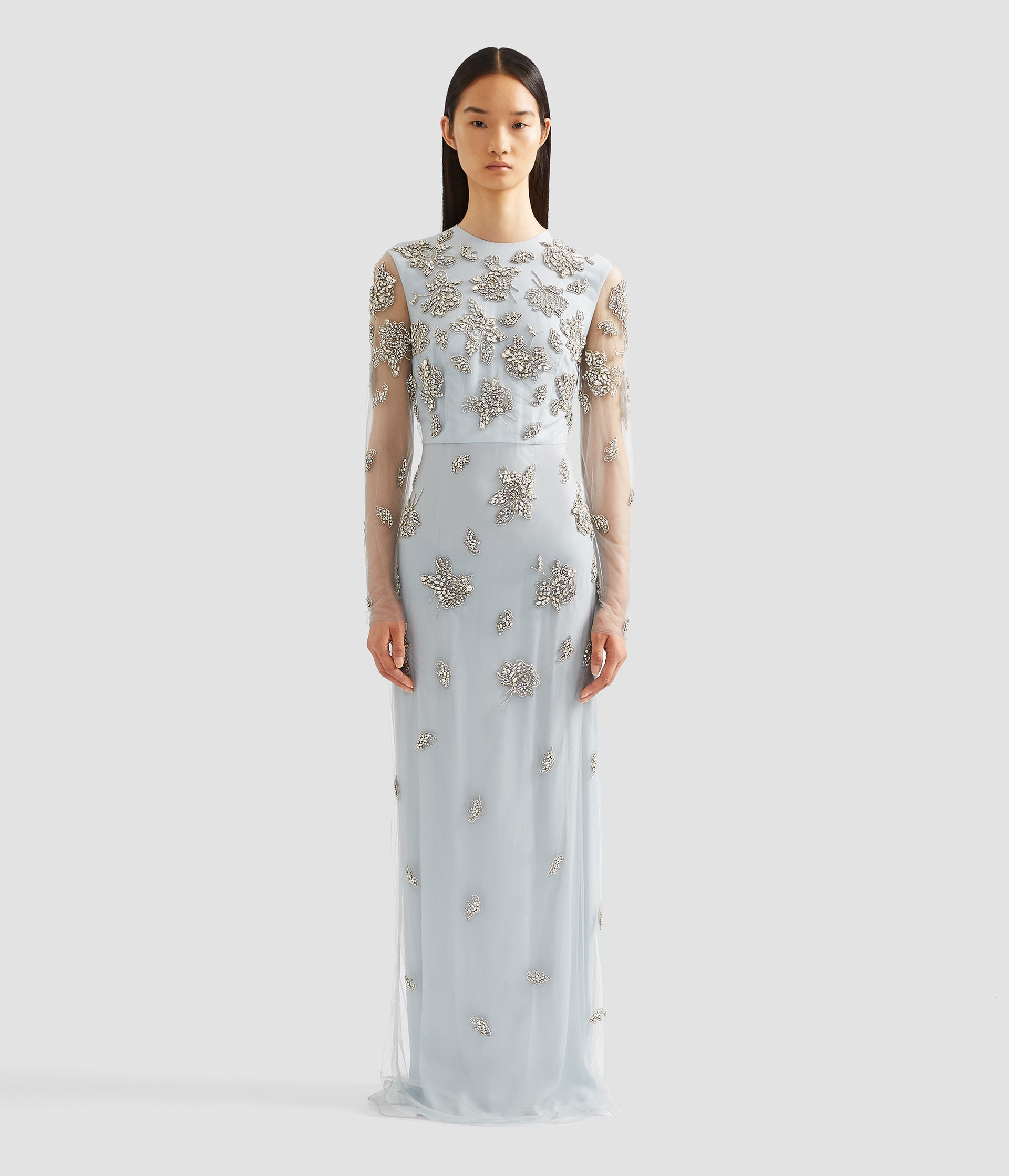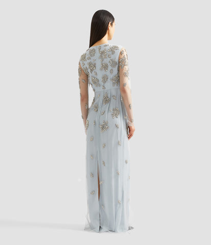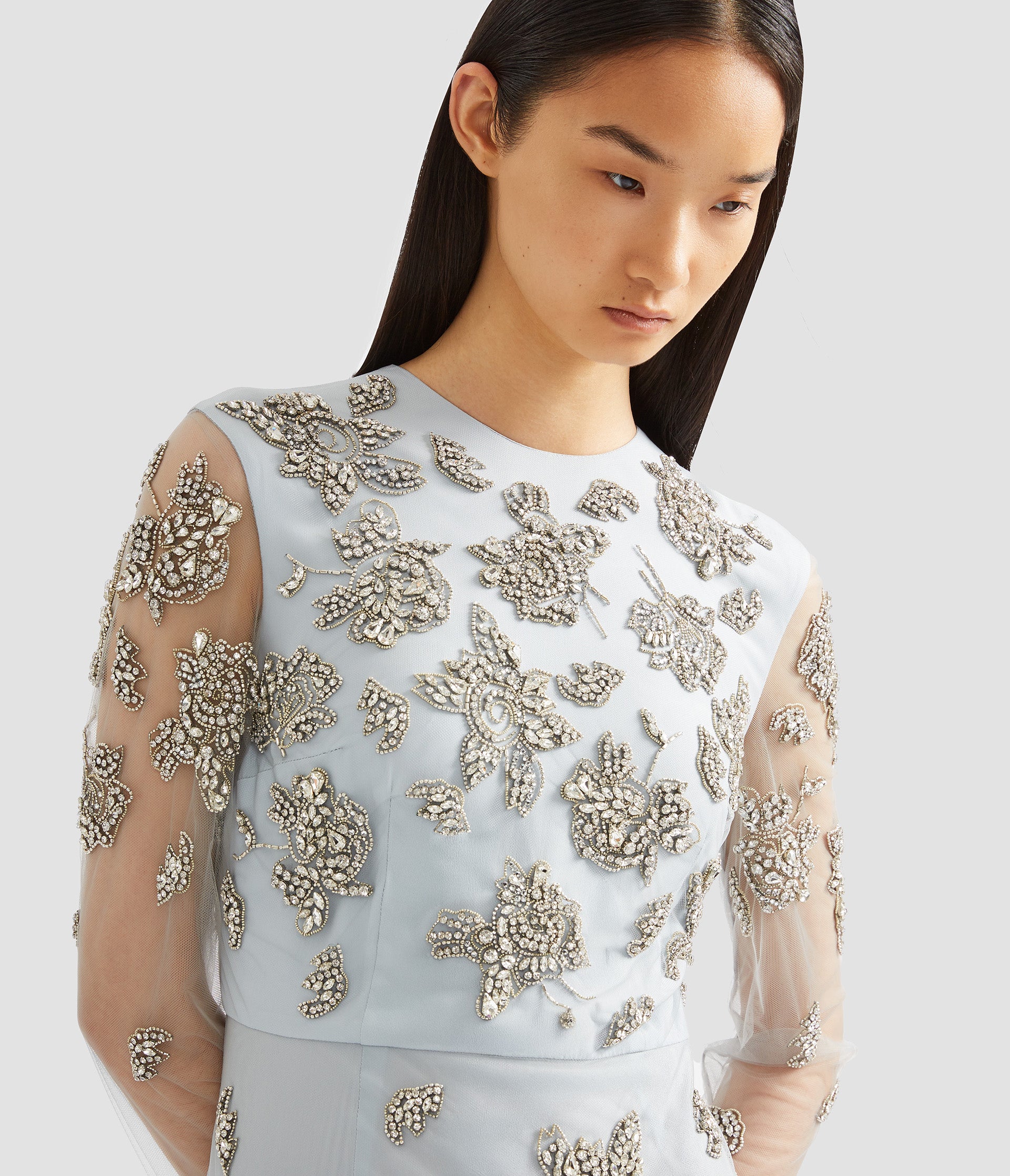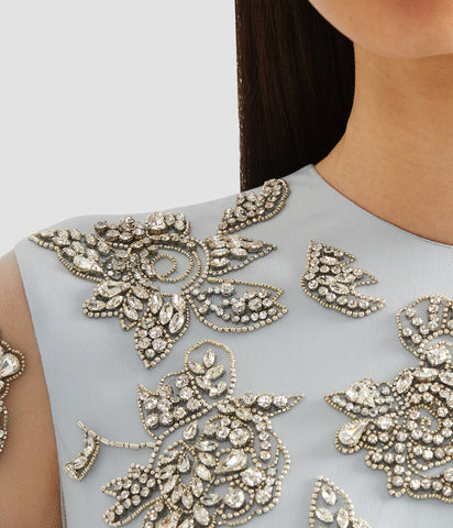 This dress features all over crystal embroidery. Cut from pale blue tulle, unlined sleeves showcase the fabric’s delicate nature.