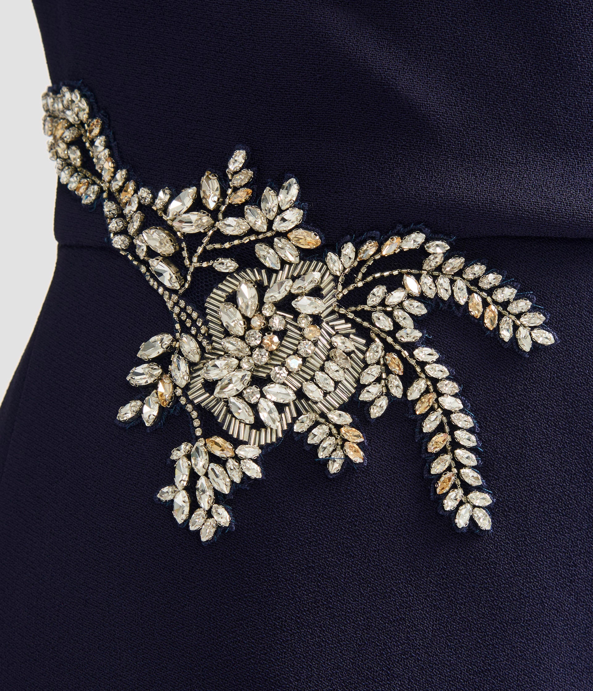 Draped from midnight sable, this floor-length gown cuts a streamlined silhouette while crystal embroidery punctuates the shoulder and hip.