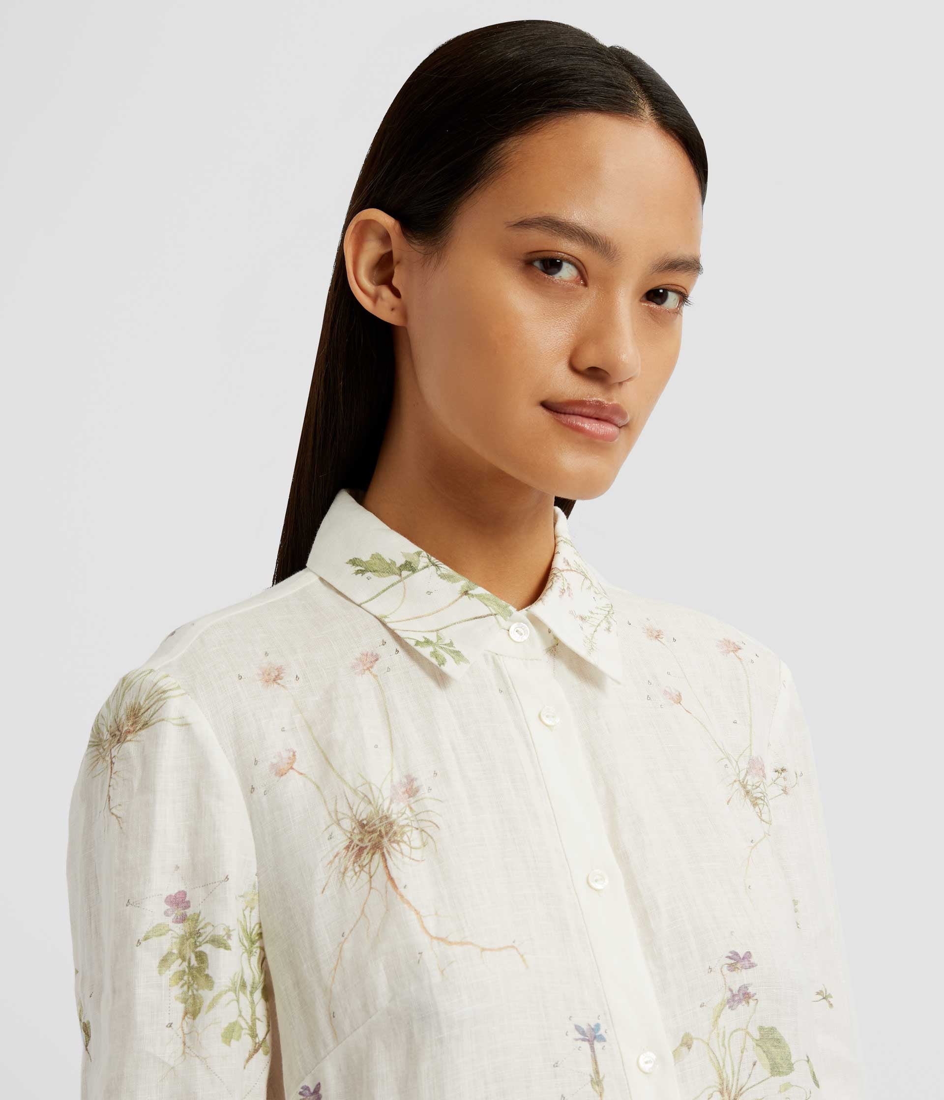 Cut for a relaxed fit, this mid-length shirt dress has a tiered skirt and long sleeves. Made from white linen, it is decorated with delicate botanical illustrations of varying sizes.