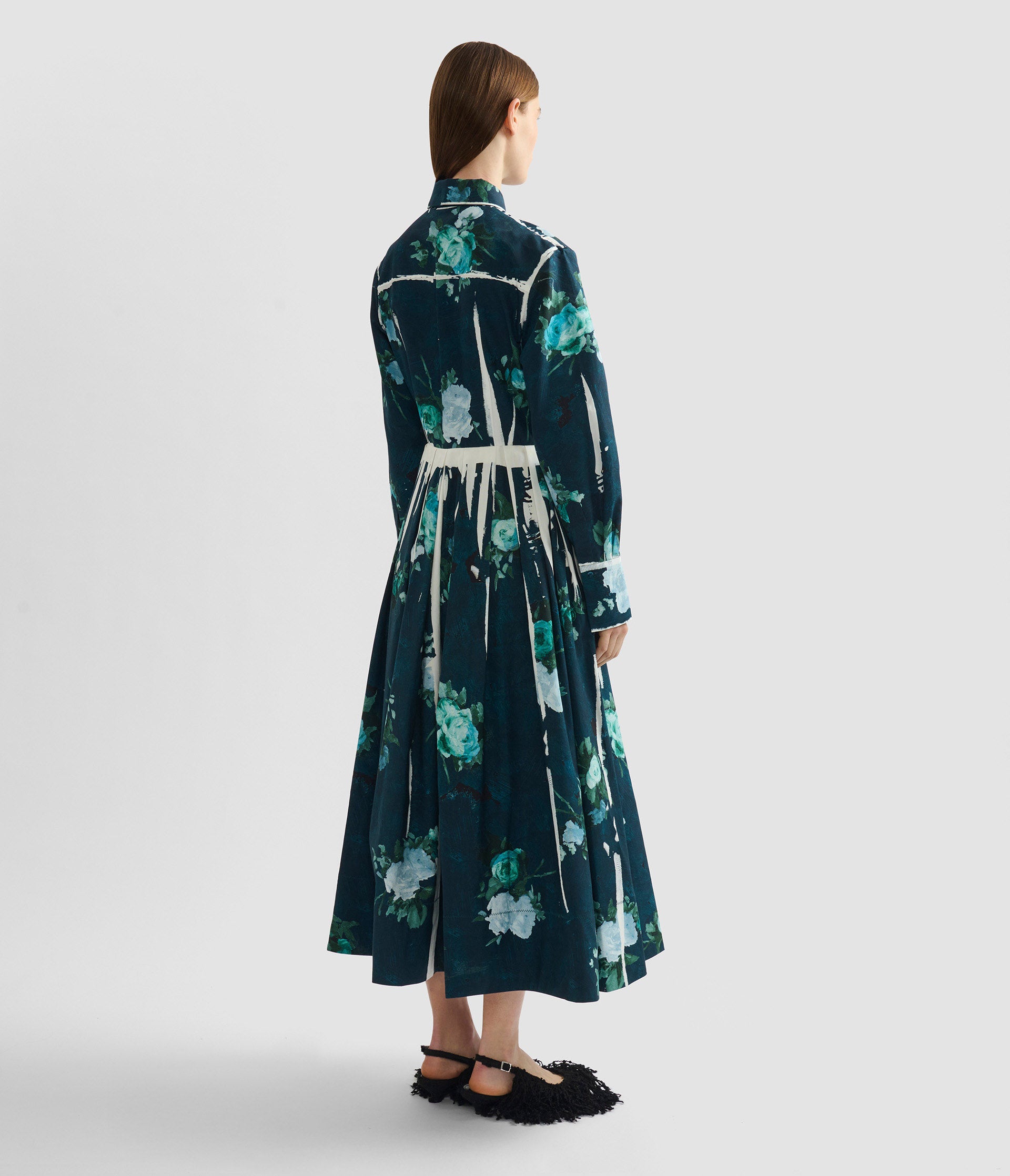 This shirt dress is crafted from cotton faille with an engineered navy and blue rose bouquet overprint. It has an embroidered patch at the cuff.