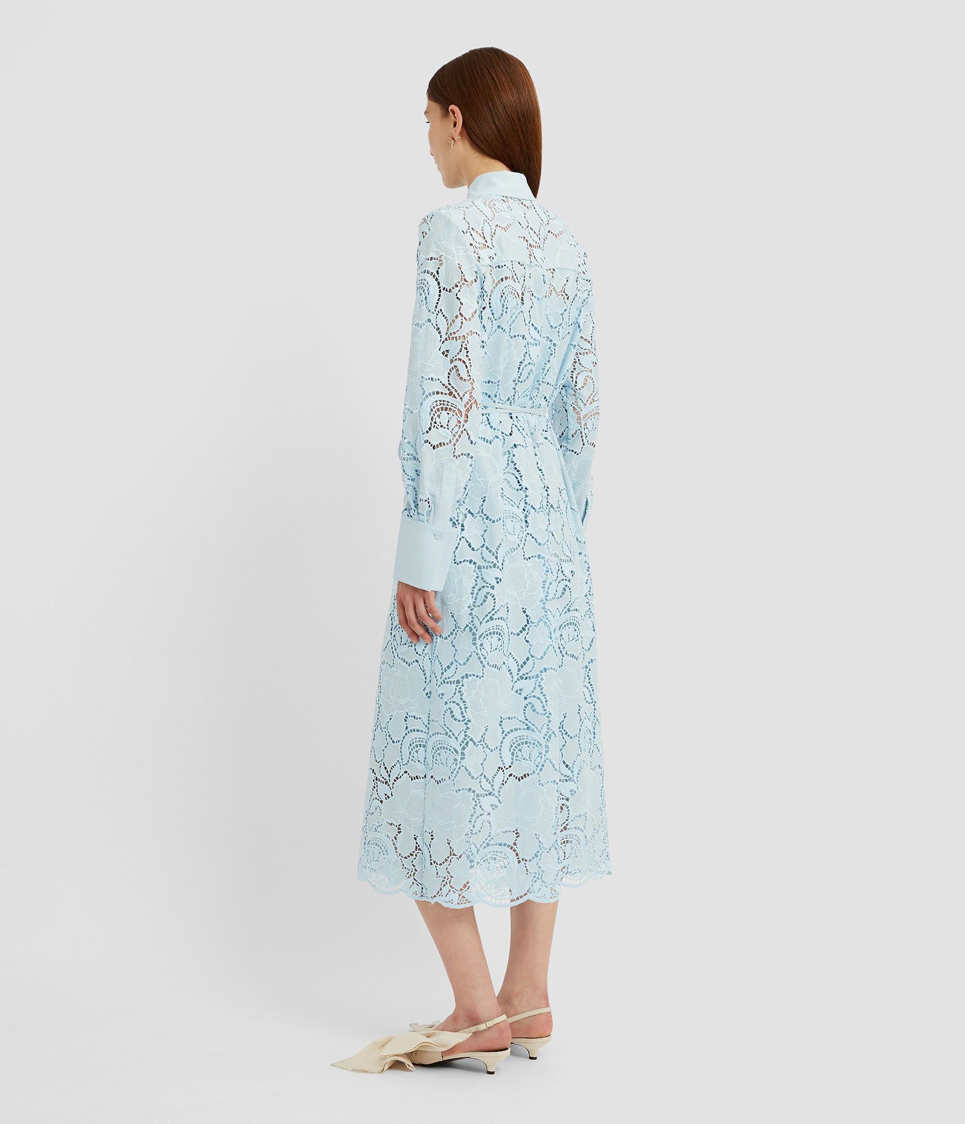 This relaxed shirt dress is made from blue cotton floral cutwork. It has long sleeves with button-fastening cuffs and a point collar.