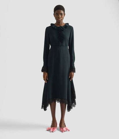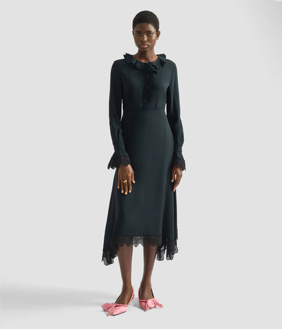 This black shirt is cut from black satin cady, chosen for its fluid handle. It has a ruffled trim at the collar, and intricate lace cuffs.