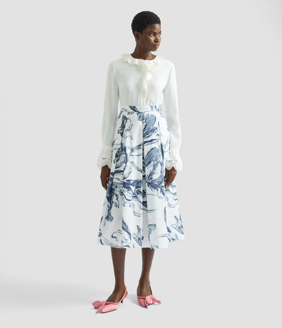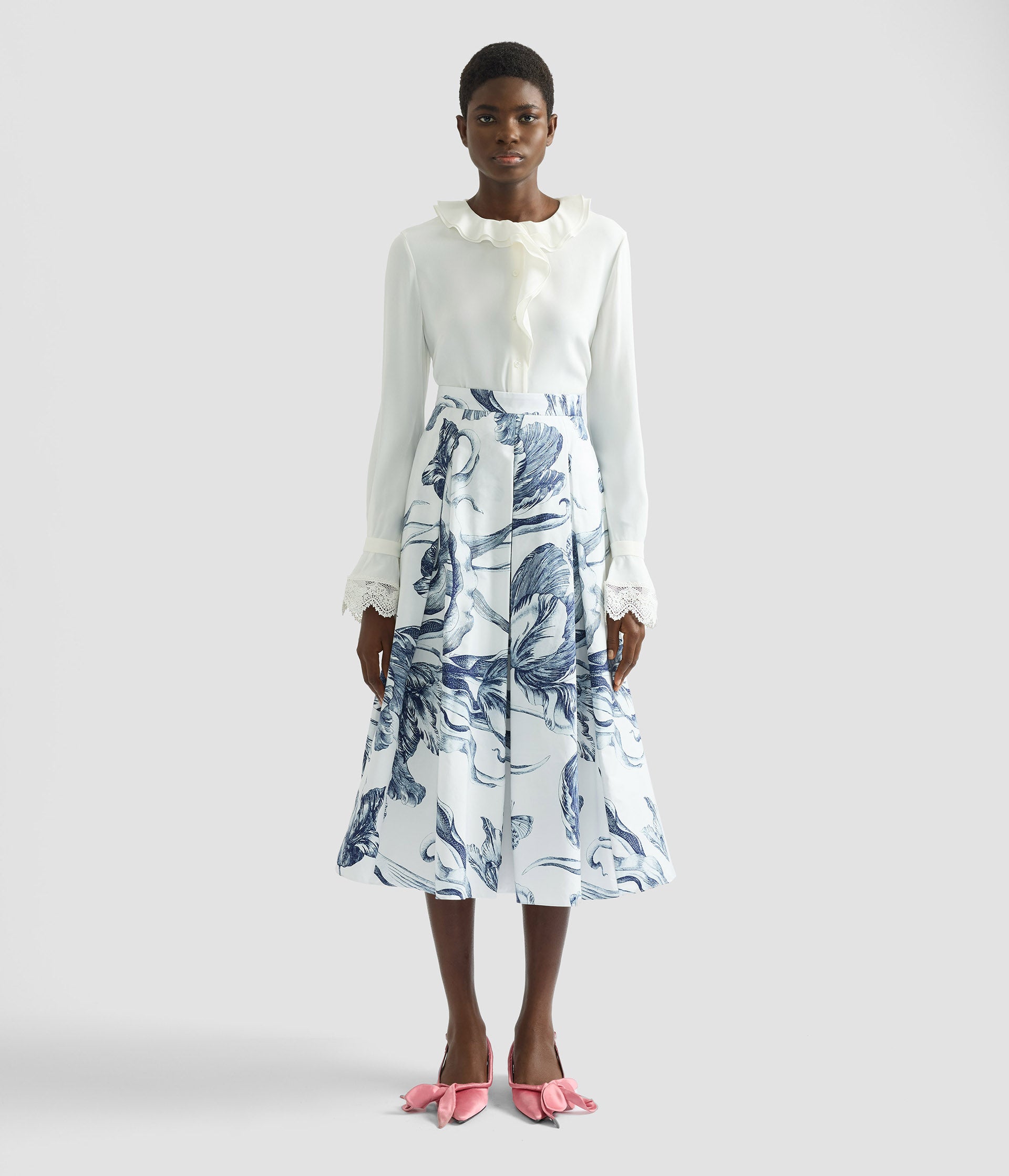 This white shirt has a ruffled trim at the collar, and lace cuffs. It is cut from satin cady, chosen for its fluid quality.