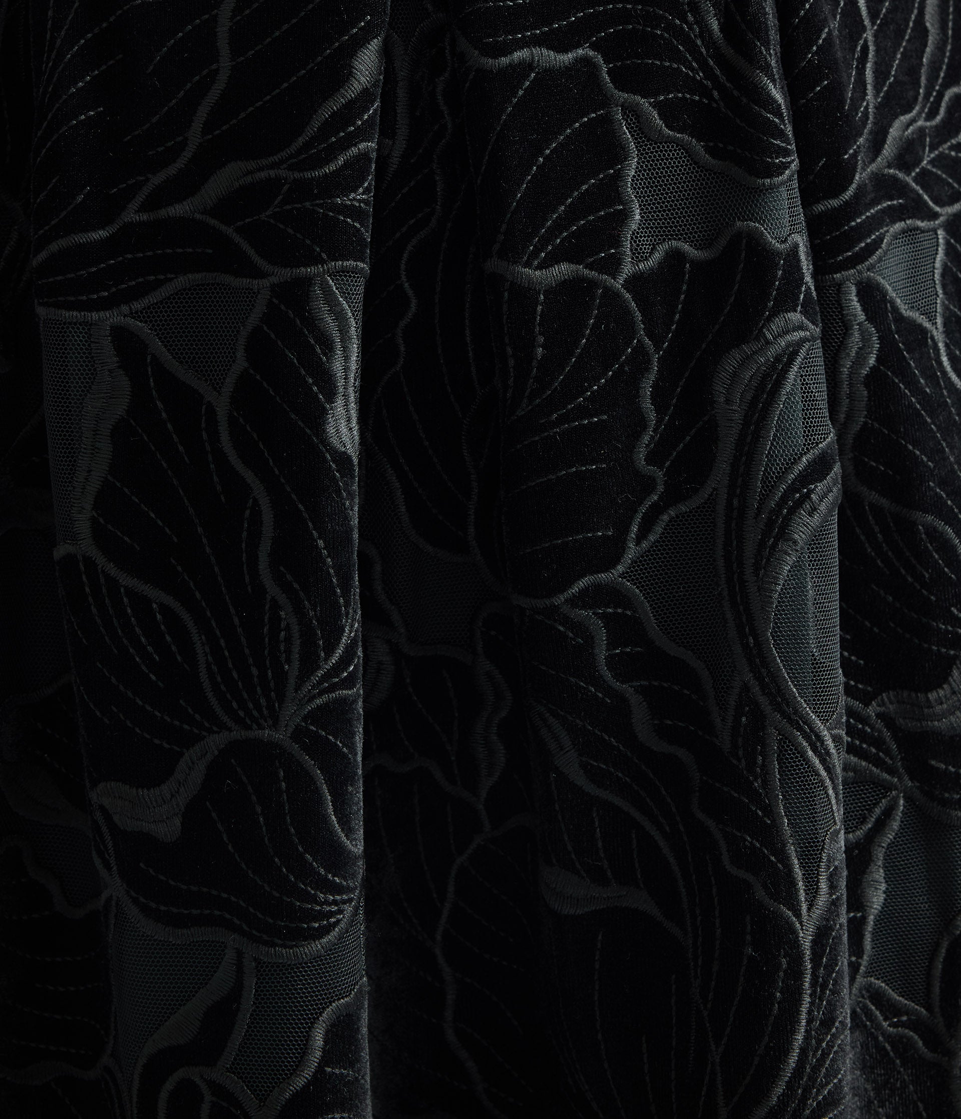 This tactile black cocktail dress is made from lustrous velvet floral cutwork mounted onto tulle. The curved neckline echoes the shape of the tulip-inspired skirt.