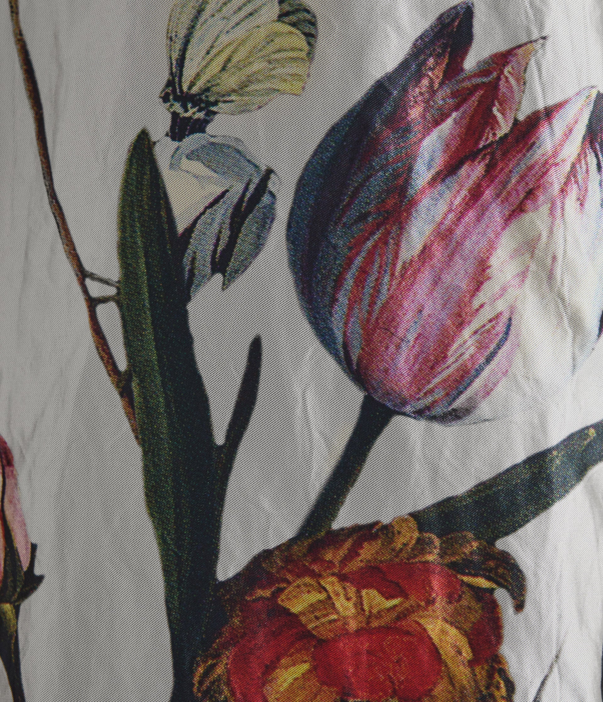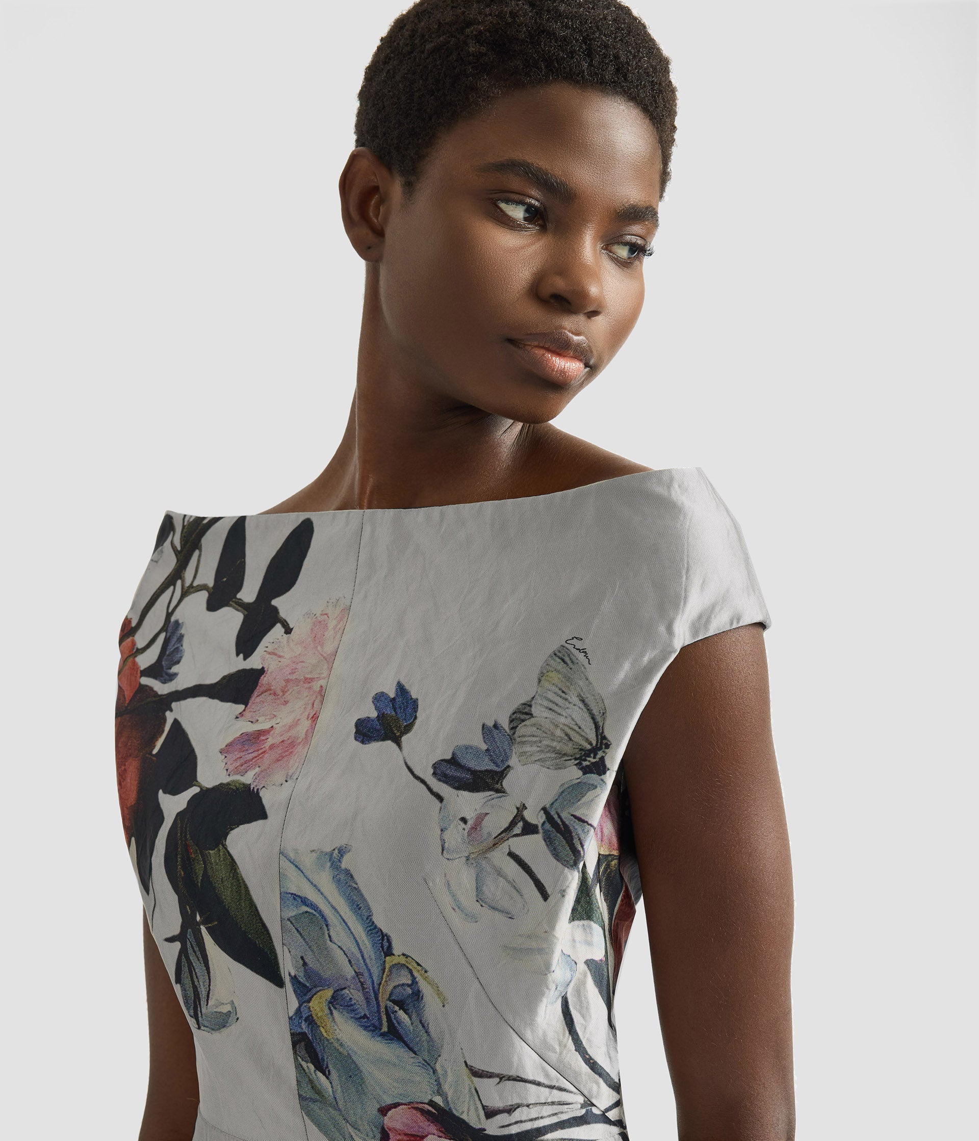 This slim-fitting gown is cut from panels of dove-grey textured satin for a patchwork effect. It is printed with large flowers inspired by traditional still life florals by the Dutch masters.