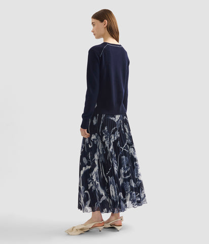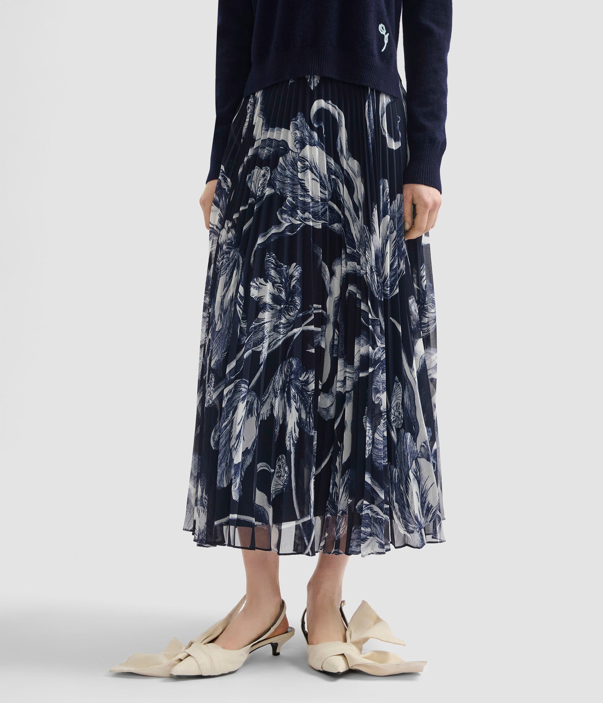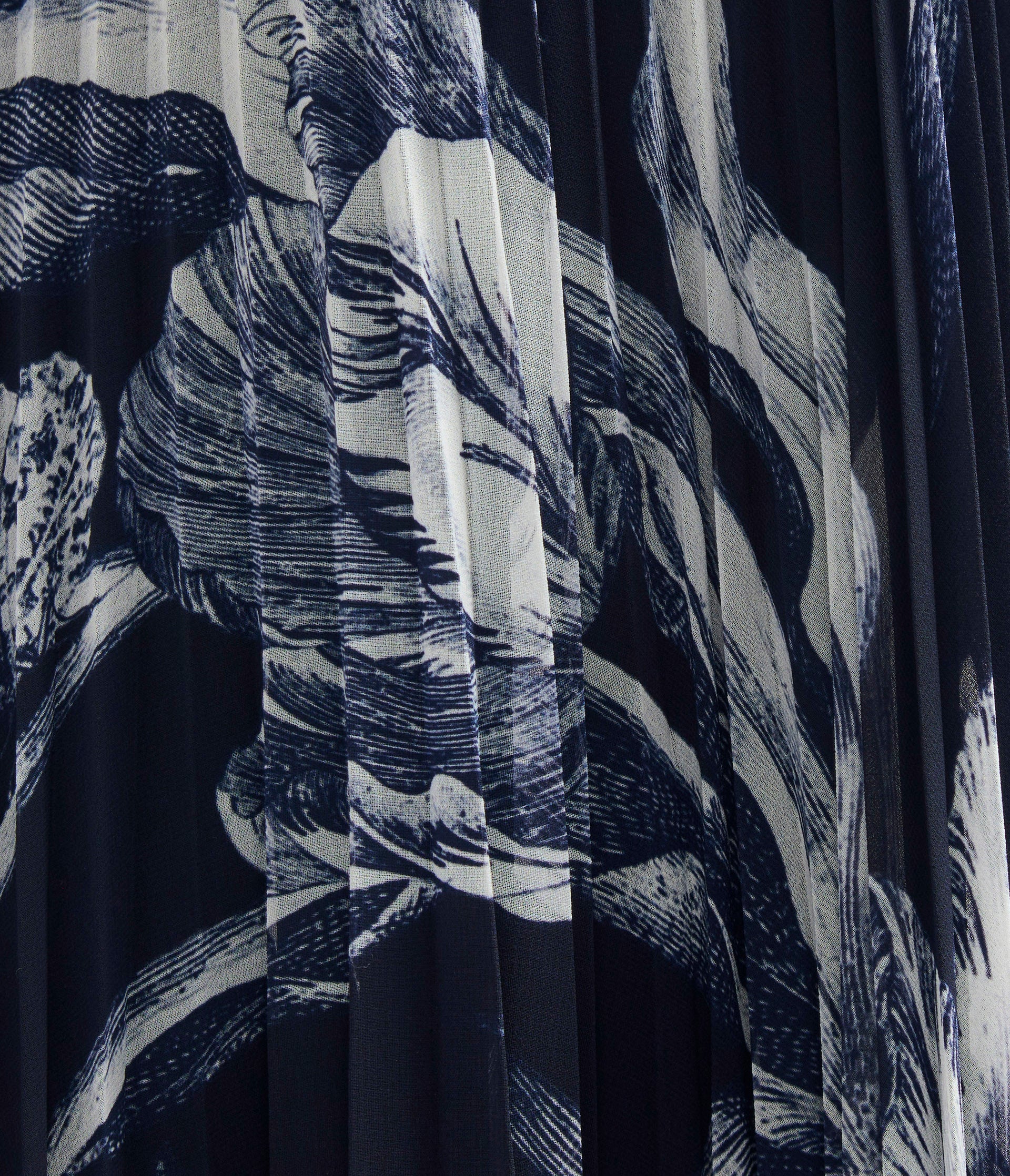 This midnight, ankle-length skirt is made from lightweight voile. Sharp pleats lend the intricate botanical print a blurred effect.