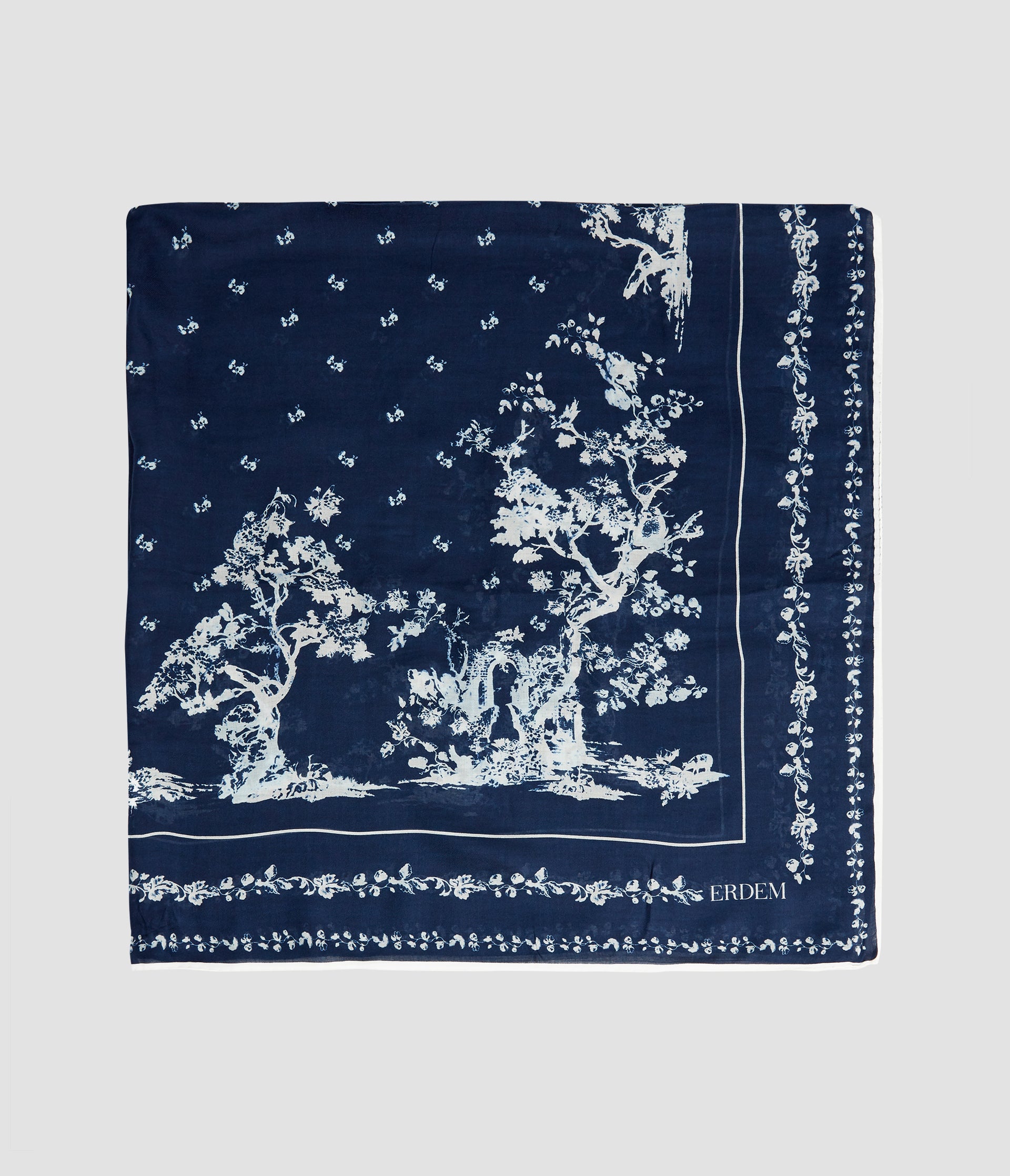 This square scarf is made from a blend of modal and silk. It features a white etching-inspired tree print on a navy ground.