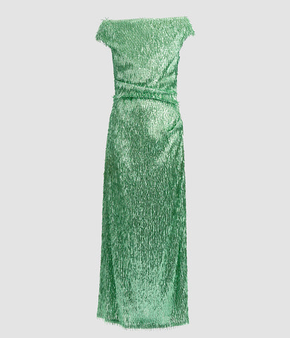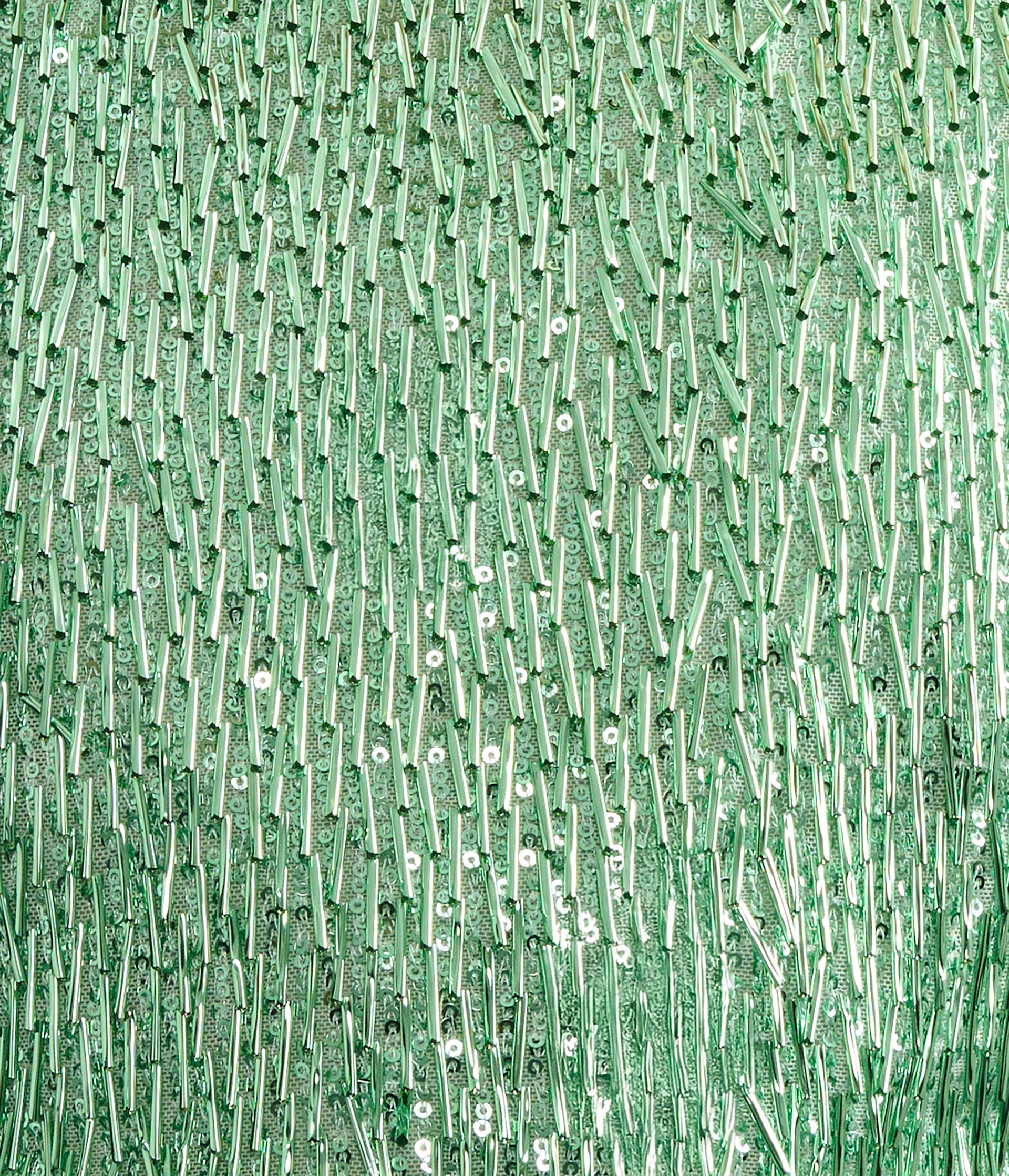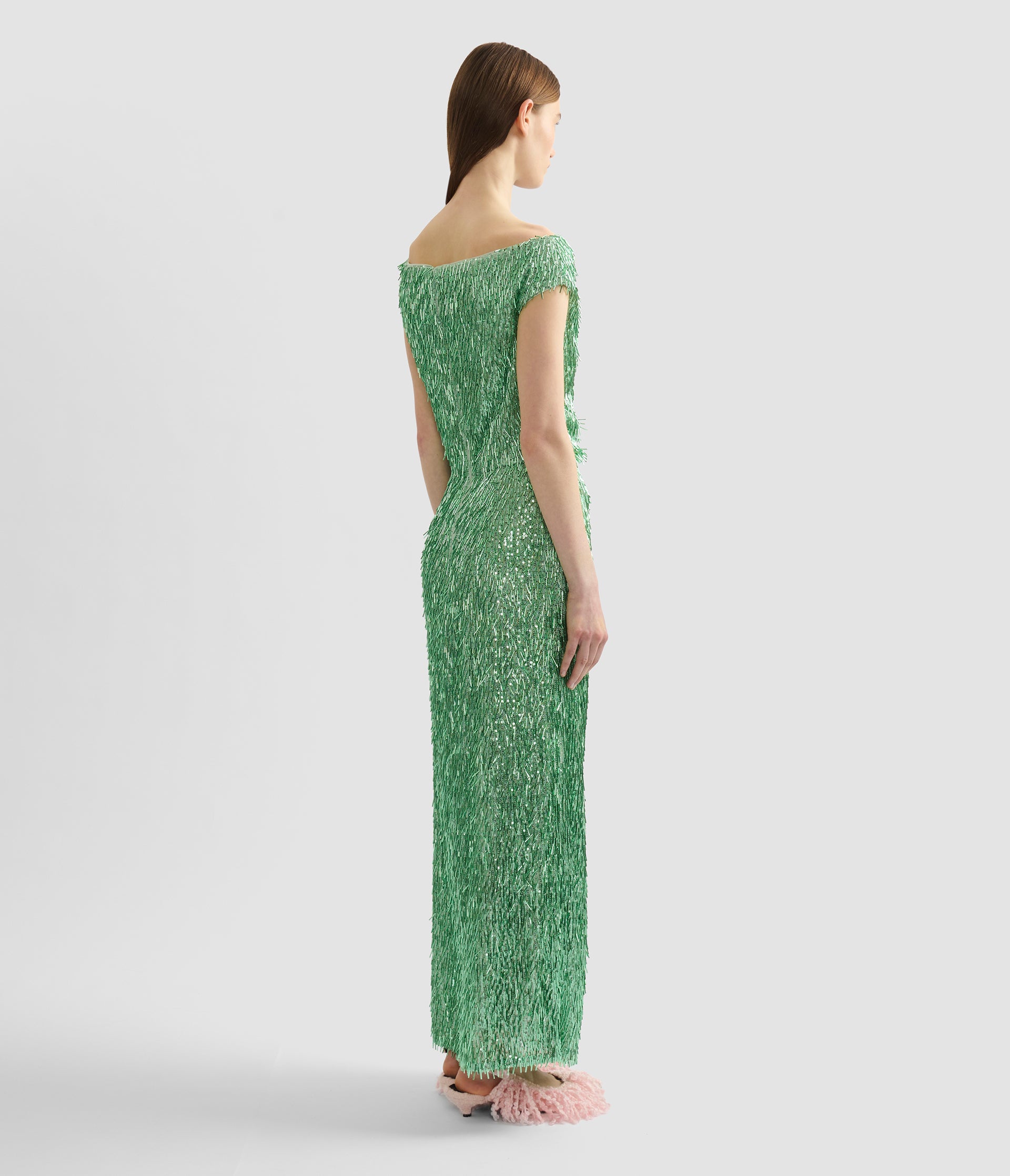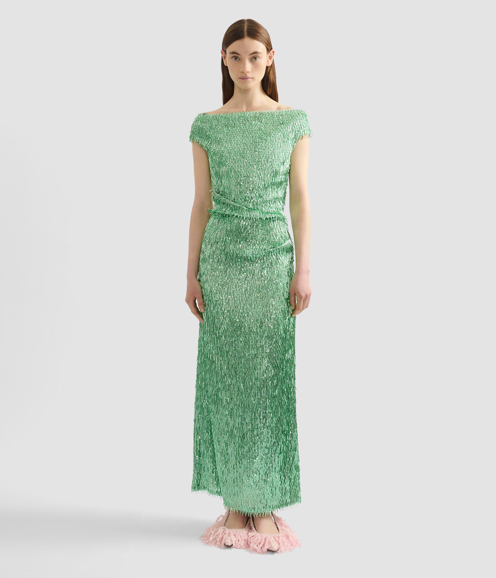 This cocktail dress is covered in spearmint sequins. The slim silhouette falls to an ankle-length hem.