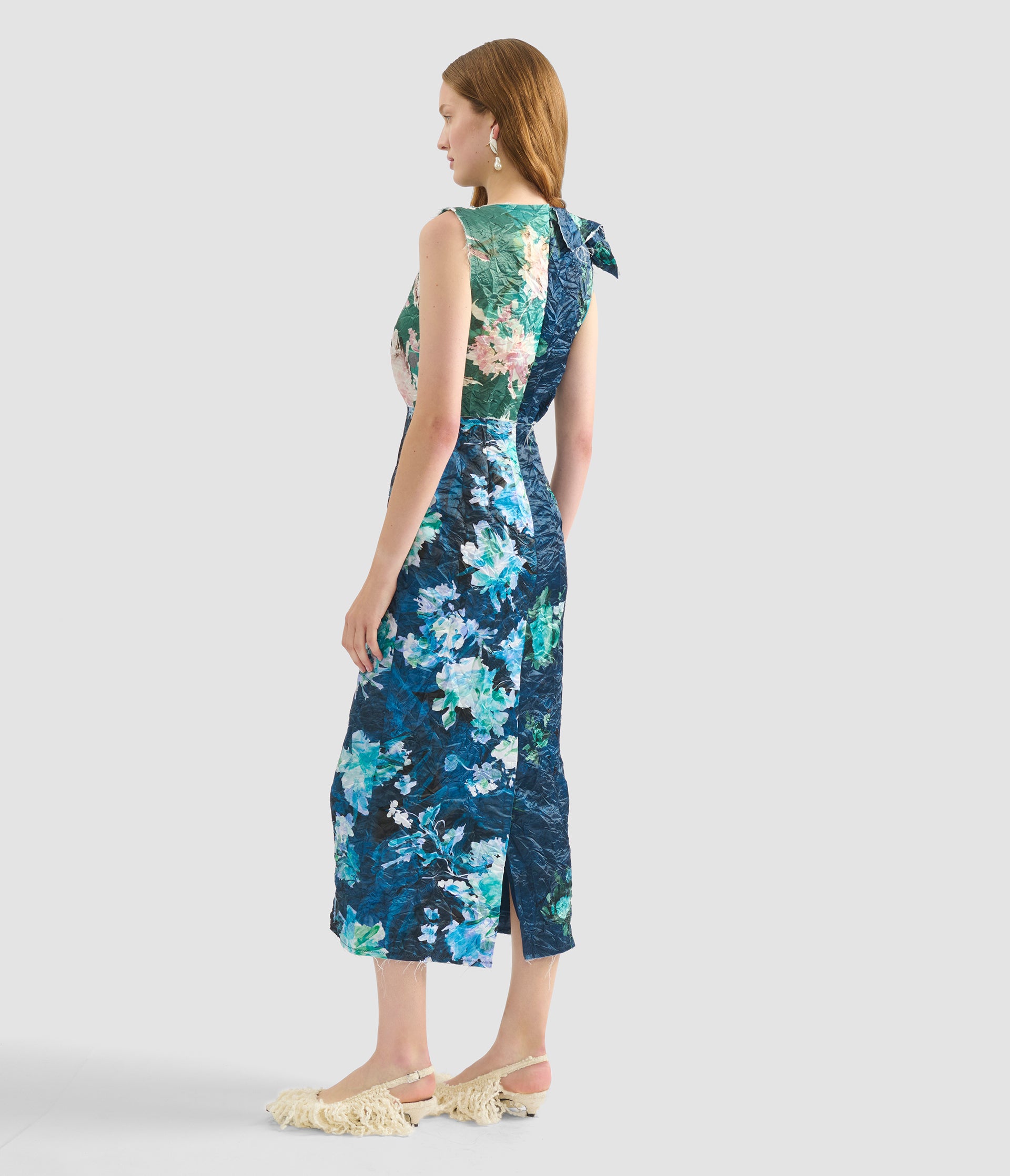 This cocktail dress is crafted from panels of textured satin in various shades of blue and green. It features abstract florals.