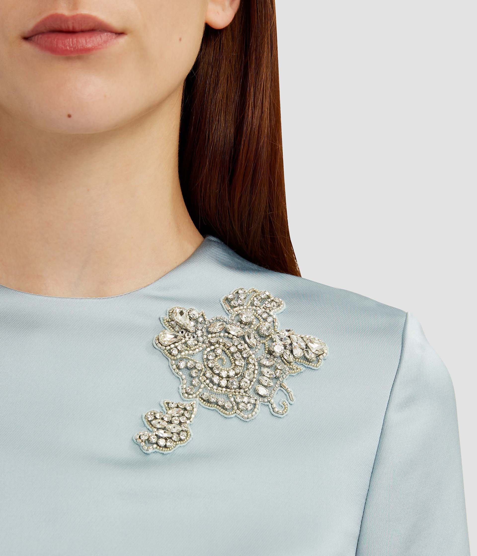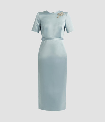 This pencil dress is crafted from cloud-blue heavy satin and is embellished with crystal embroidery. It has a tonal belt at the fitted waist.