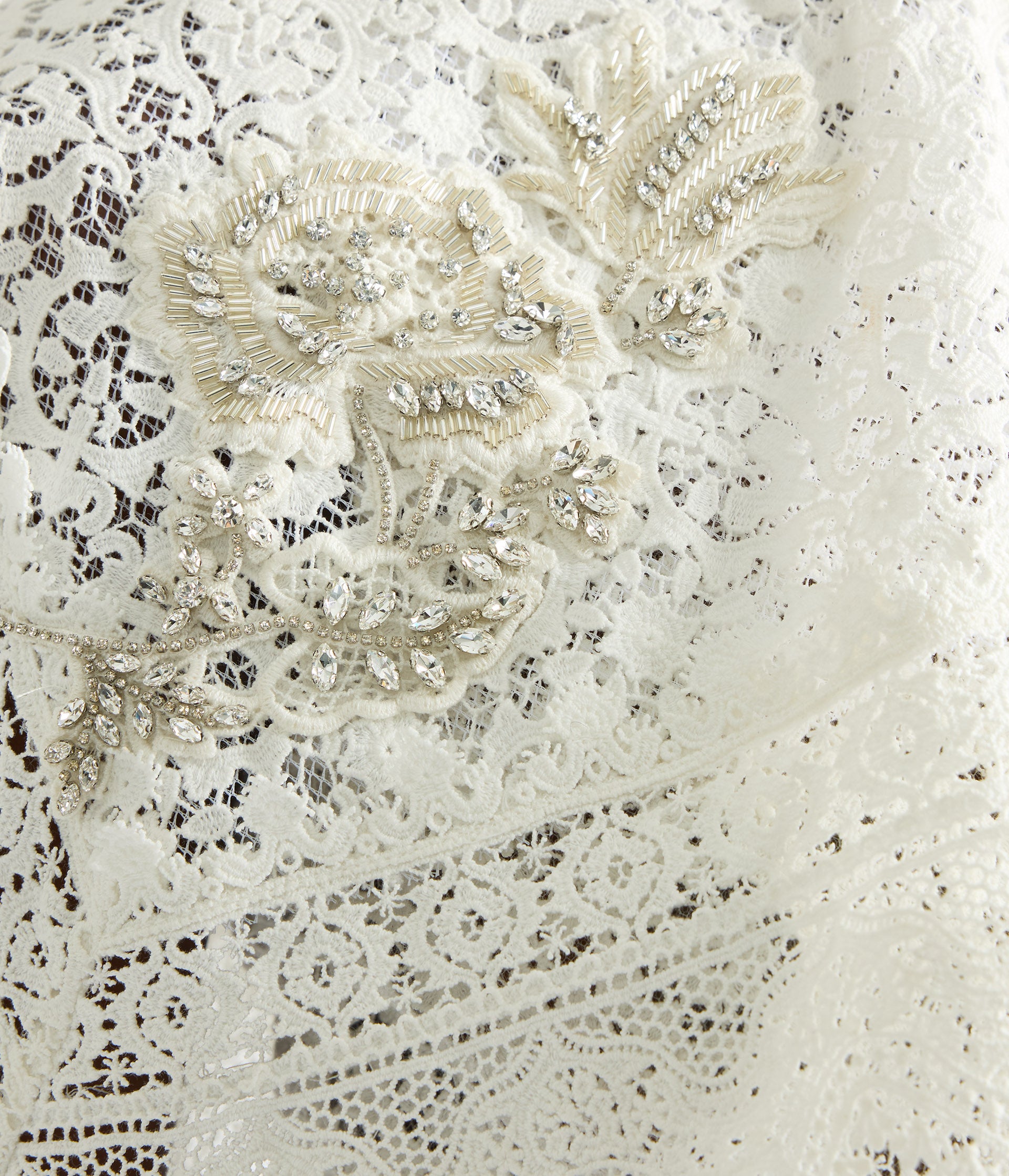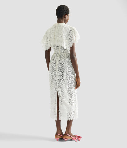 Featuring a geometric floral pattern, this white dress is crafted from cotton guipure which is inspired by 17th century lace. It has a delicate cape-style overlay and is pleated at the waist to create gentle volume at the hips. Crystal embellishment adds further decoration.
