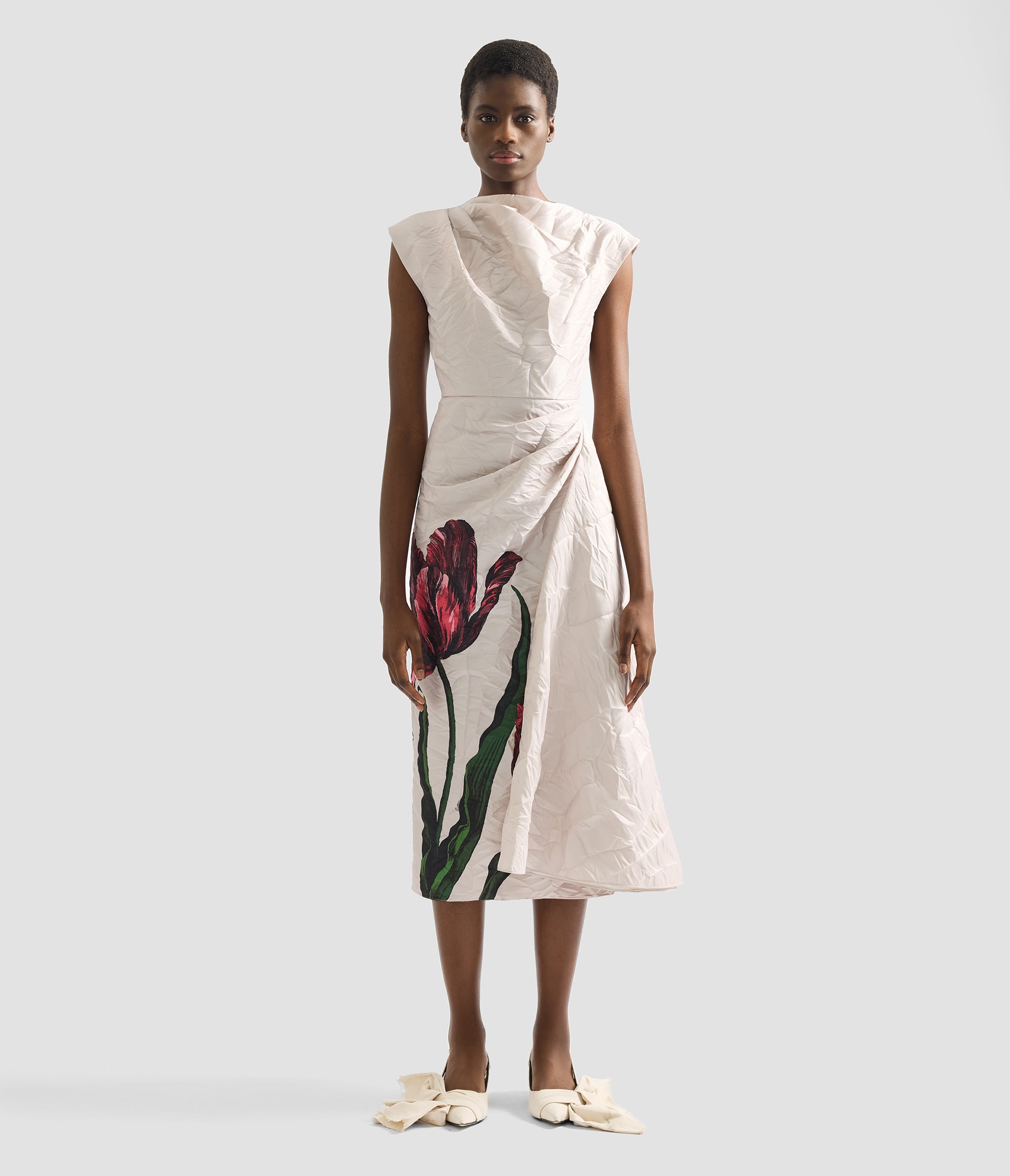 Made from textured satin twill, this cameo pink dress is printed with an oversized etched tulip growing up its side. It is cut with a fitted bodice and loose, draped skirt.