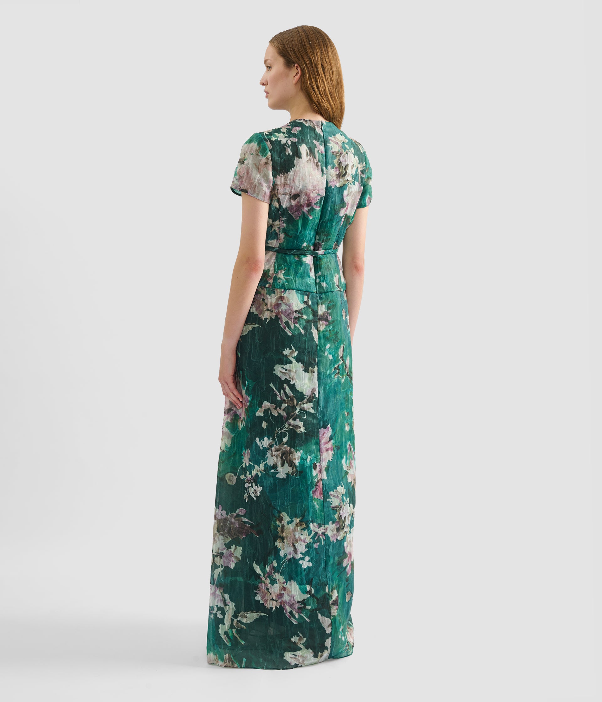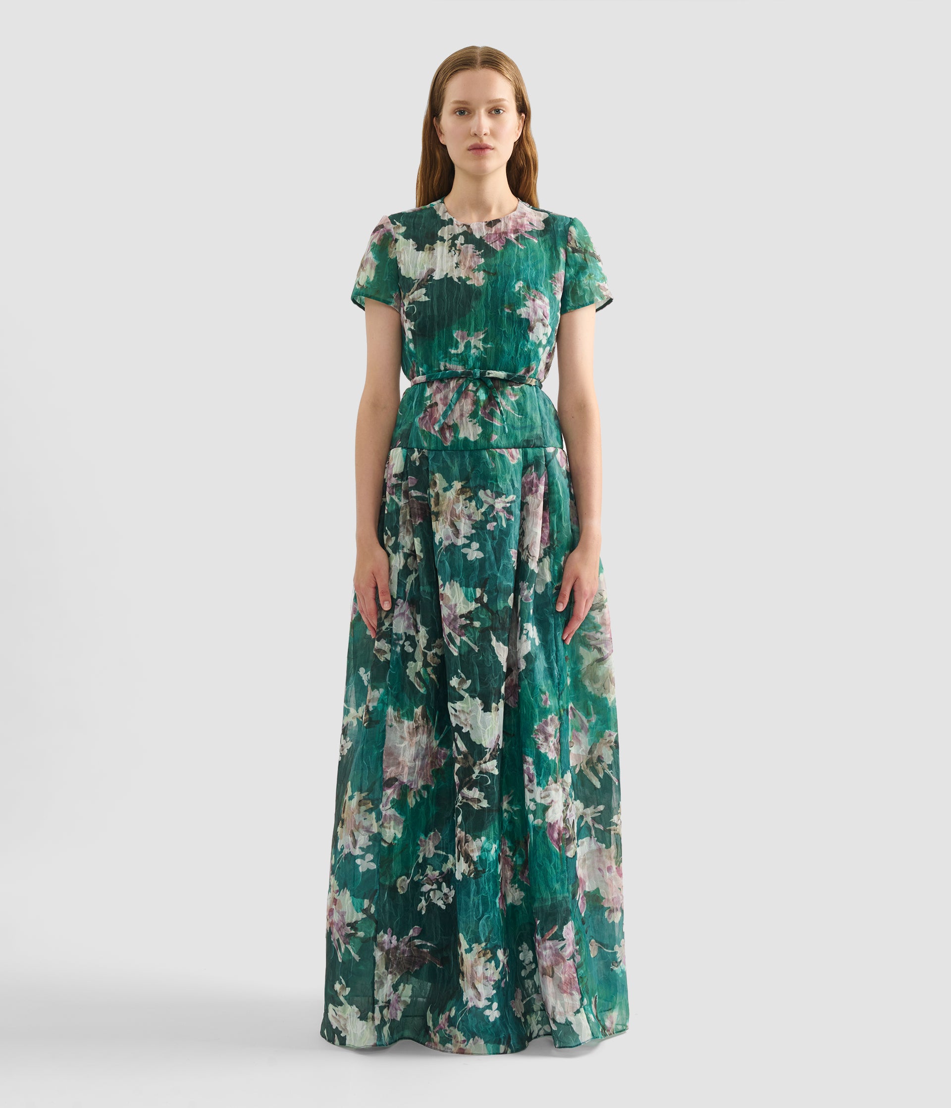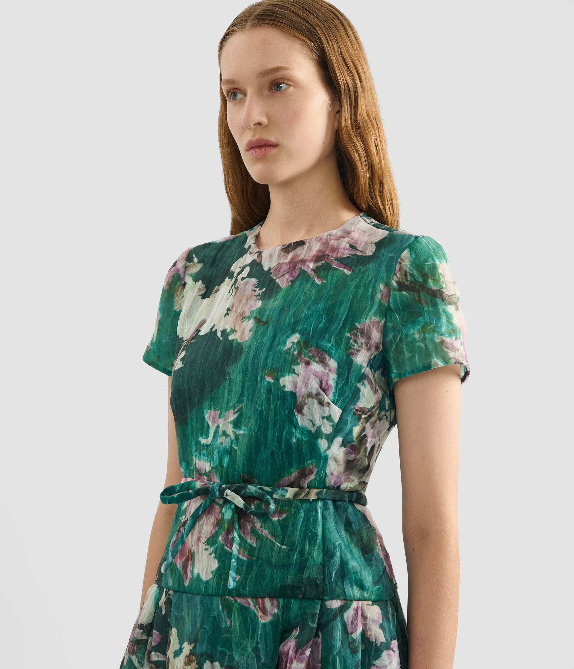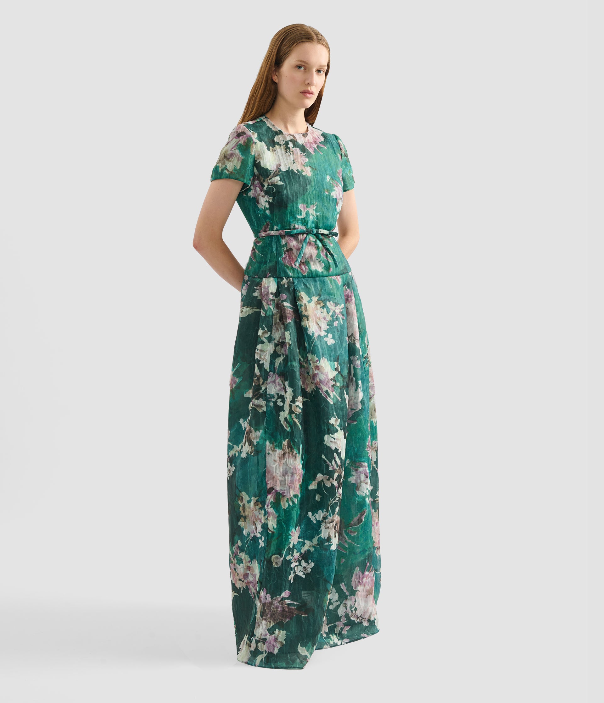 Crafted from sheer crushed organza, this green dress is decorated with painted blooms. It has a bow detail at the waist and a drop waist panel.