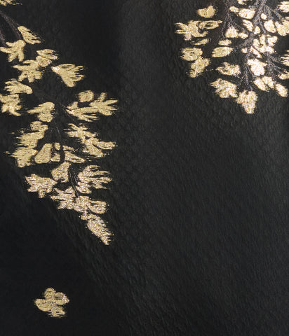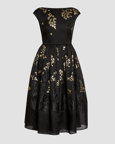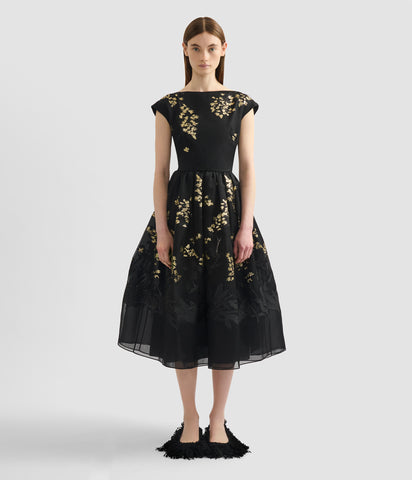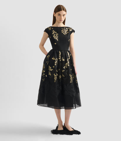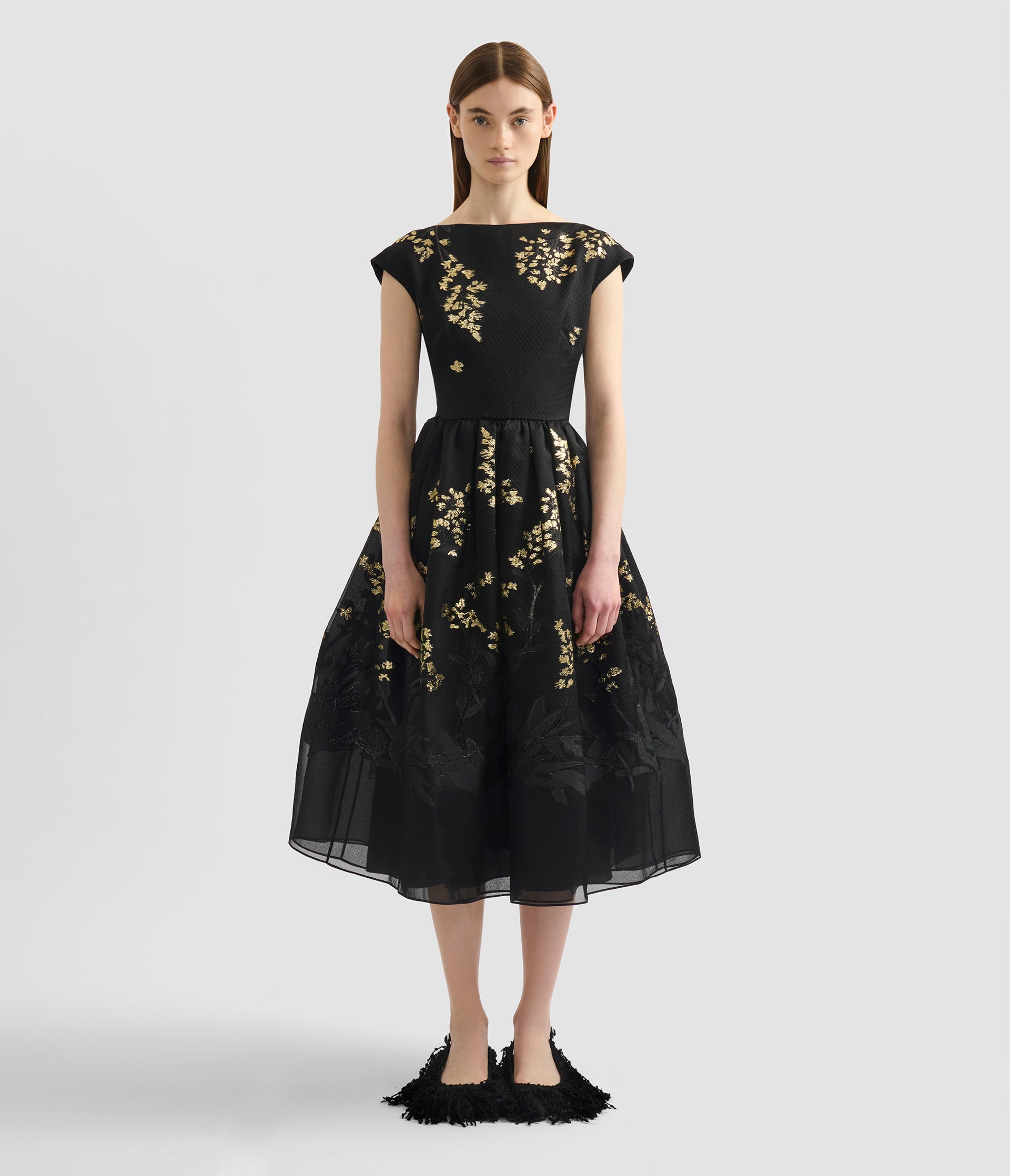 Crafted from textured silk organza, this black dress is decorated with trailing fil coupé florals. The gold motifs are achieved using a mix of matte and shiny thread work.