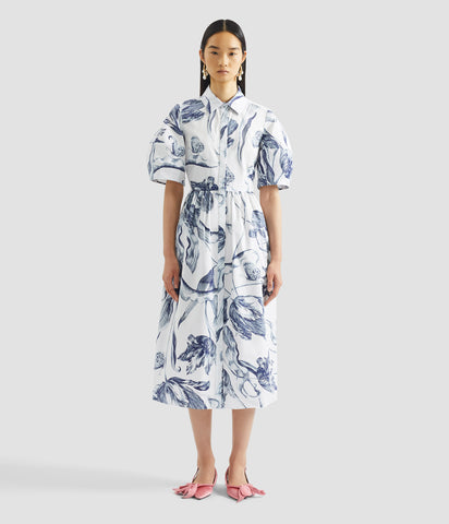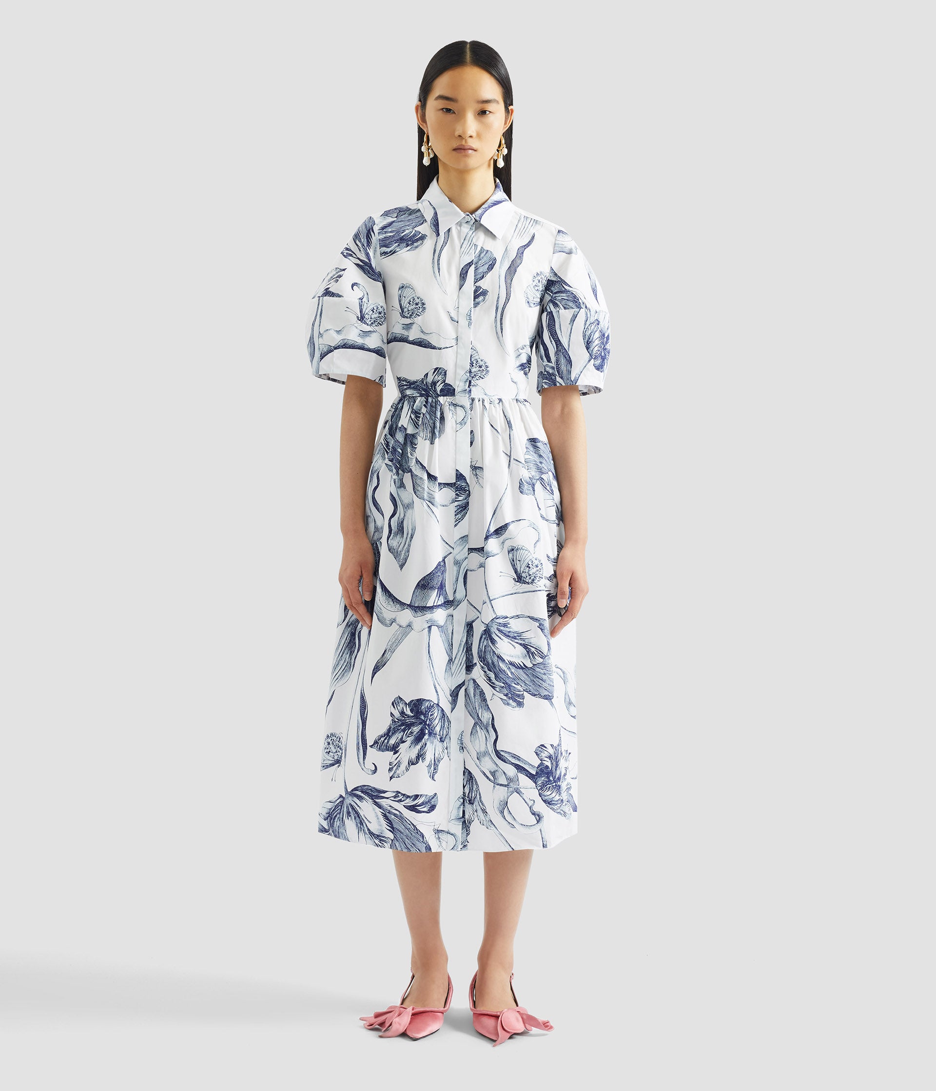Cut from heavy cotton poplin for a full-skirted silhouette, this ivory dress is printed with midnight botanical illustrations inspired by scientific drawings by naturalist Maria Sibylla Merian.