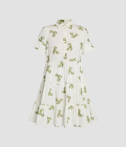 This ivory dress is made from fil coupe jacquard and features raised green foliage. It is shaped for a relaxed fit with a point collar, tiered hem and short sleeves.