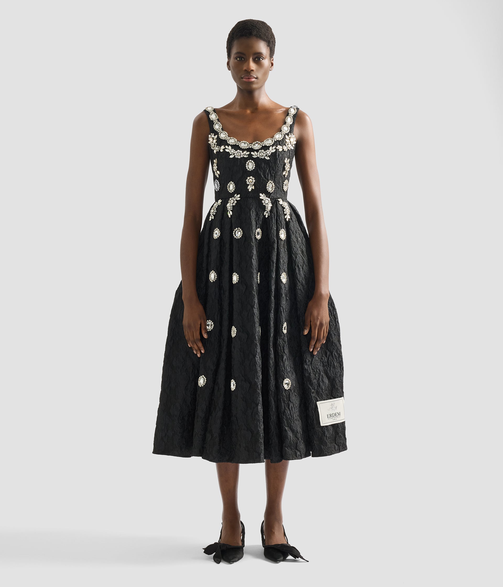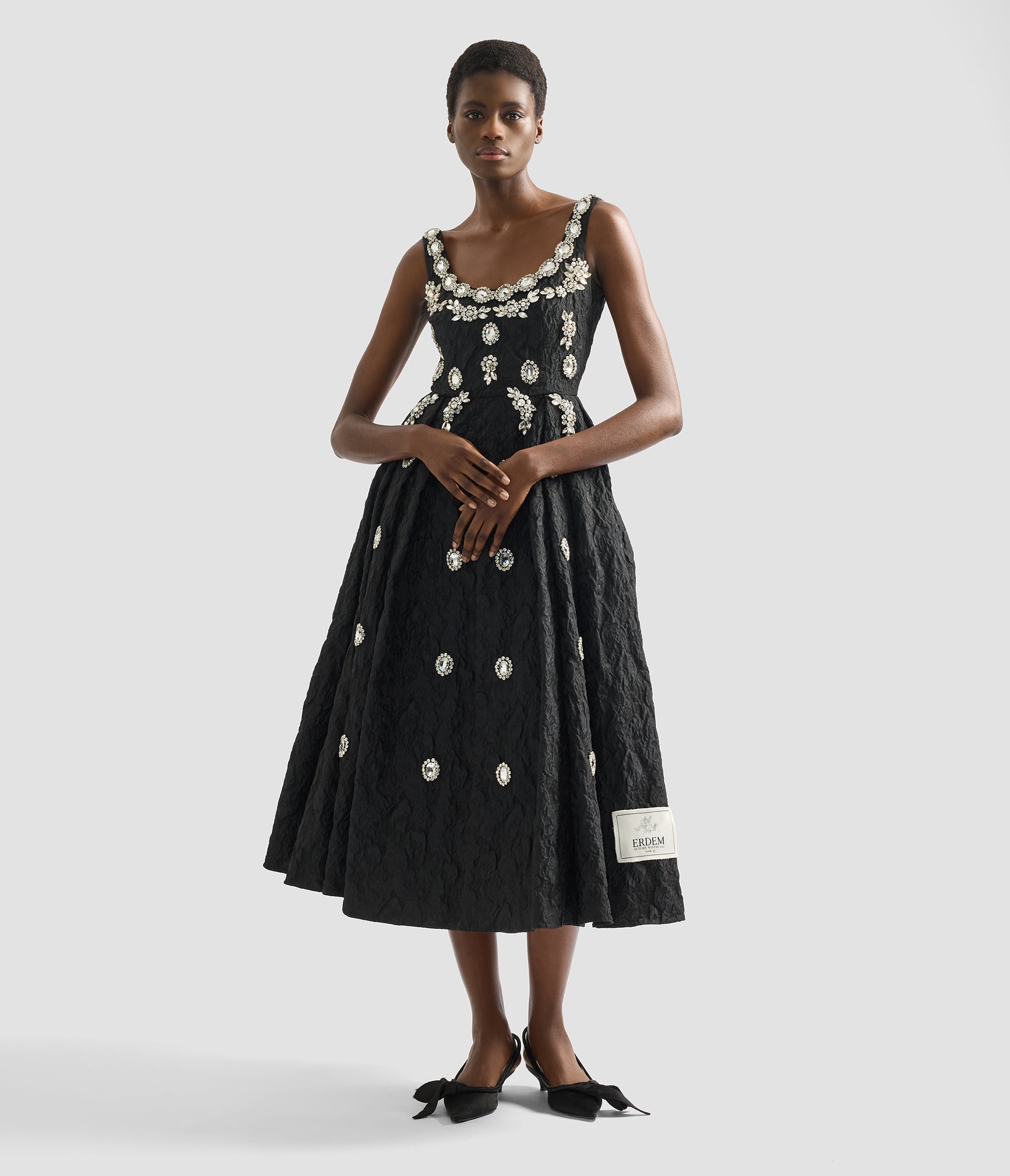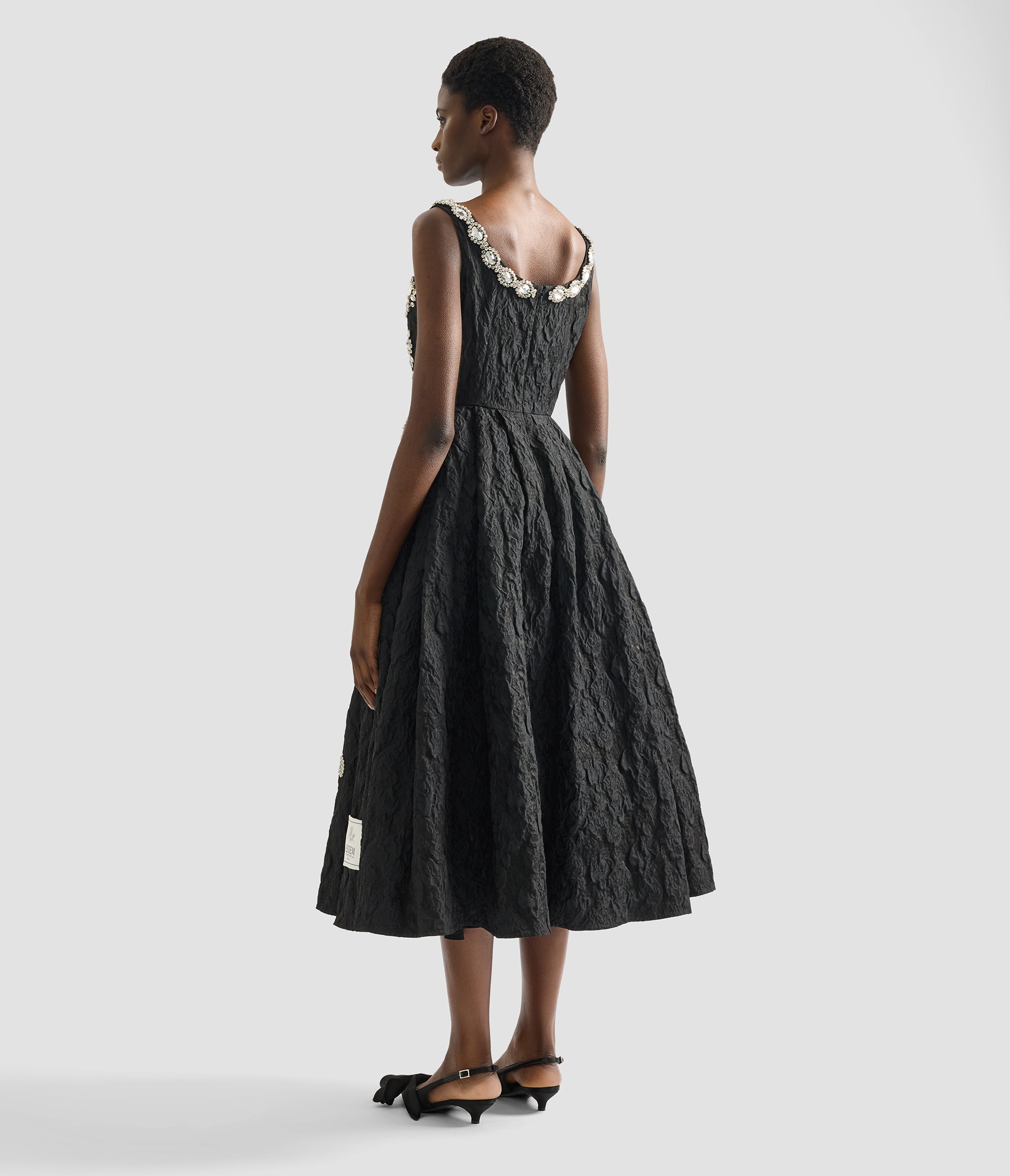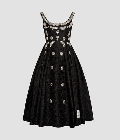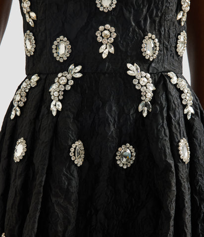 Crafted from black cloque jacquard, this dress is embellished with oversized jewels. The fabric was first seen in ERDEM’s Autumn Winter 2021 collection and now features in an exclusive capsule celebrating the house’s 20th anniversary. Shaped for a fit and flare silhouette, it has a ballet-inspired scooped neckline. A unique label marks the design as a piece from the capsule collection.