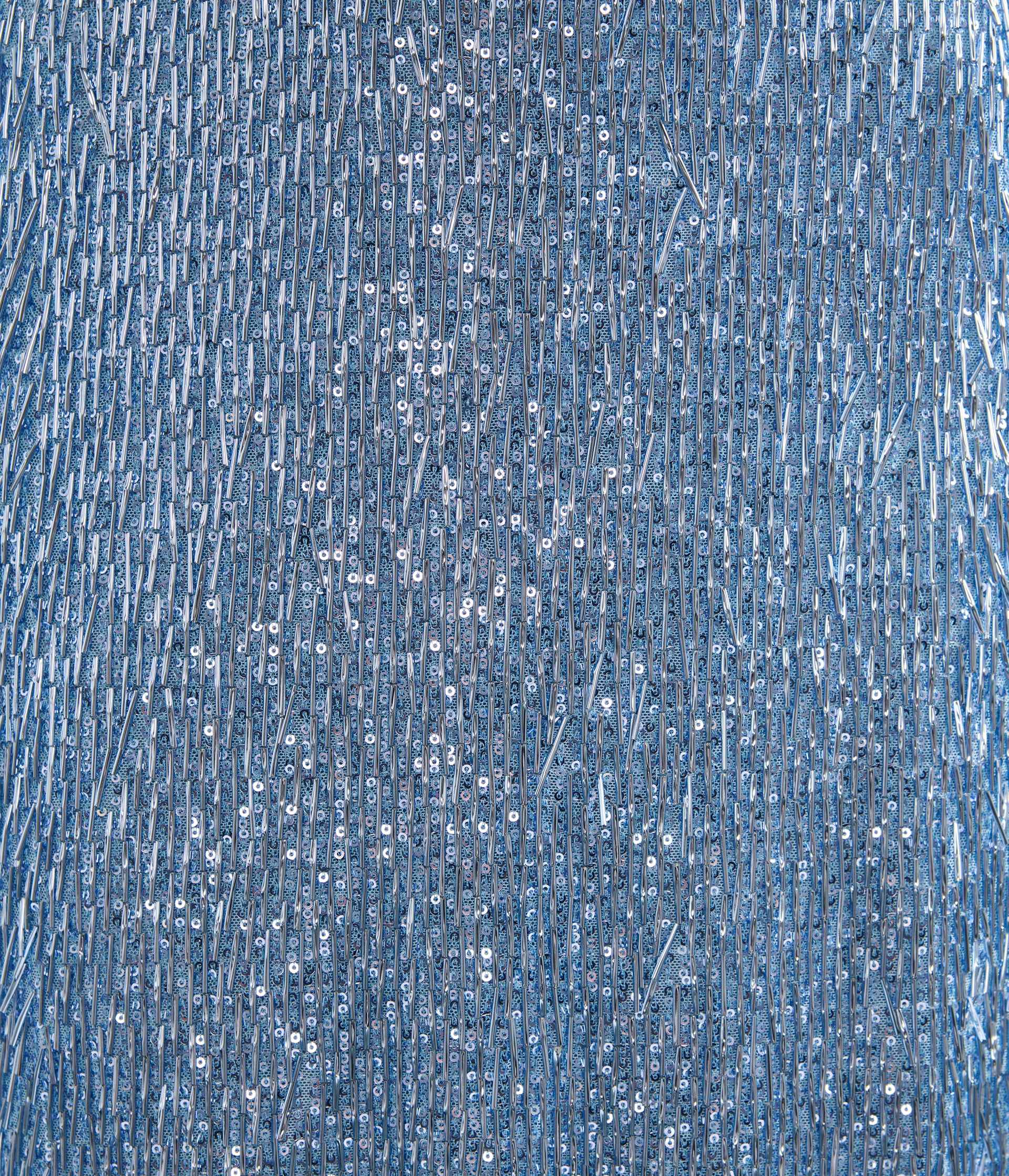 Cut for a slim, V-neck silhouette, this mid-length dress is covered in blue sequins and bugle beads.