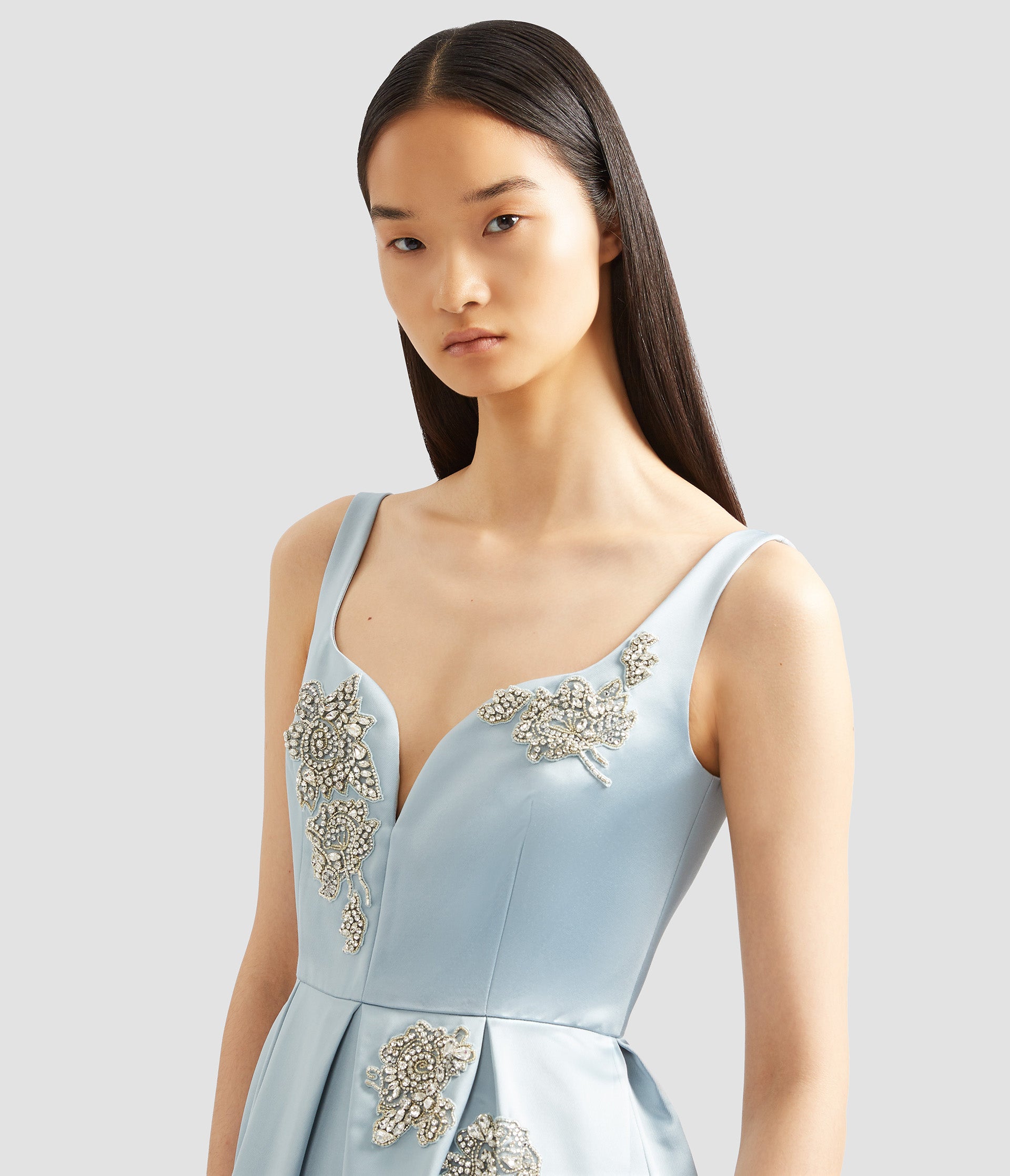 This cloud-blue heavy satin cocktail dress has an exaggerated sweetheart neckline and is embroidered with crystal appliqués.