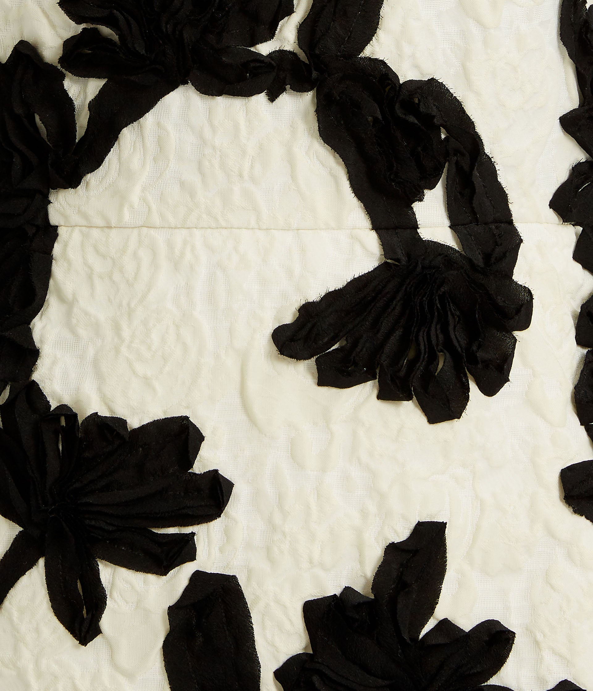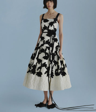 This cocktail dress is crafted from white cloque jacquard with hand embroidered floral motifs made from black silk ribbon. It has an exposed bra detail and a full skirt.