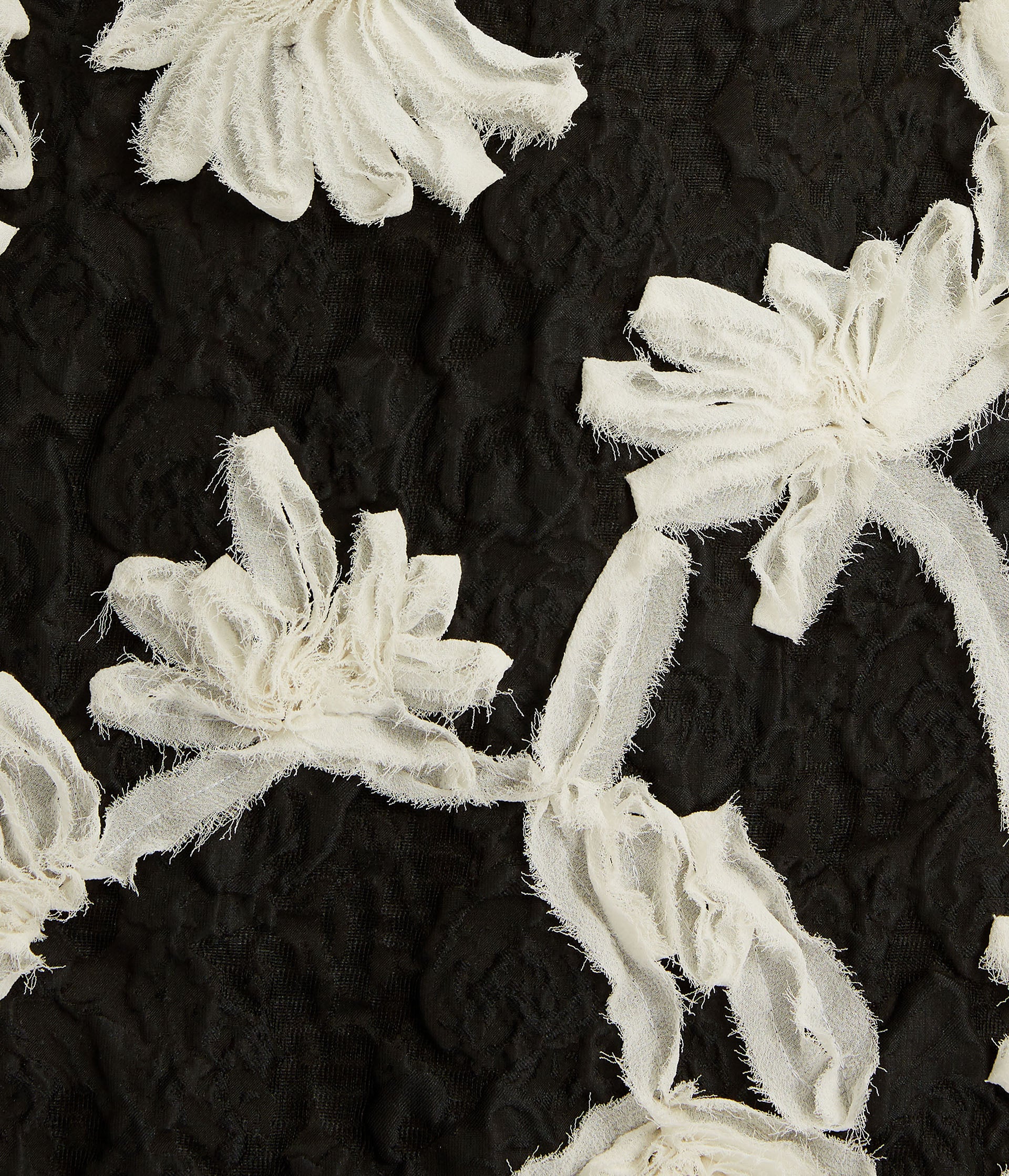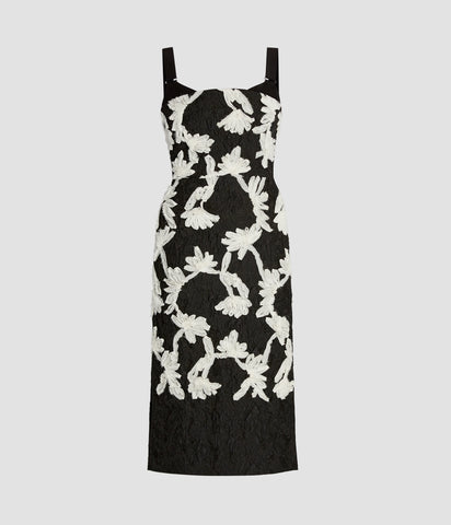This black pencil dress is crafted from cloque jacquard with hand embroidered floral motifs made from white silk ribbon.