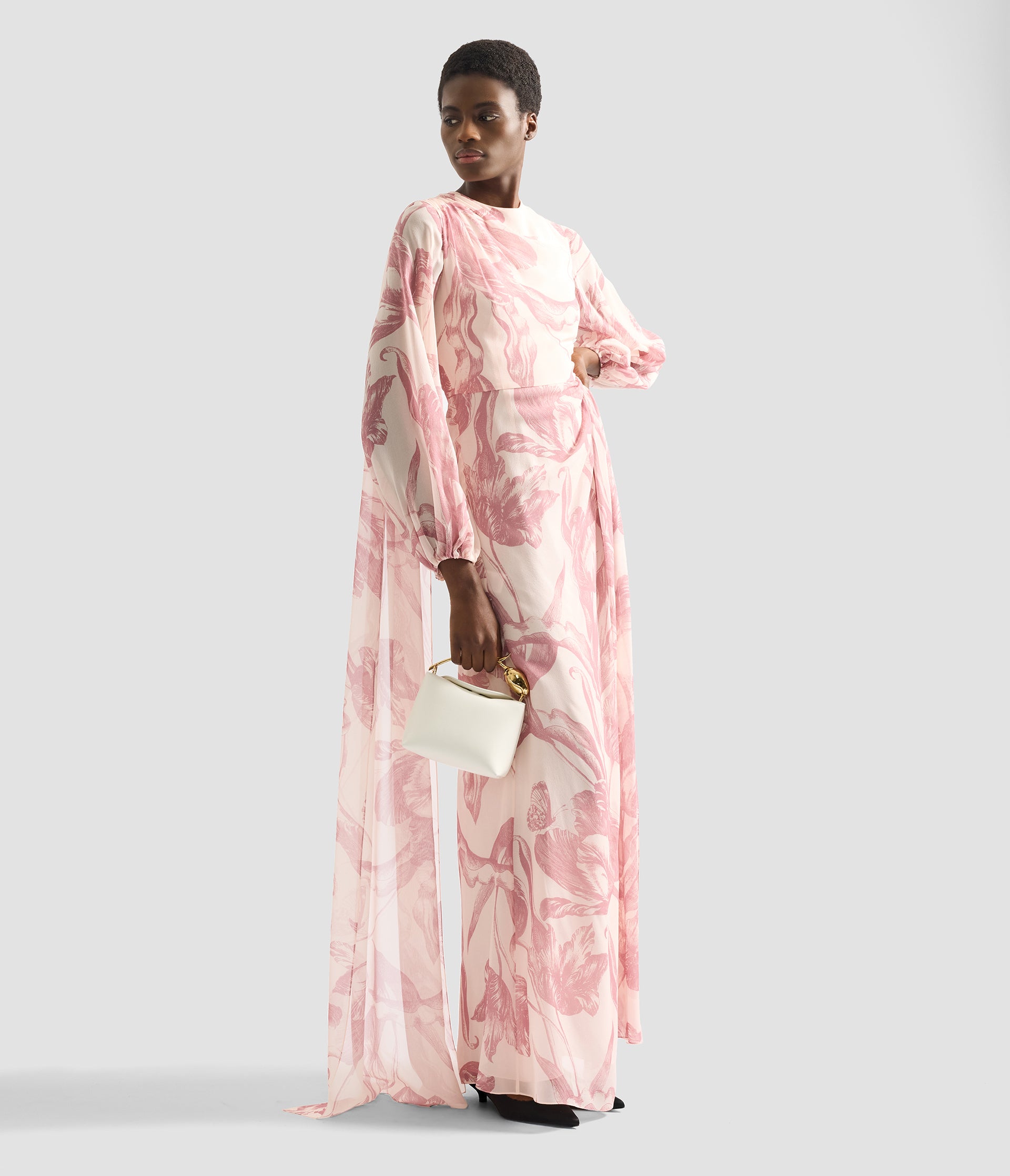Crafted from lightweight silk voile, this cameo pink gown is decorated with an engraving-style tulip print. It has blouson sleeves and a long, flowing cape-style drape.