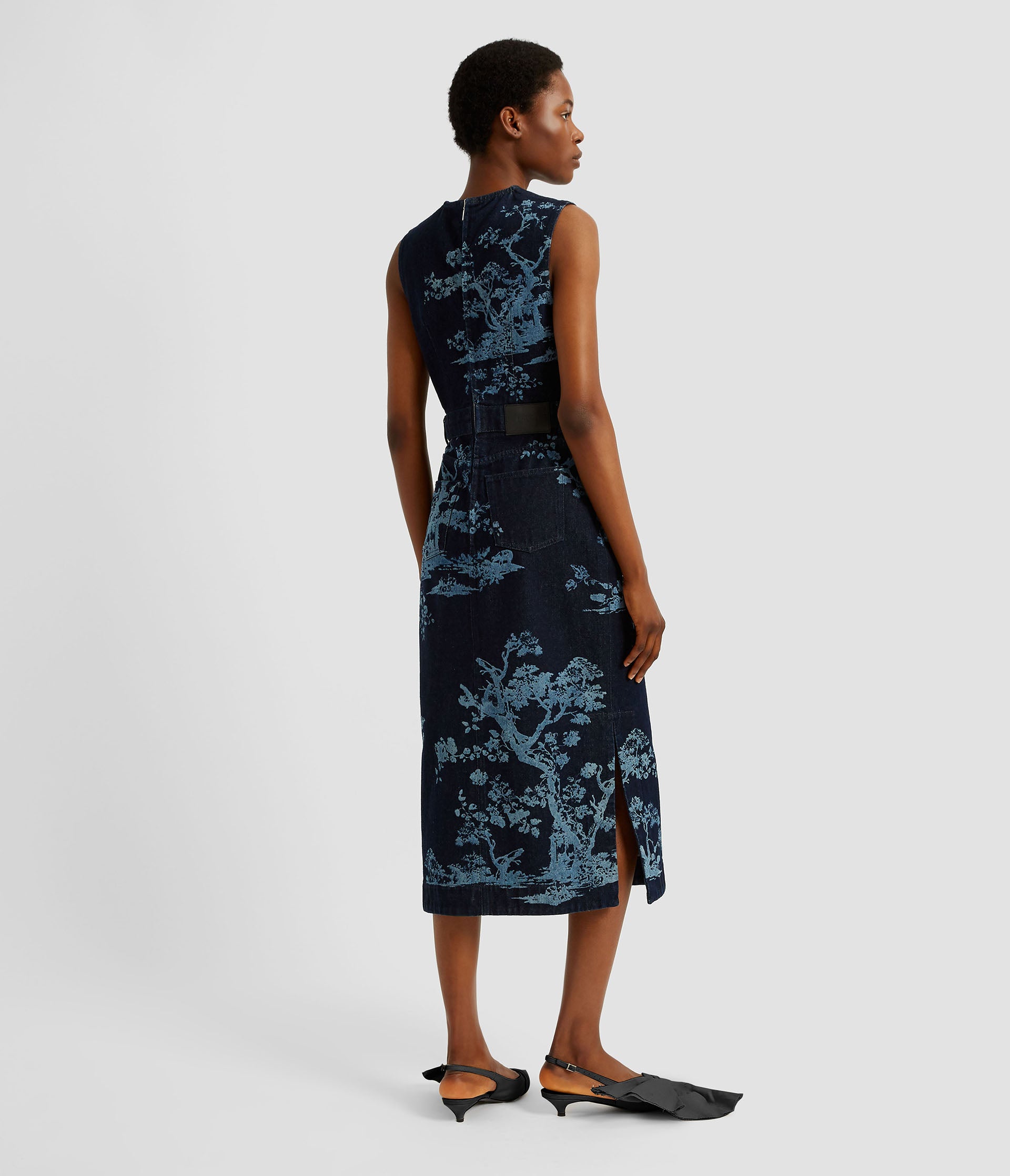 This sleeveless denim pencil dress features an etching-inspired trees design. It features a crew neckline and mid-length hem with a vent on either side.